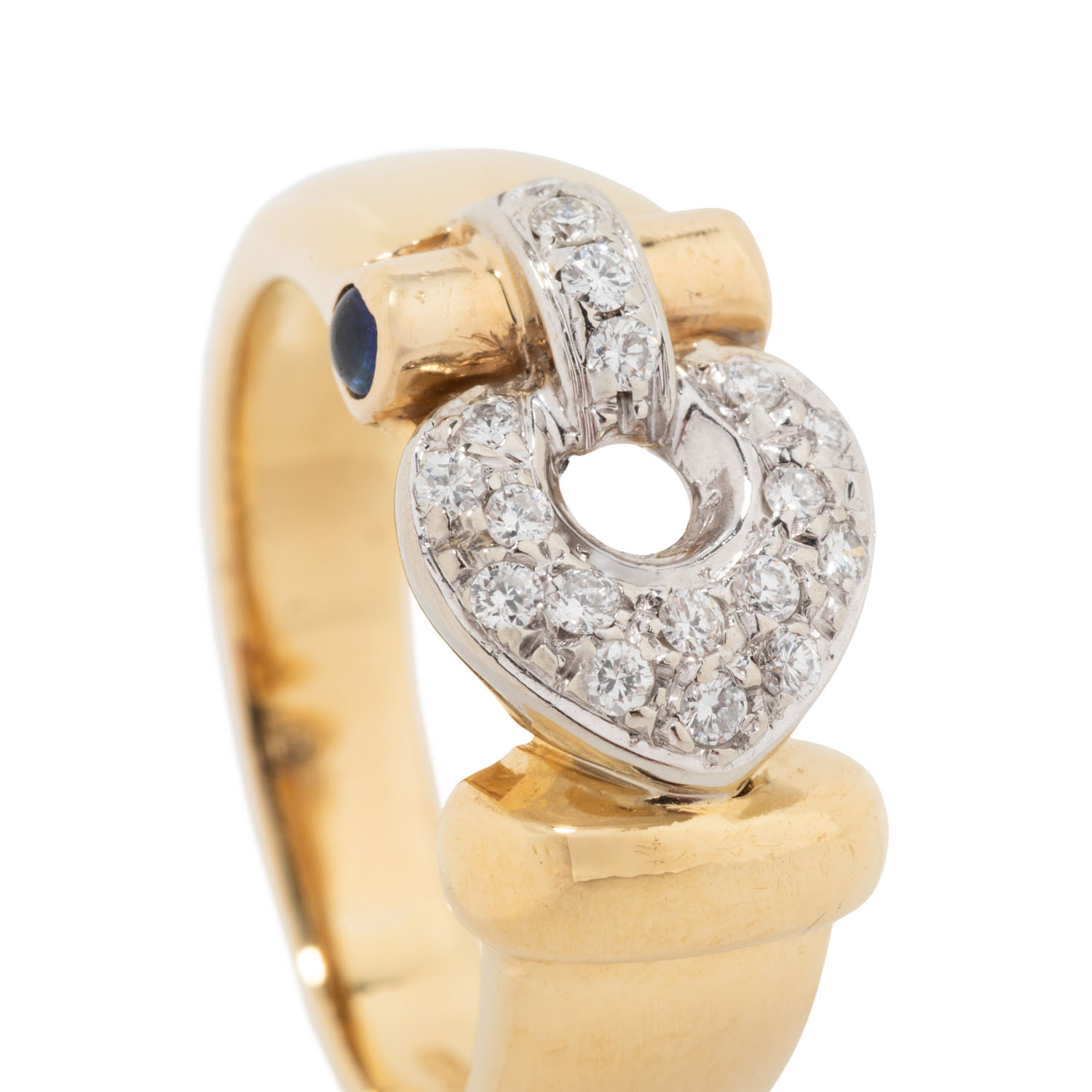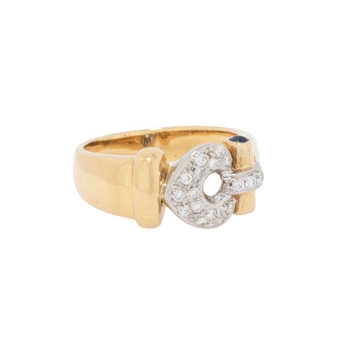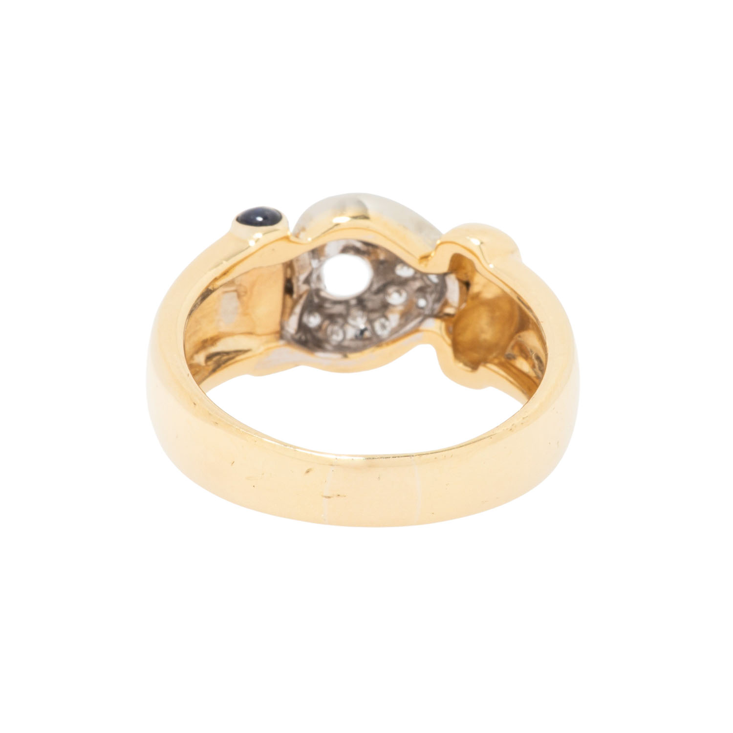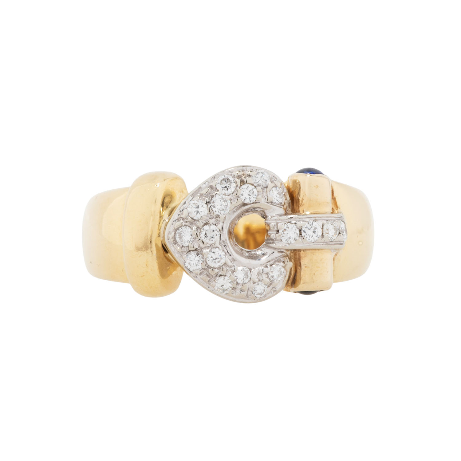 18 Brillanten, ges. ca. 0,18 ct, gute Farbe und Reinheit, 2 runde Saphircabochons, D: 2 mm, GG/WG 18K, 7,9 g, RW: 56, 20./21. Jh., leichte Tragespuren.