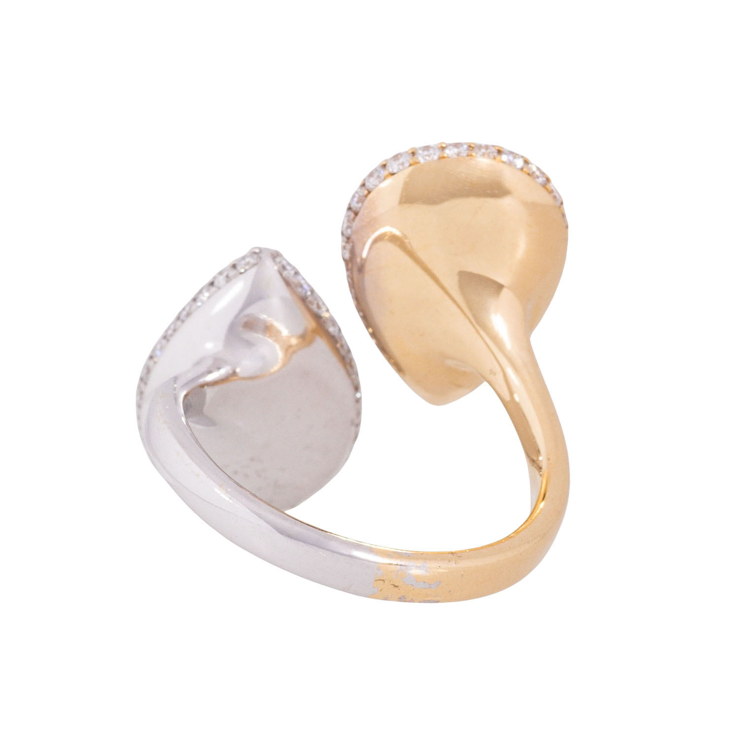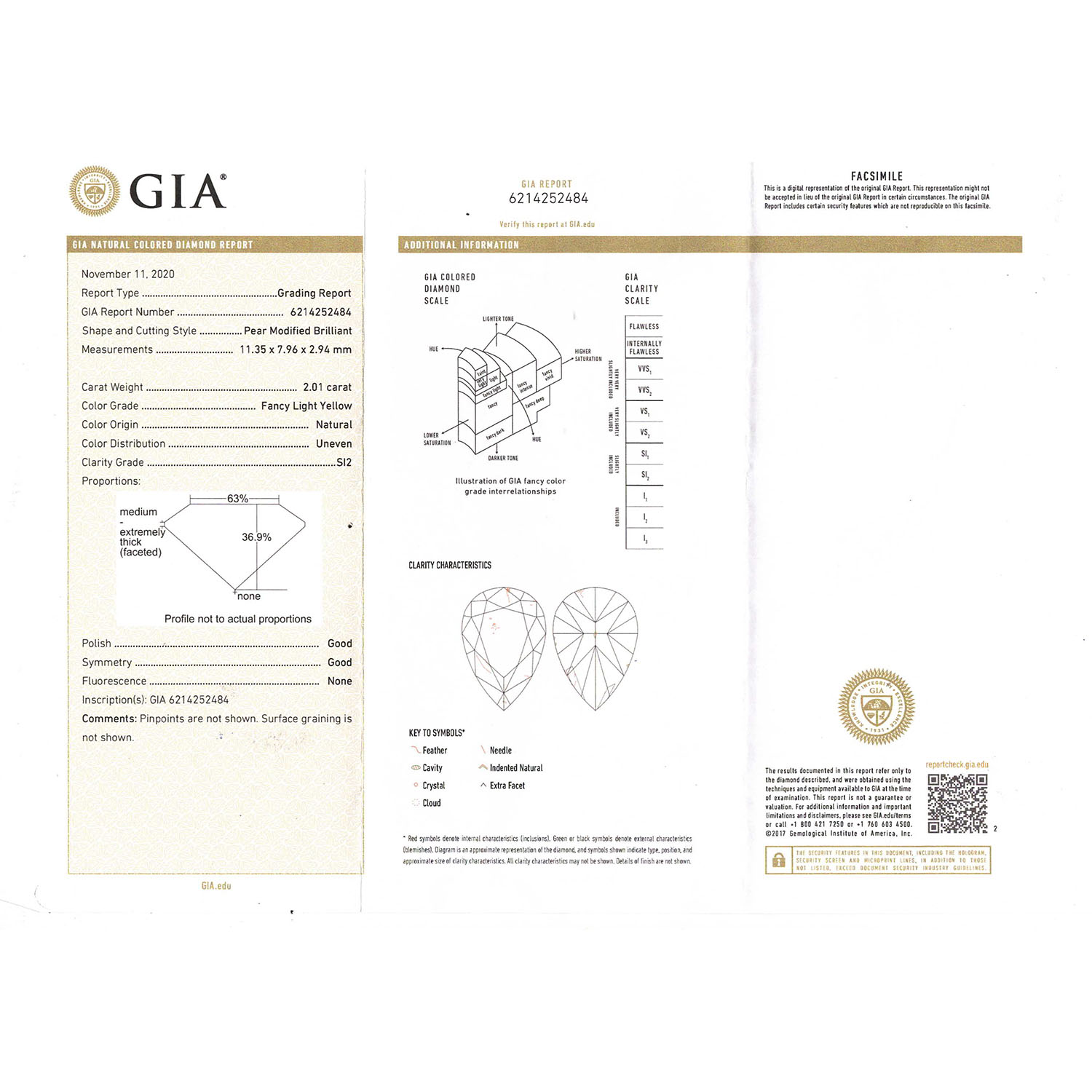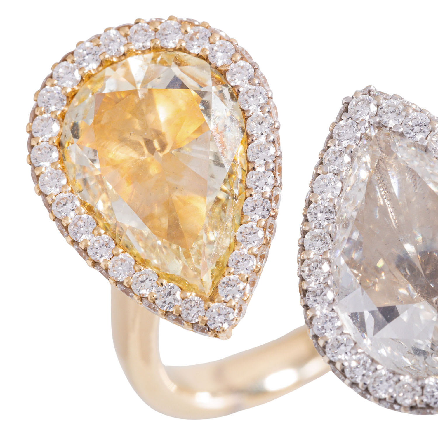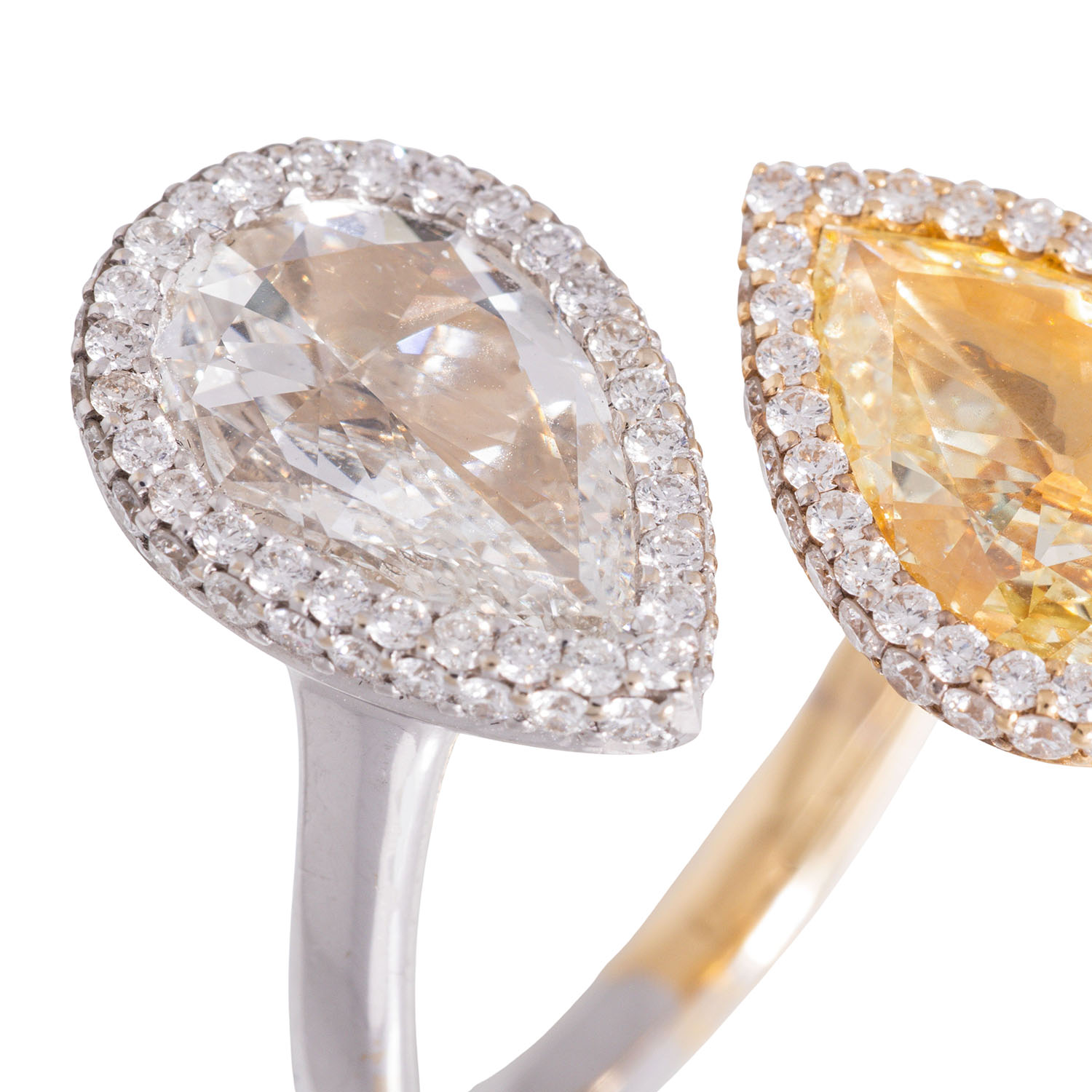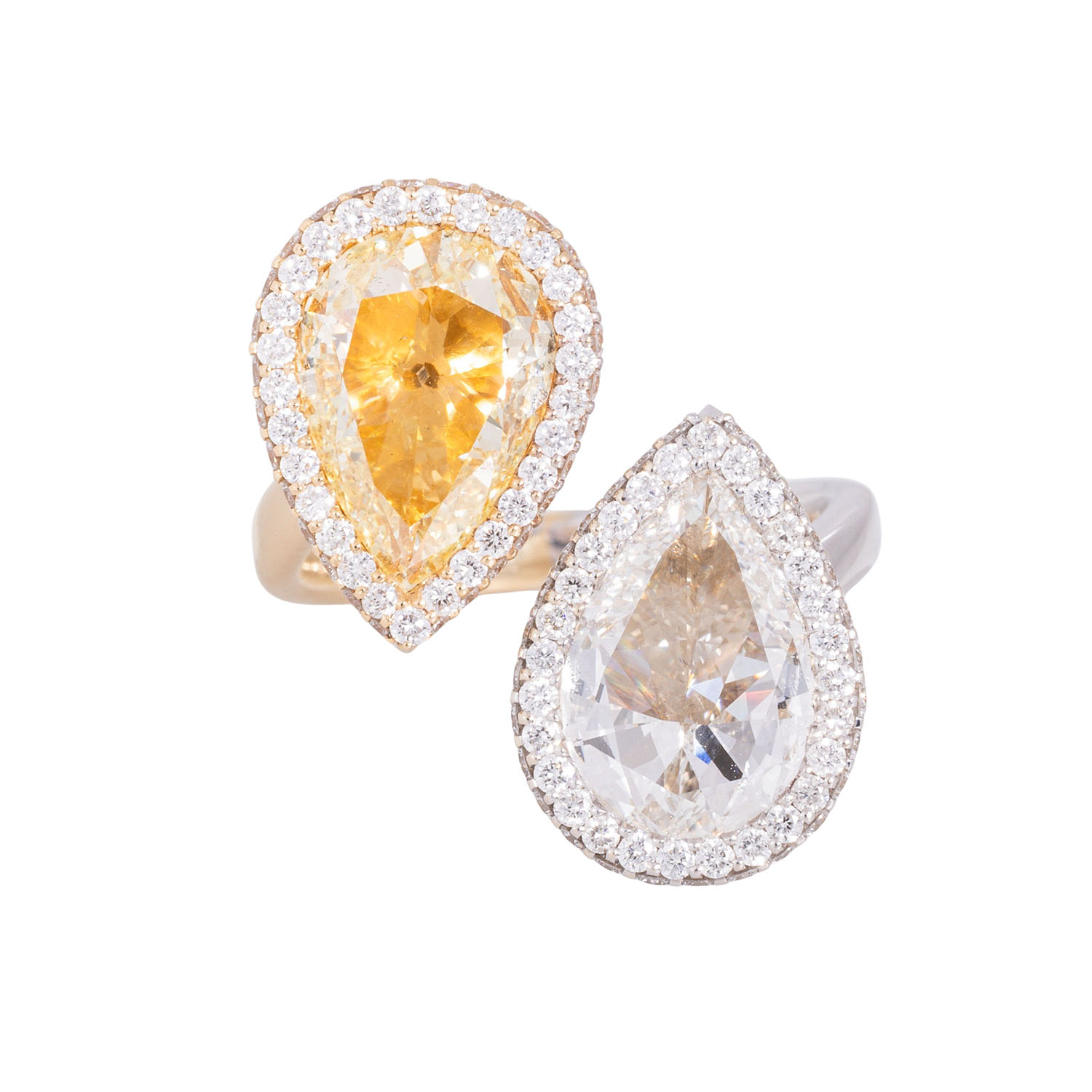 umgeben von kleinen Brillanten, zus. ca. 0,95 ct, FW(G)/VSI, 1 x Diamant 1,51 ct, FW (G)/VVS2, 1 x 2,01ct, fancy ligth yellow /SI1, WG/GG 18K, 8,6 g, RW: 53, 21. Jh., neuwertig. GIA-Zertifikatskopien: 6502086131 und 6214252484 anbei.