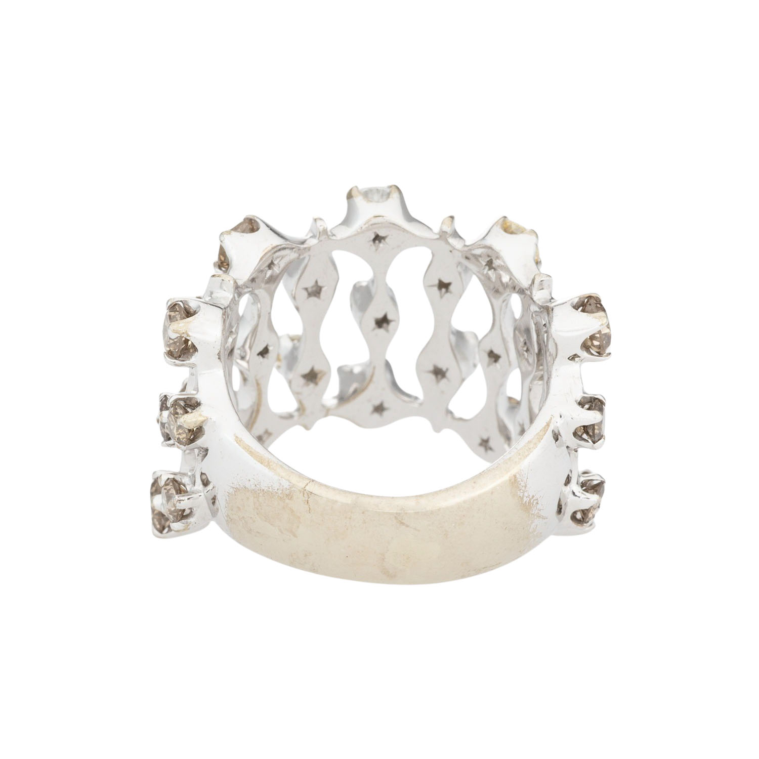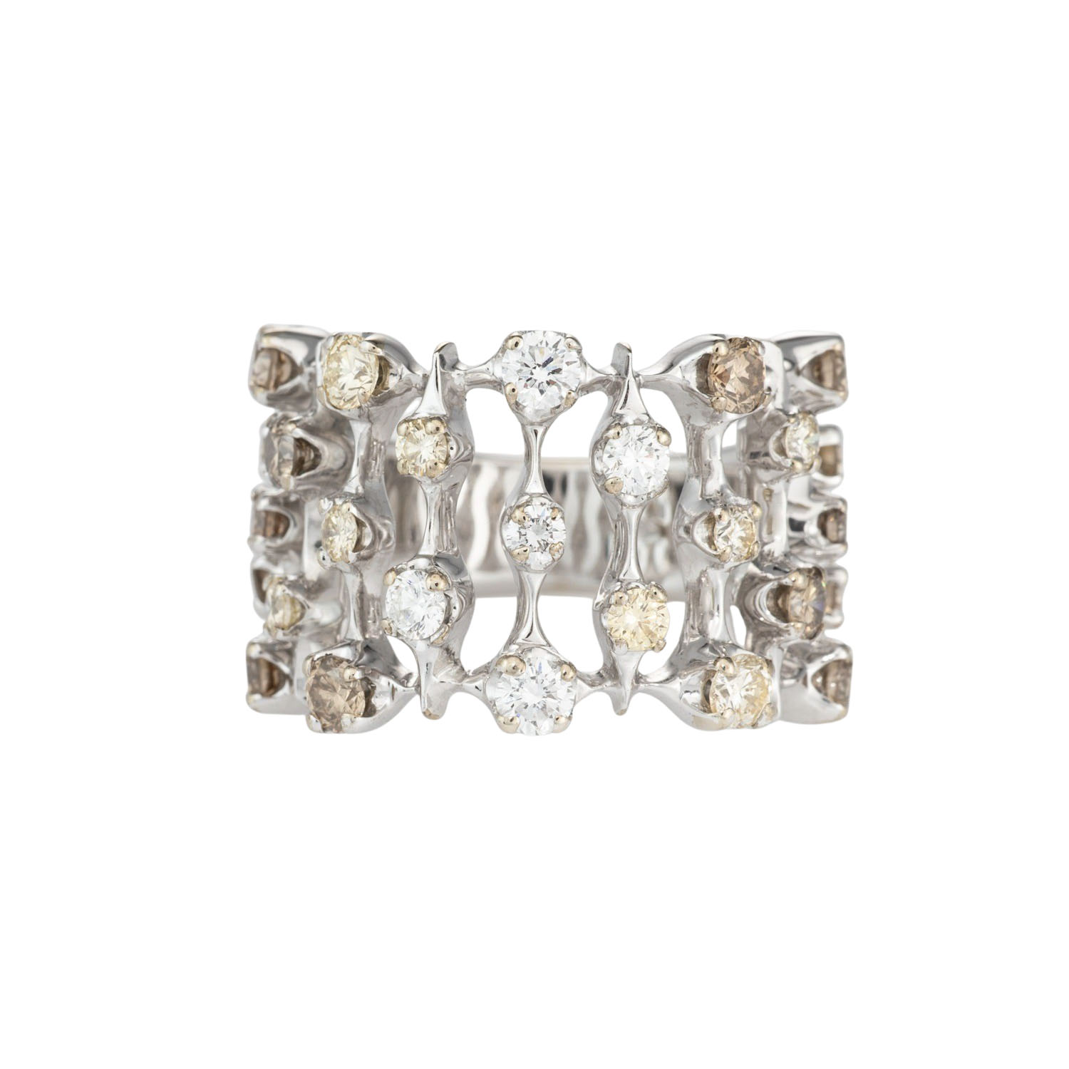 zus. ca. 1,9 ct, davon ca. 0,38 ct WEISS (H)/VS und ca. 1,52 ct, fancy light - dark brown (C1-C7)/SI-P, WG 18K, 11,7 g, RW: 51, B: ca. 5,6 - 15,8 mm, 21. Jh., Tragespuren, 2 Krappen besch..