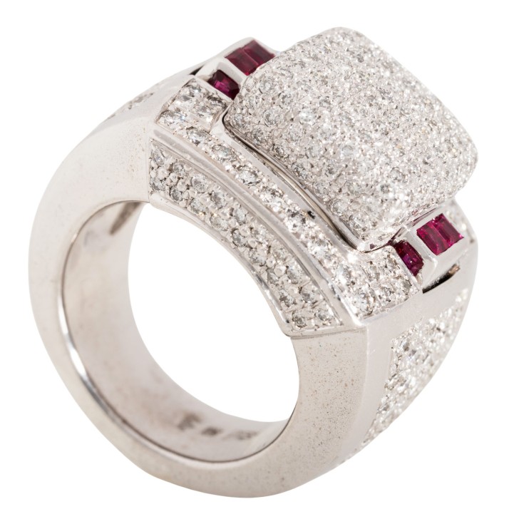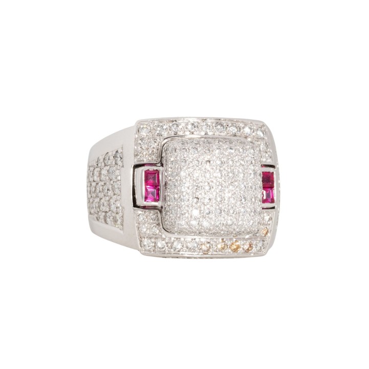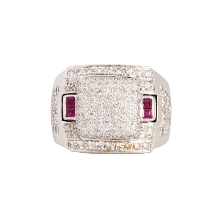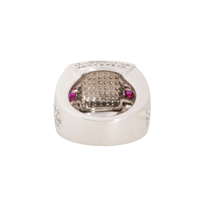 zus. ca. 3 ct, guter bis hoher Farb- und Reinheitsgrad, ca. 3-4 Steine getönt, Rubine ohne Anzeichen von Hitzebehandlung, WG 18K, 42,4 g, RW: 57, leichte Tragespuren.