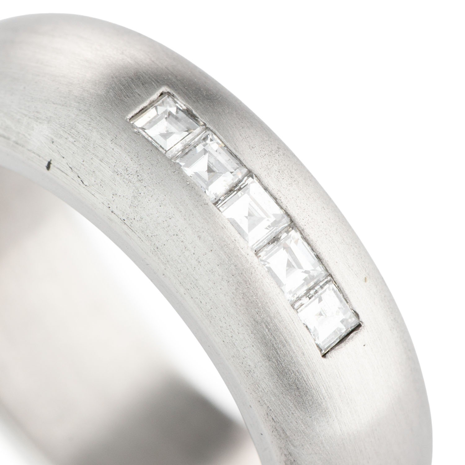 caré geschliffen, ca. 2 x 2 mm, Pt 950, 20,8 g, RW: 54, B: 6,6 mm, hochgewölbte Ringschiene, 21. Jh., neuwertig.