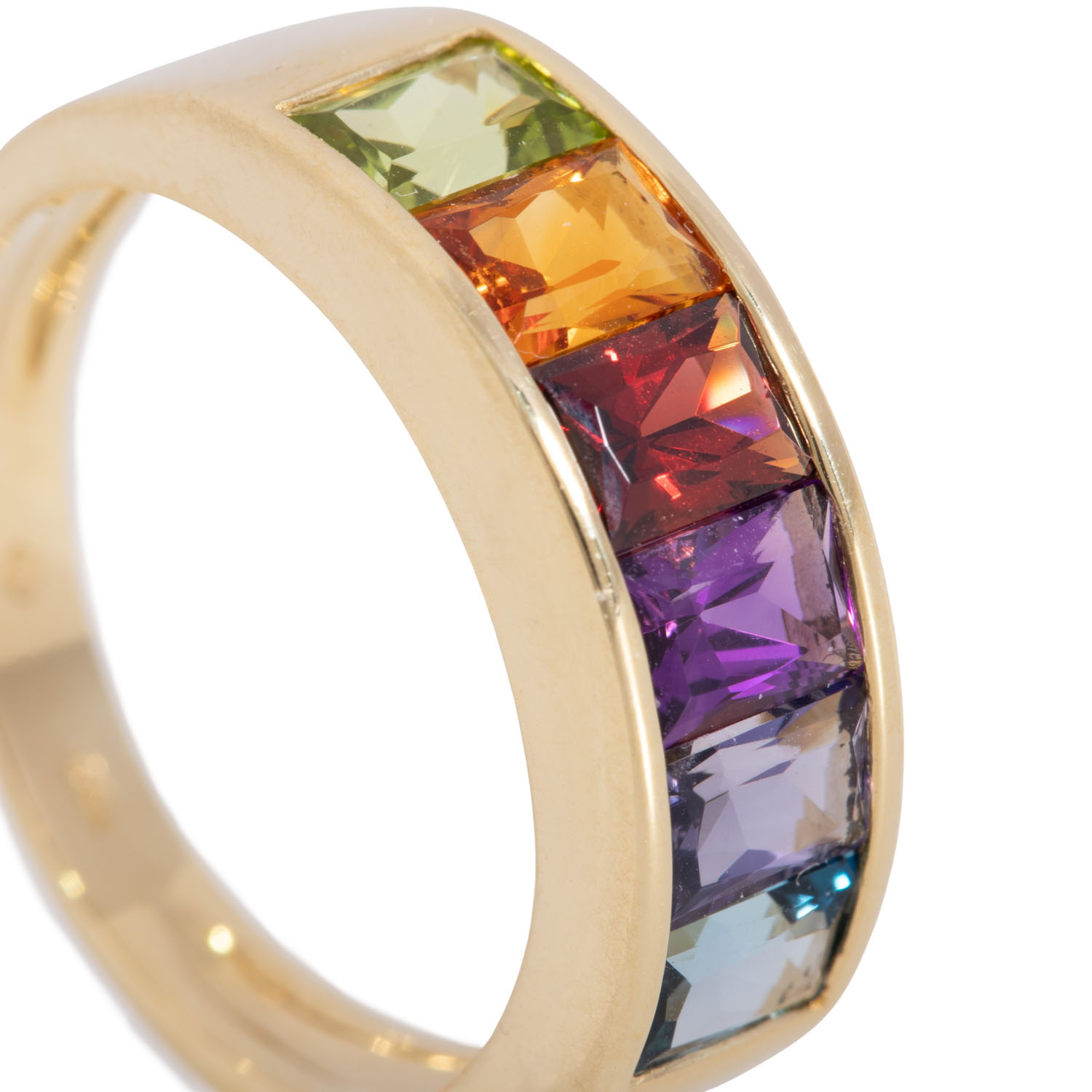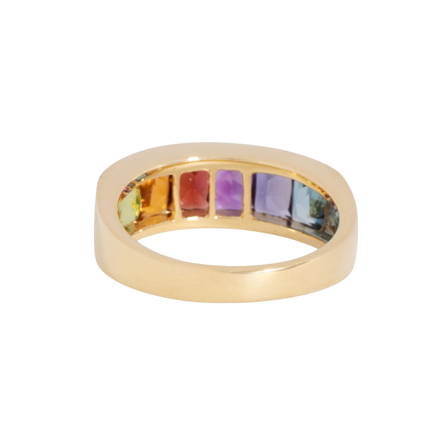 (Olivin, Citrin, Granat, Amethyst, Turmalin, Topas), rechteckiger Scherenschliff, ca. 6 x 4 mm, GG 14K, 8,5 g. RW: 62, 20./21. Jh., minimale Tragespuren.