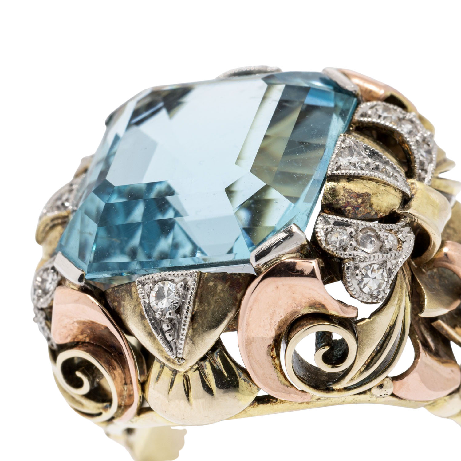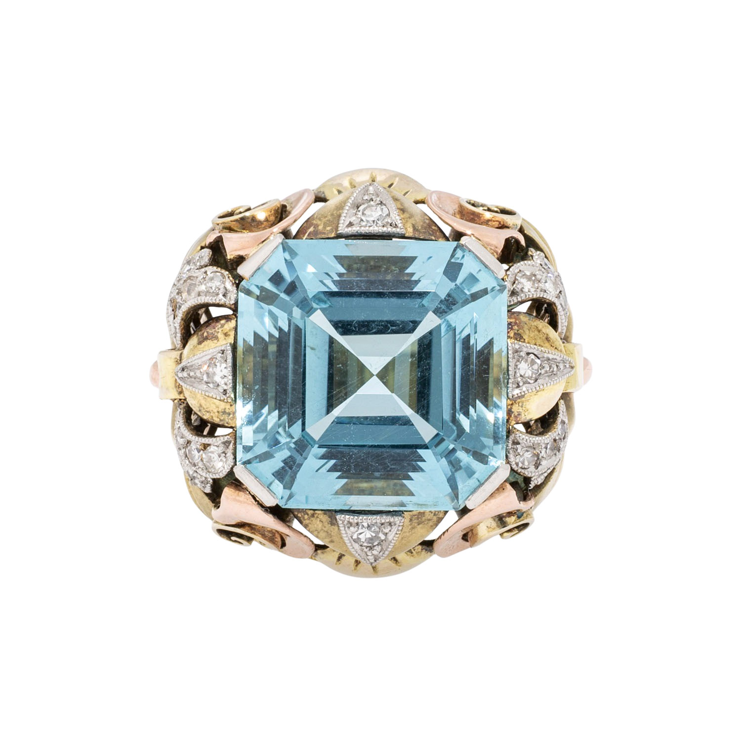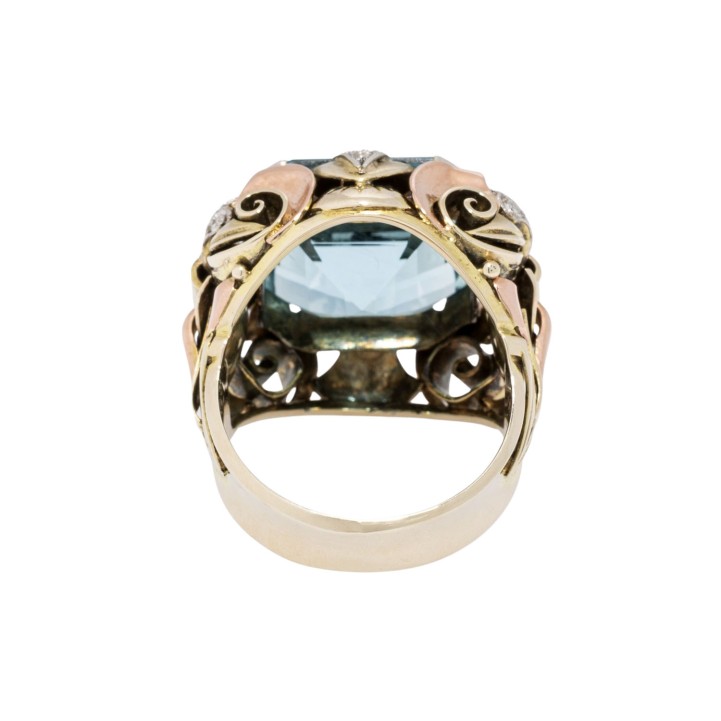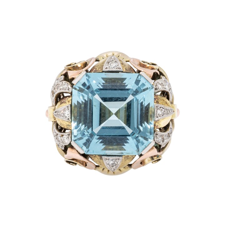 Treppenschliff 14x14 mm, schöne Farbe und kleine Diamanten zus. ca. 0,25 ct, GG/RG/WG 14K, 12,8 g, RW: 58, Mitte 20. Jh., leichte Tragespuren, aufwändige Handarbeit. (18) // Ergänzung 19.12.2025: Die vor diesem Datum angezeigten Preise waren fehlerhaft.