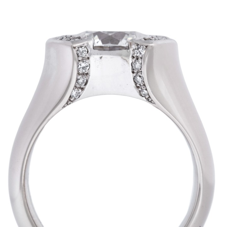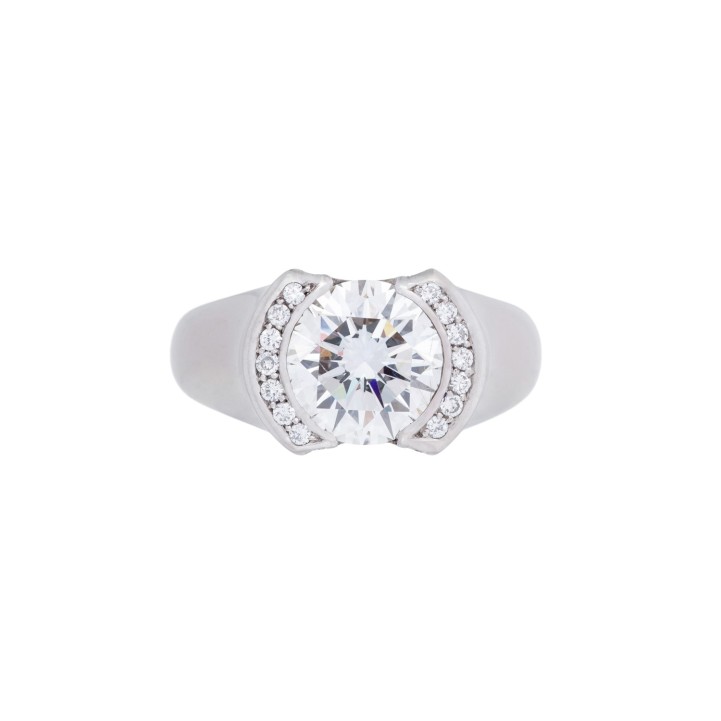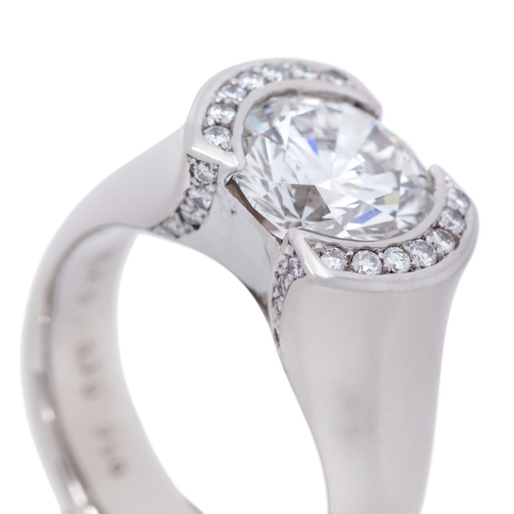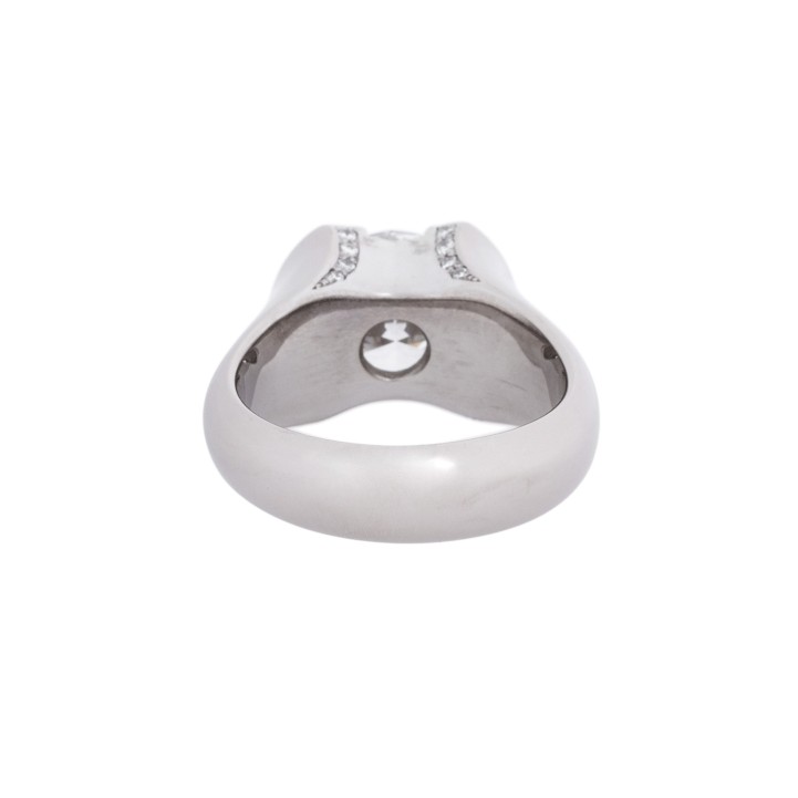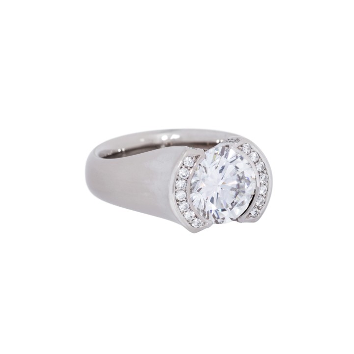(punz.), ca. FW (F)/VS2, reinheitsverbessert, weitere kleine Brillanten zus. ca. 0,25 ct, WG 18K, 19 g, RW: 55, 21. Jh., leichte Tragespuren, inkl. Zertifikat (2012) - in diesem wird die Reinheitsverbesserung nicht erwähnt! WBW für ein vergleichbares Stück mit unbehandeltem Stein: ca. 90.000 €.
