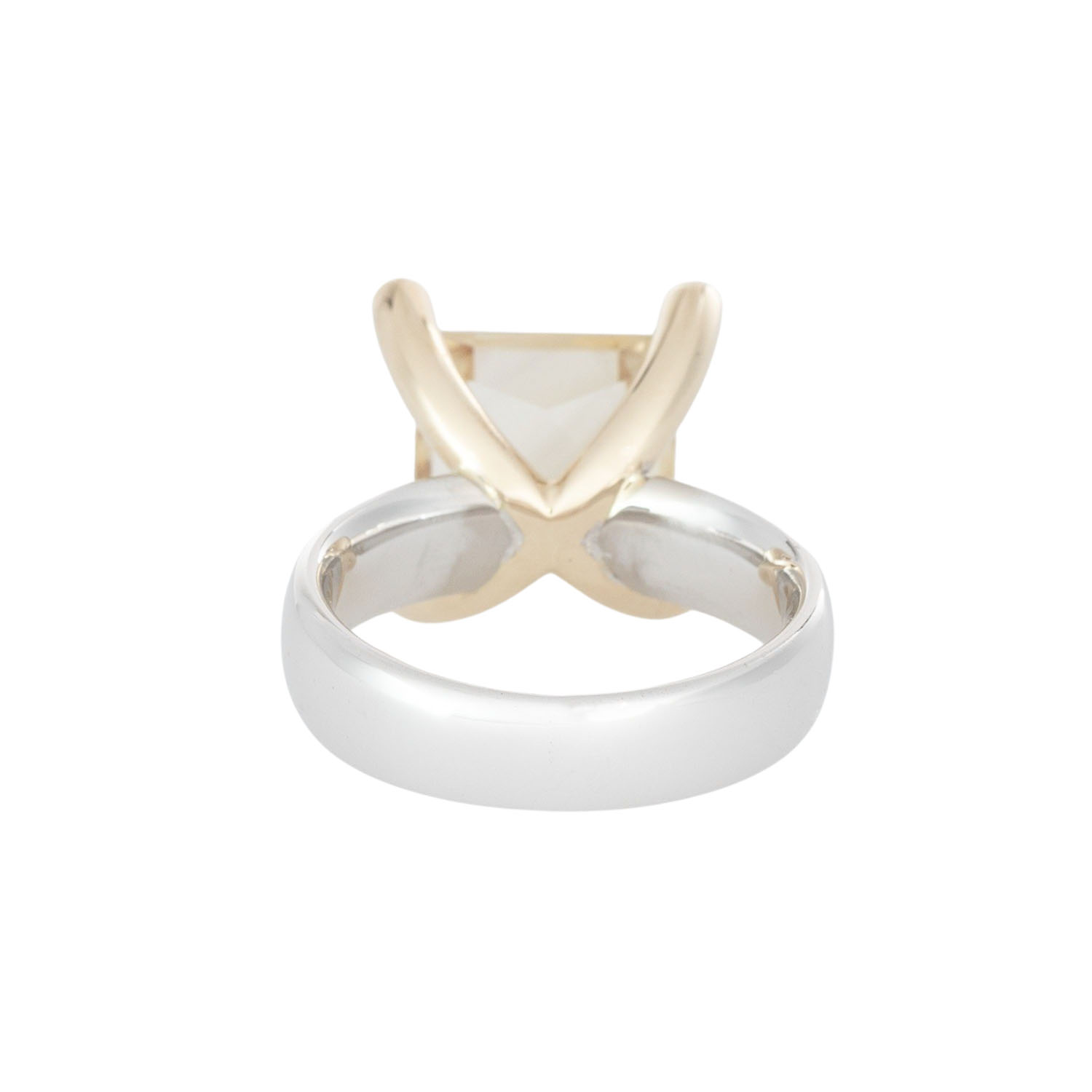 facettiert, quadratisch, 10 x 10 mm, 4 Stotzen mit je einem Brillant, ges. ca. 0,05 ct, WG/GG 14K, 9,5 g, RW: 52, 20./21. Jh., minimale Tragespuren.