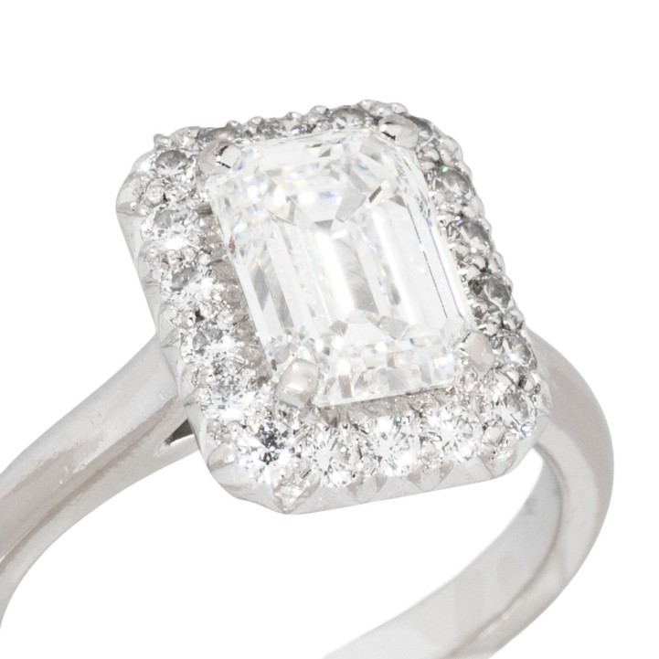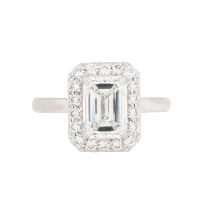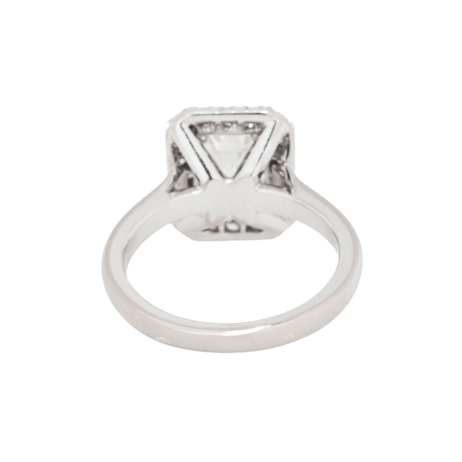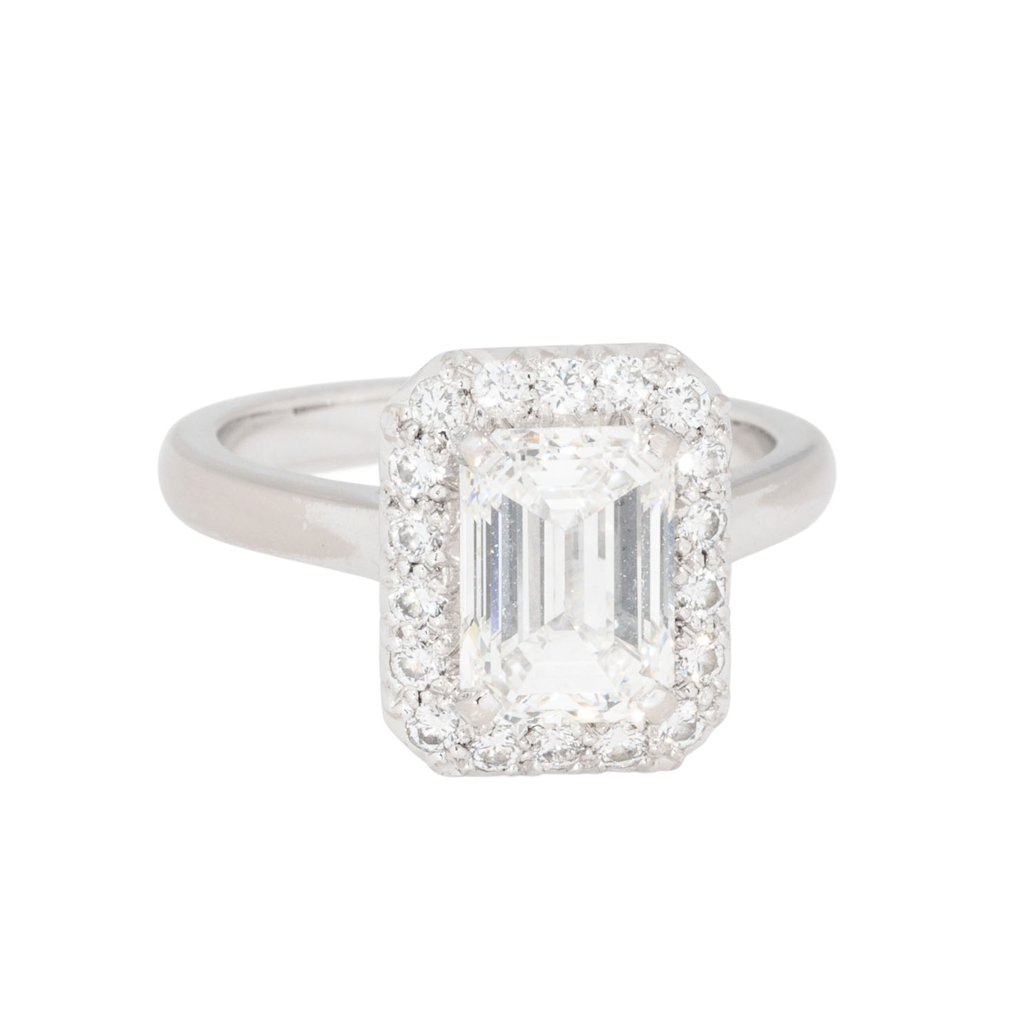 zentral 1 Diamant im Emerald-Cut, 1,80 ct, FW (F)/VVS, Lasergavur, sowie 18 Brillanten von zu. ca. 0,20 ct, gute Farbe und Reinheit, WG 18K, 5,0 g, RW: 49, 21. Jh., leichte Tragespuren, Zubehör: GIA Diamond Grading Report 5181071981 (2016), Rechnung (2017).