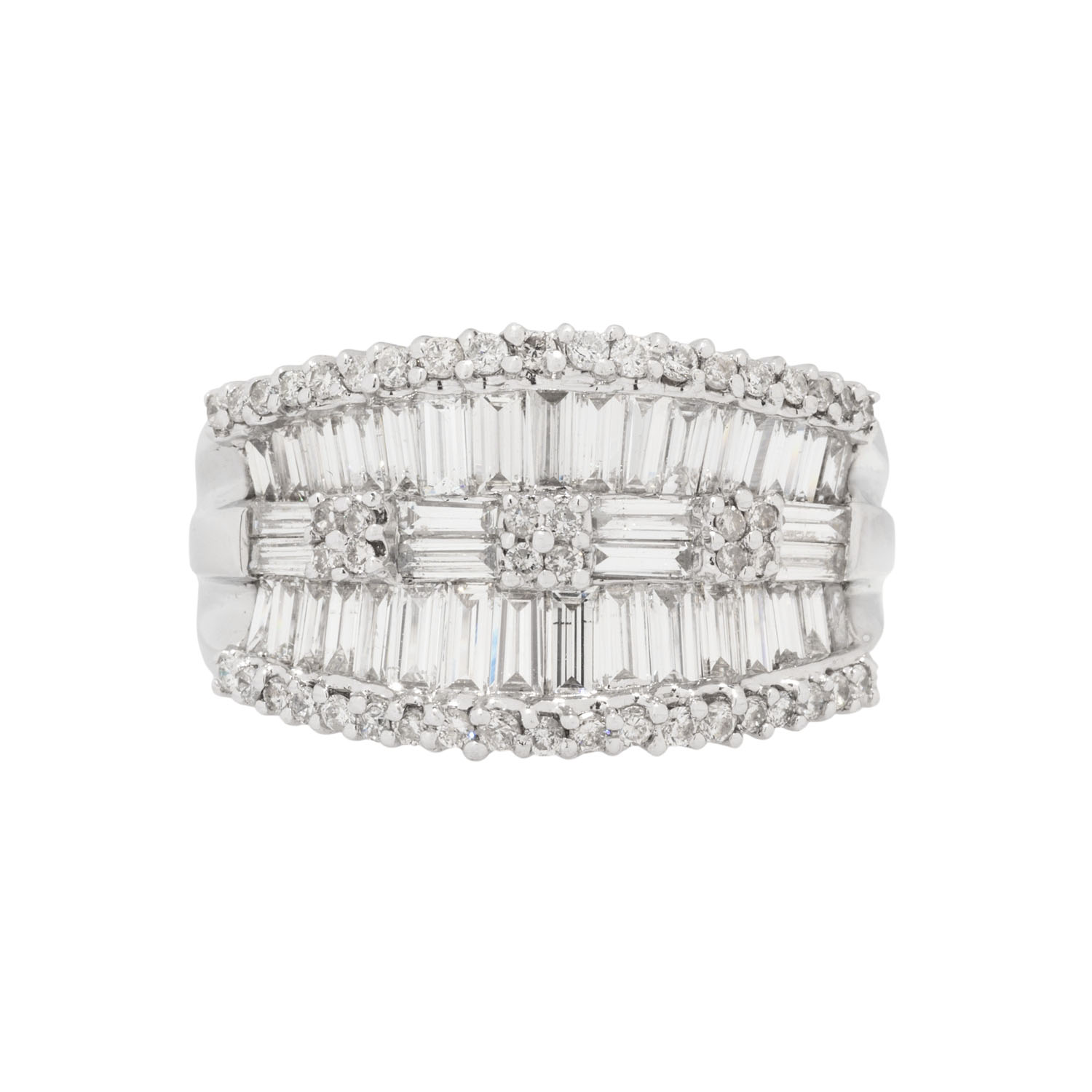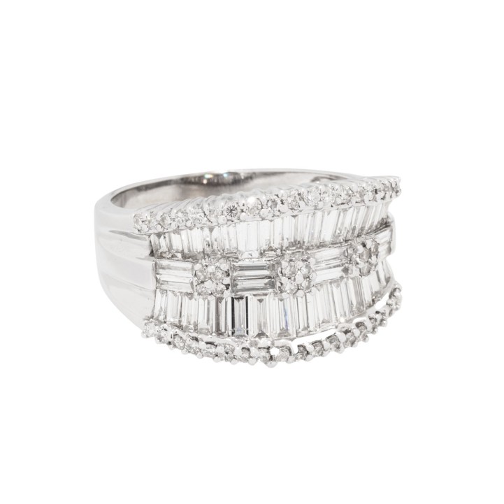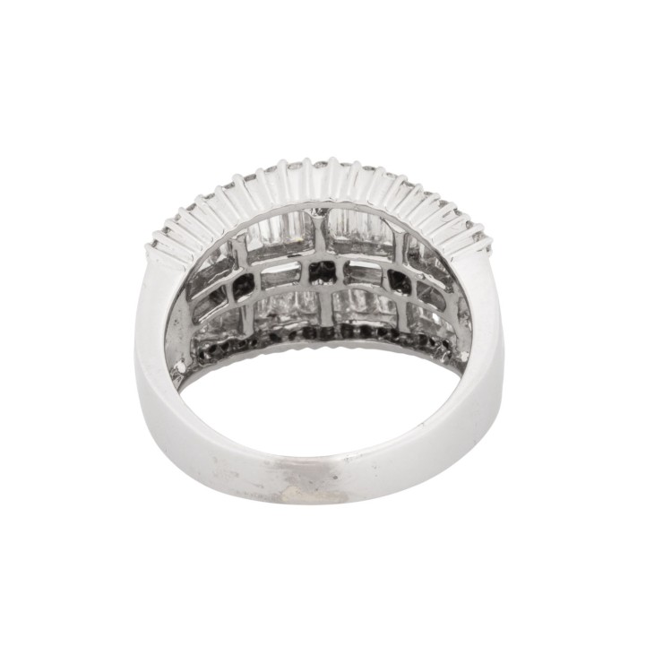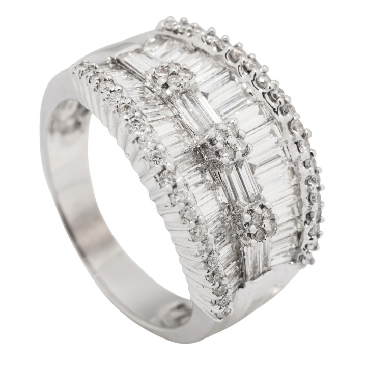 Baguettediamanten zus. ca. 2,0 ct und Brillanten von zus. ca. 1,0 ct, gute Farbe, gute bis mitllere Reinheit, KP (2006): 5000€, WG 14K, 8,6 g, RW: 62, 21. Jh., leichte Tragespuren, 1 Diamant deutlich bestoßen.