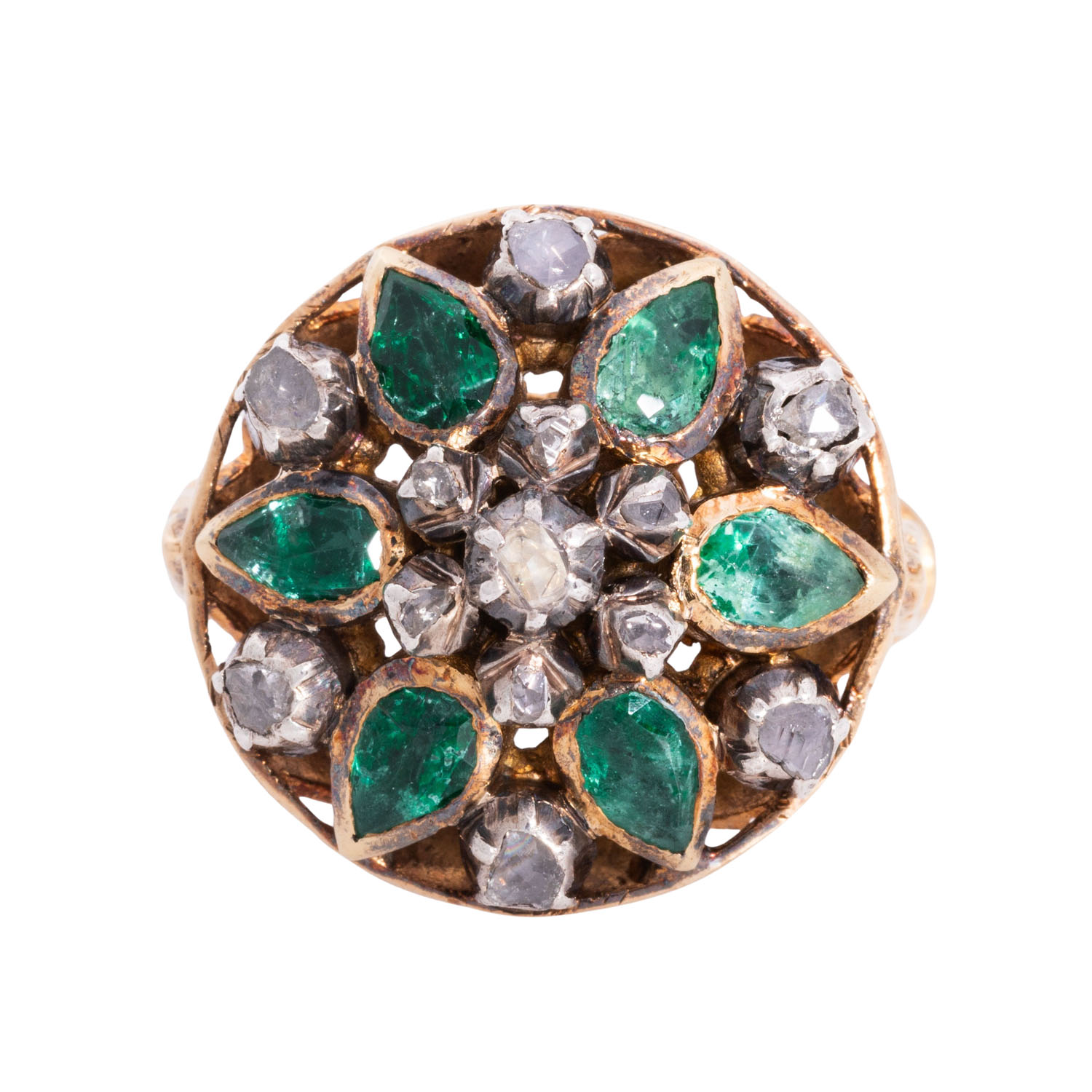 vermutlich Beryll unterseitig grün foliert, GG 18K, Fassungen tlw. Silber, 11,4 gr, RW: 53, 2. Hälfte 19. Jh., Tragespuren.