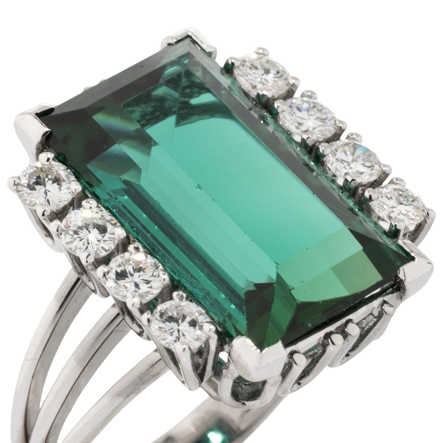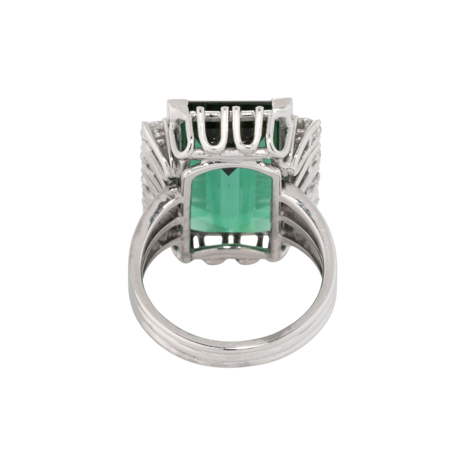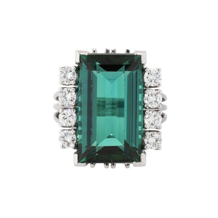 von ca. 21,2 ct, Rechteck, Treppenschliff und 8 Brillanten zus. ca. 0,80 ct, ca. FW- LGW (G-I)/ VS. WG 18K, 9,5g, RW: 52. 1960er Jahre, leichte Tagespuren, mit Gravur: '1965'.