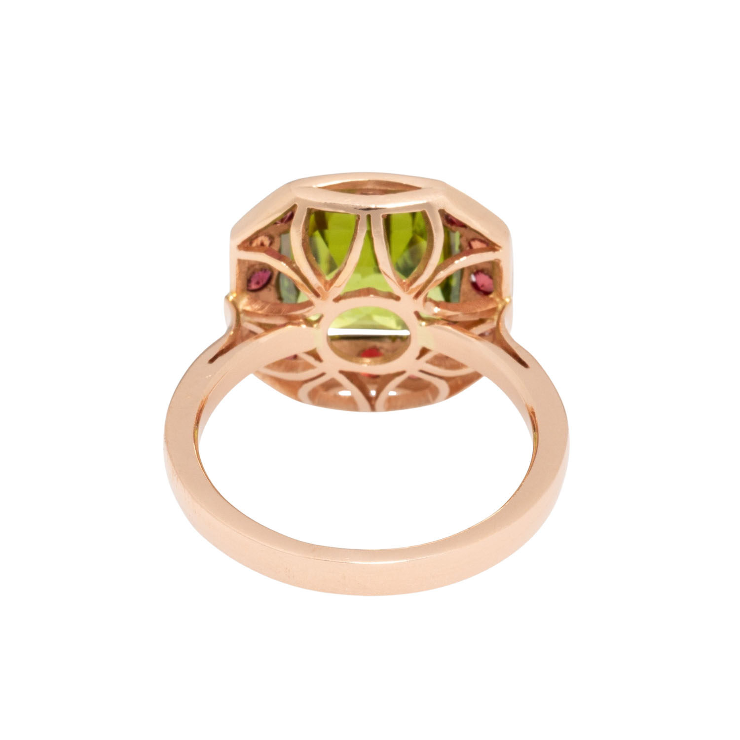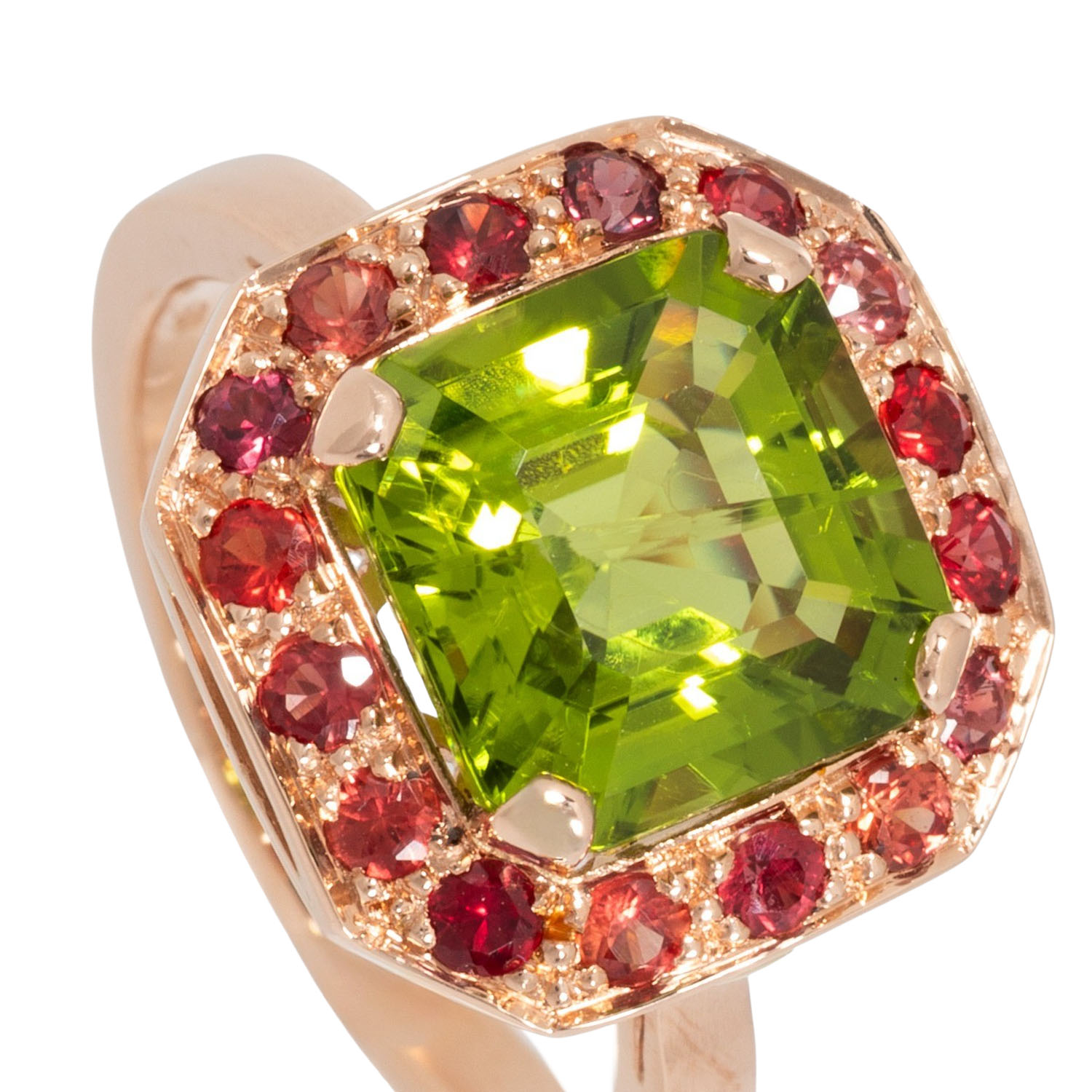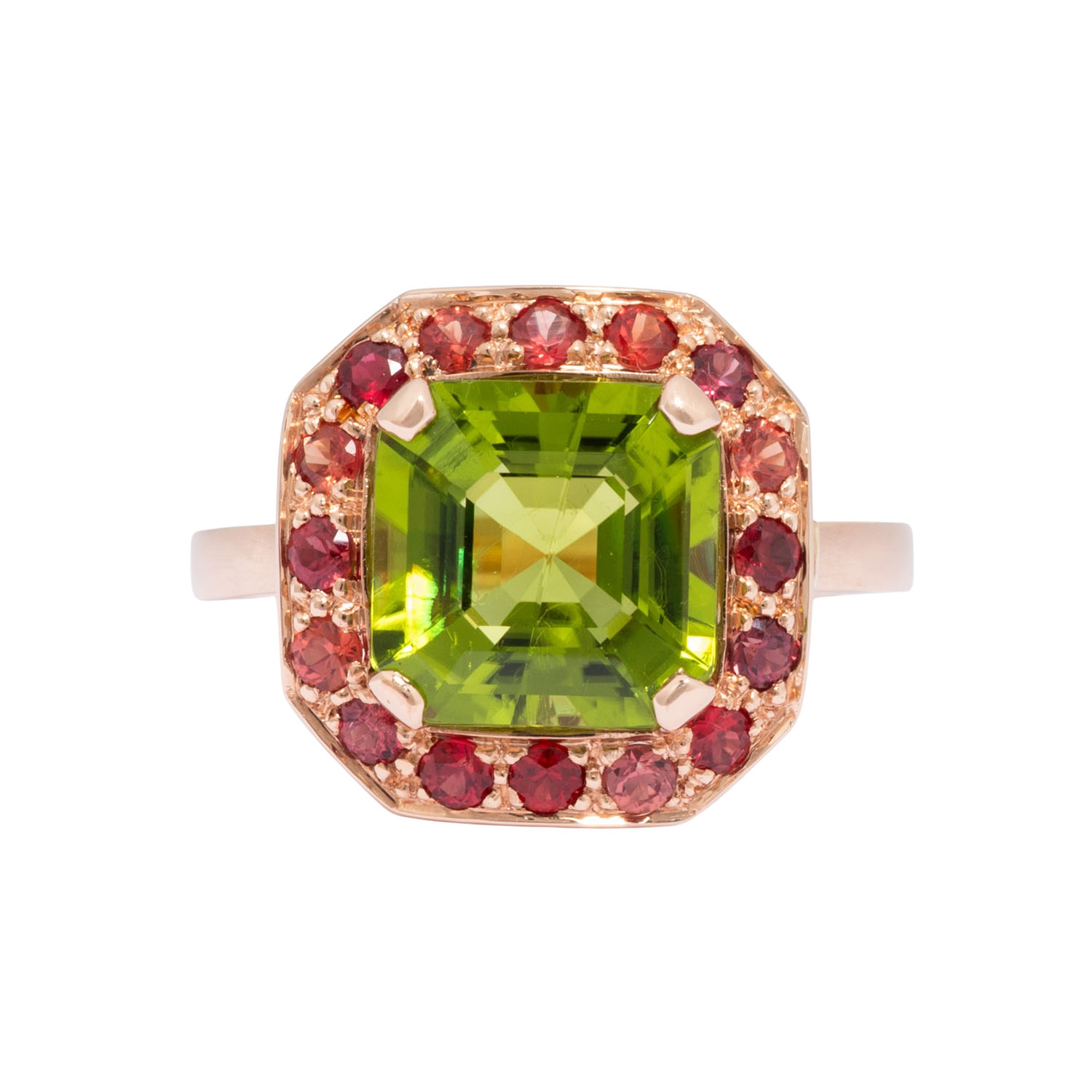 Ring with fine peridot in octogonal step-cut, ca. 5 ct and 16 orange sapphires, totalling ca. 0.8 ct, 18K RG, 6.7 g, sing size 56, 20th/21st century, mint condition.