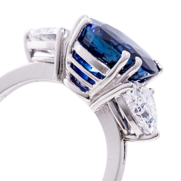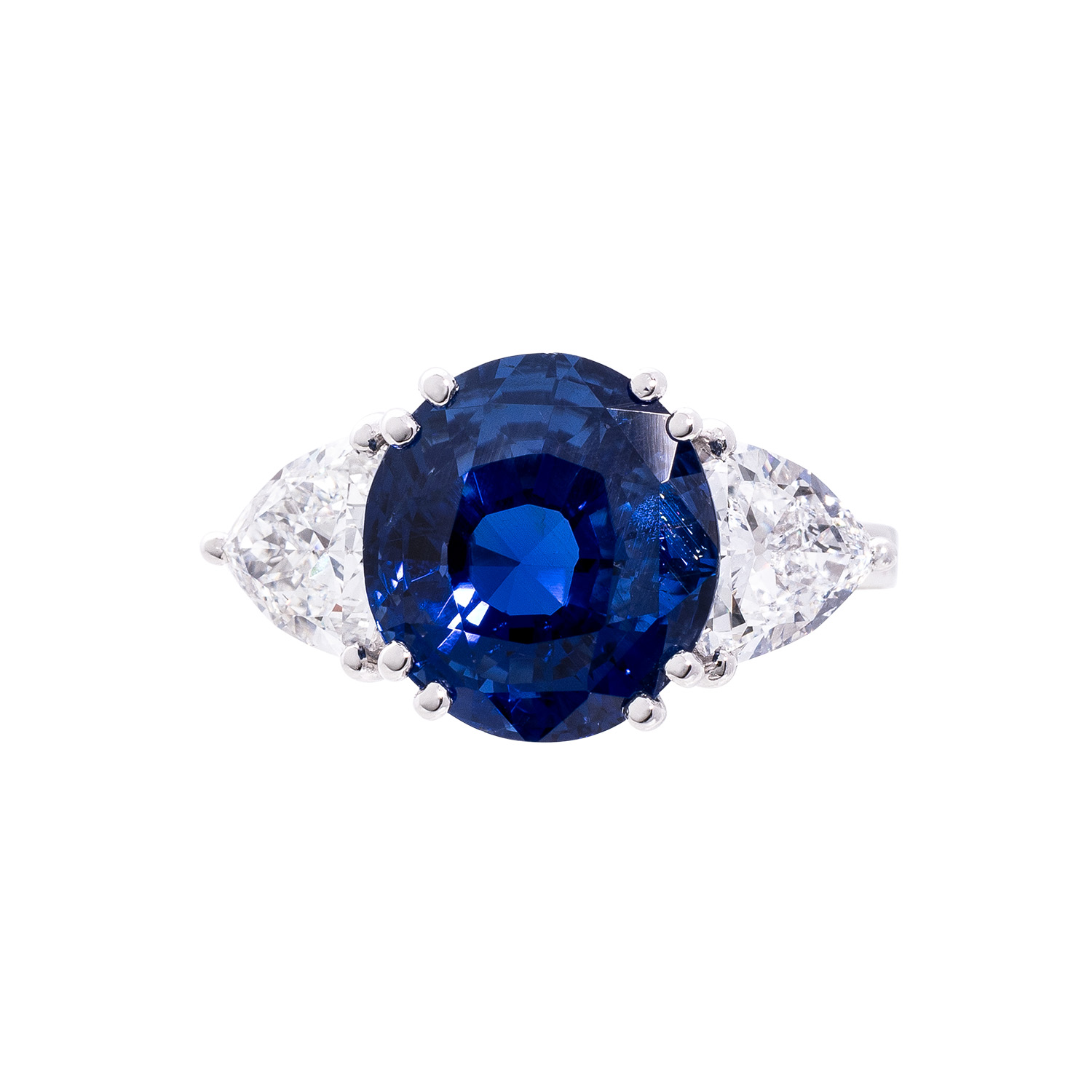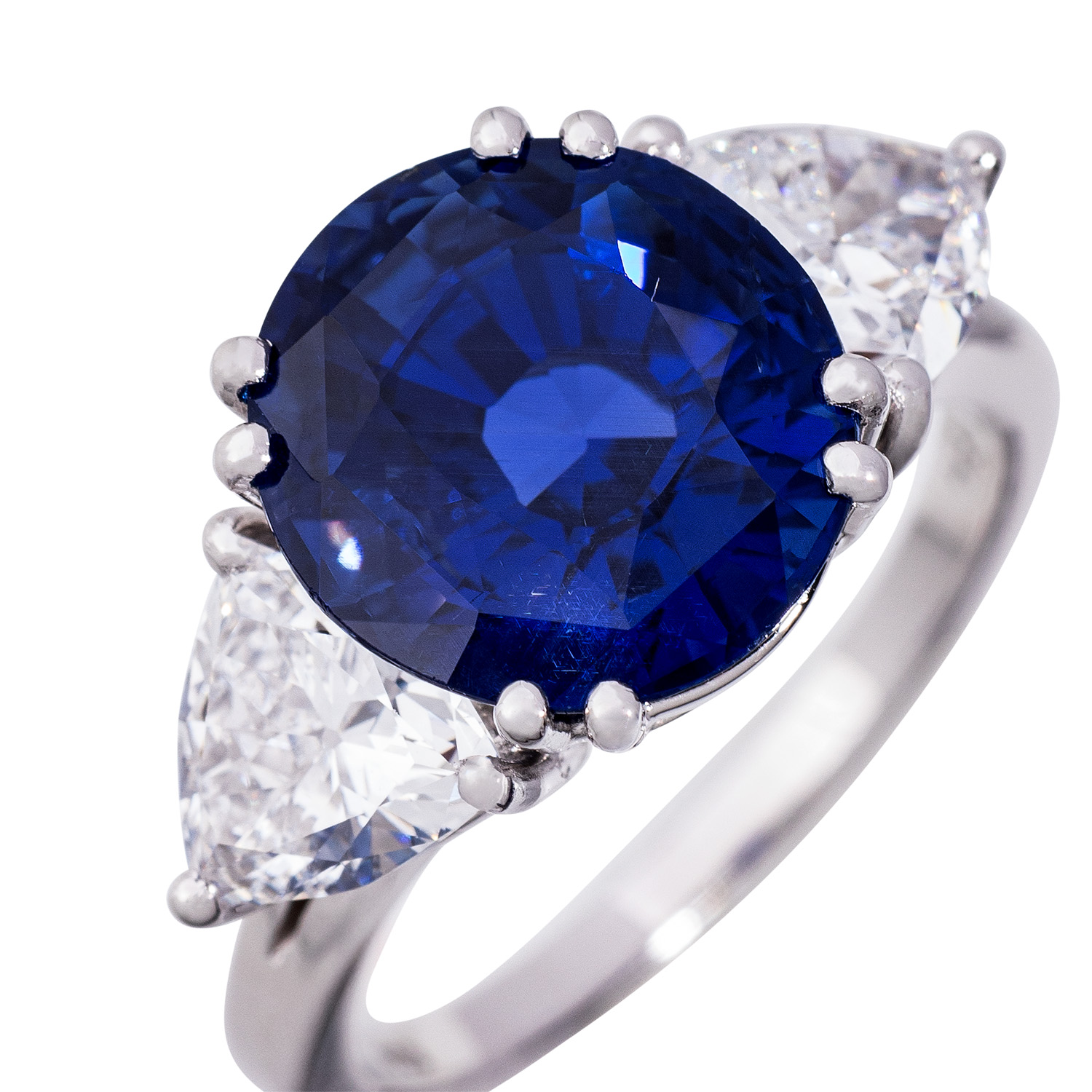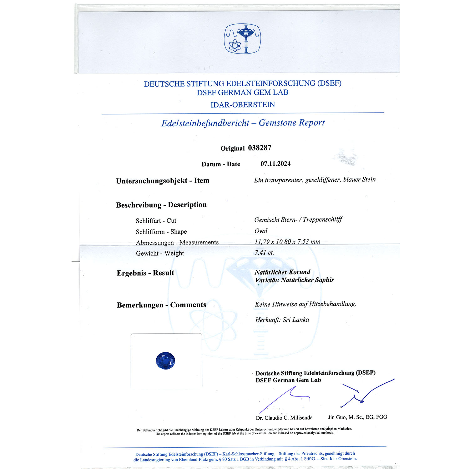 WBW ca. 100.000 €, königsblauer Saphir von 7,41 ct ohne Anzeichen von Hitzebehandlung, Trillianten je ca. 0,85 ct, ca. FW-WEISS (G-H)/VS, Steingewichte graviert, WG 18K, 7,1 g, RW: 54, 20./21. Jh., sehr guter Erhalt, Saphir mit DSEF Gutachten 038287 vom November 2024