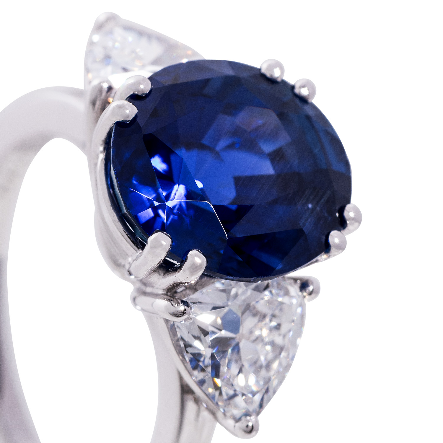 Ring mit feinstem Saphir flankiert von 2 Trilliant-Diamanten,