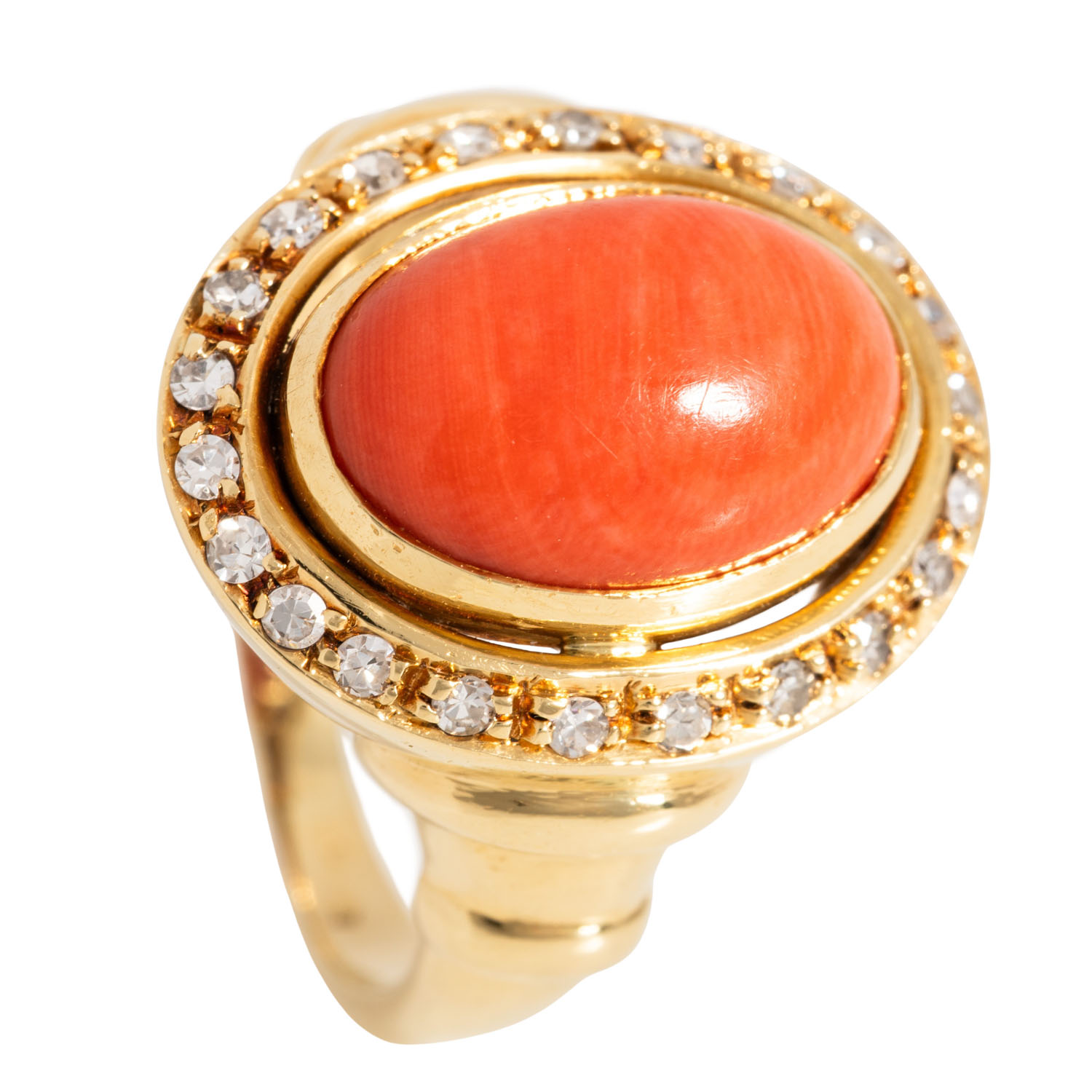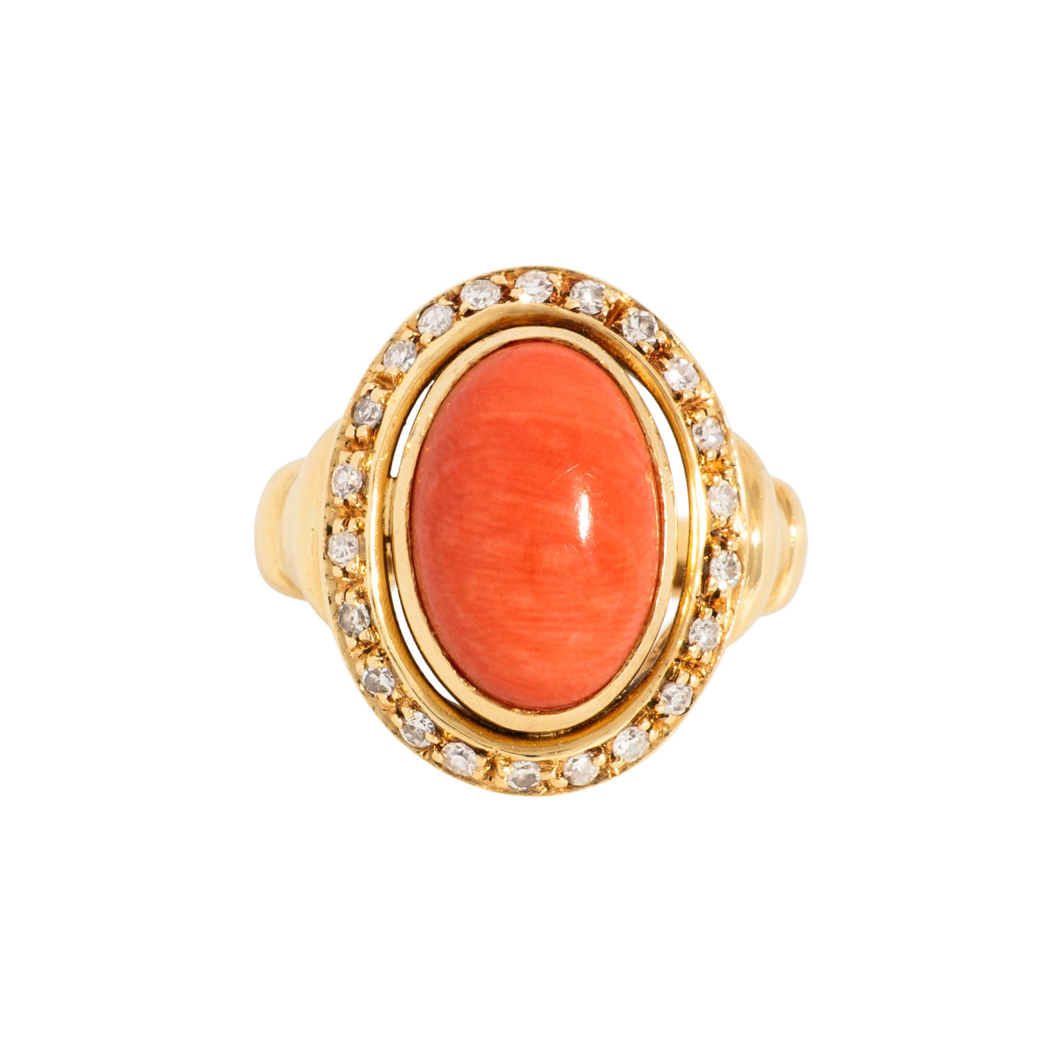 Ring mit Korallcabochon entouriert von 22 Achtkantdiamanten