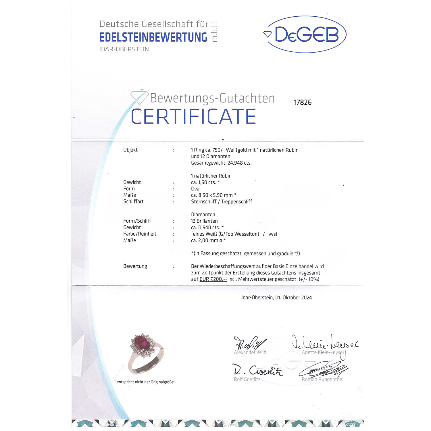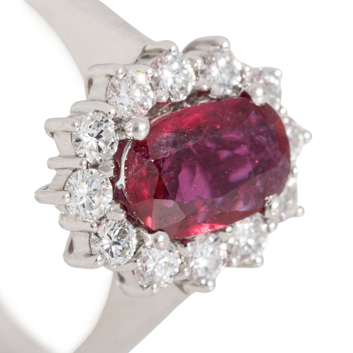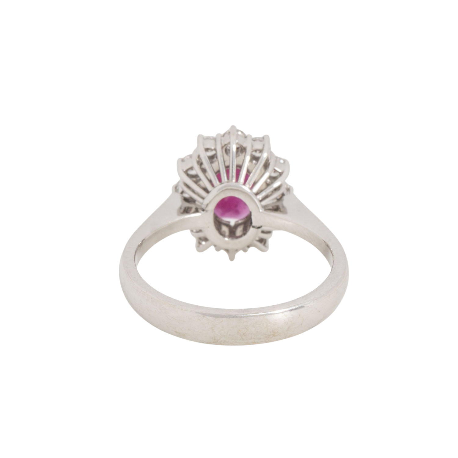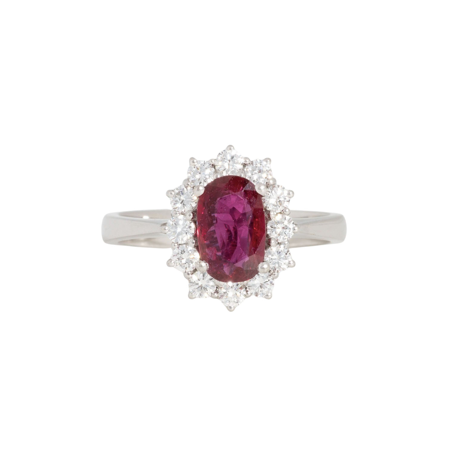 oval facettiert, ca. 8,6 x 6 mm, 1,03 ct (exp.), 12 Brillanten, 0,46 ct (exp.), FW (G)/IR (exp.), WG 18K, 4,9 g, RW: 54, 1986, minimale Tragespuren, Zubehör: Schmuckexpertise 4605 des Herstellers (1986), Bewertungsgutachten Dt. Ges. für Edelsteinbewertung (DeGEB) 17826/2024,