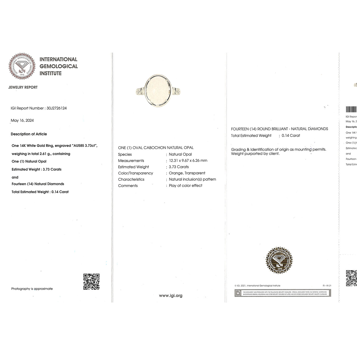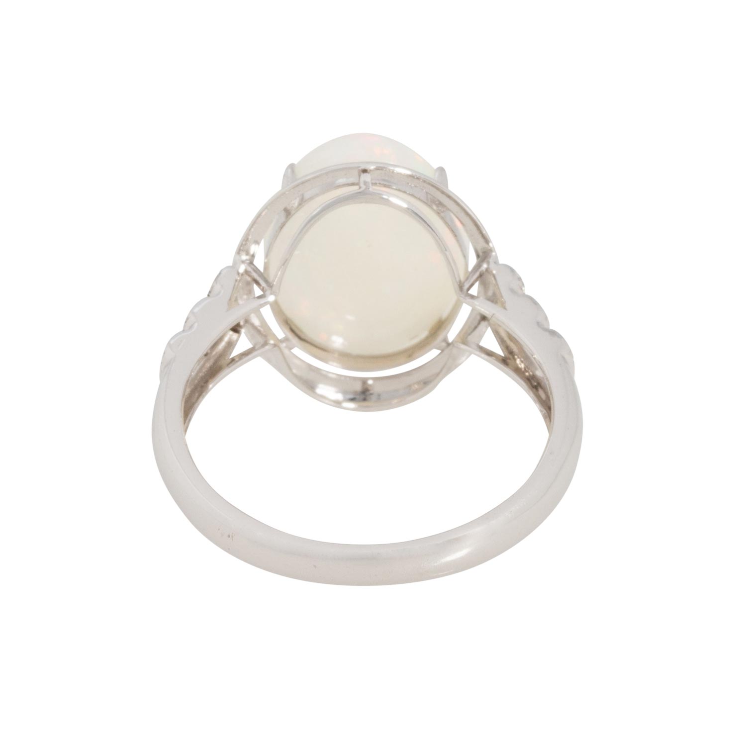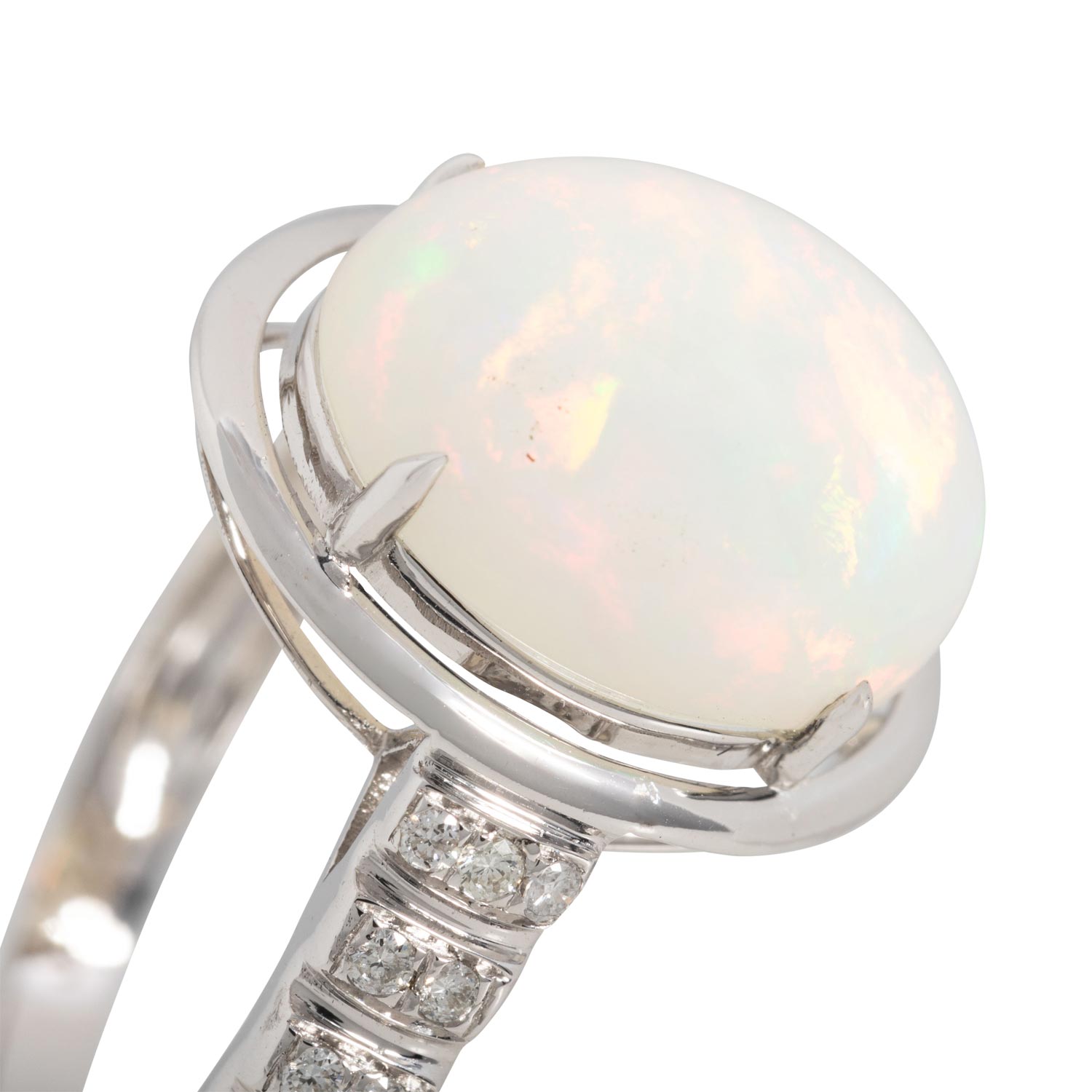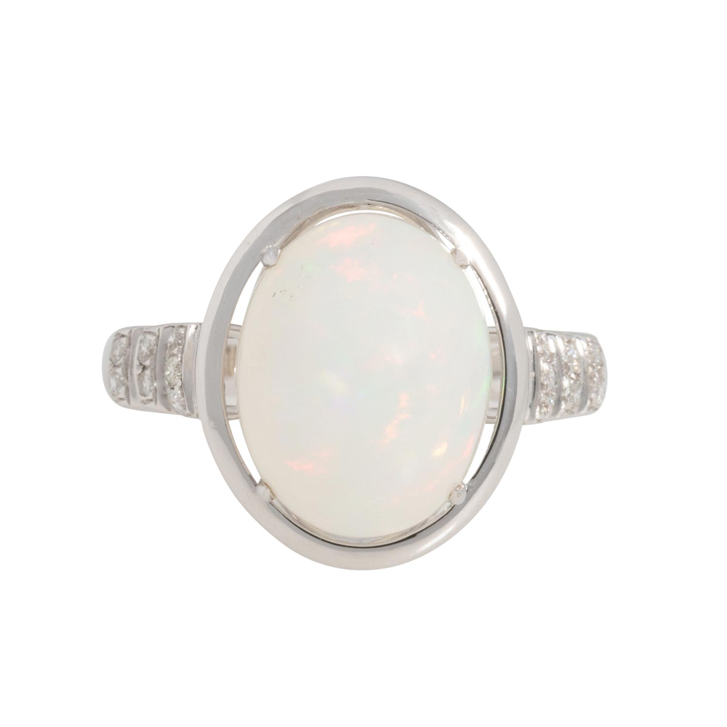 ovaler Opal im Cabochonschliff ca. 12,3 x 9,67 x 6,26 mm, ca. 3,73 ct, 14 Brillanten von zus. ca. 0,14 ct, gute Farbe, niedere Reinheit, WG 14K, 2,6 g, RW: 53, 21. Jh., sehr geringe Tragespuren. (11)