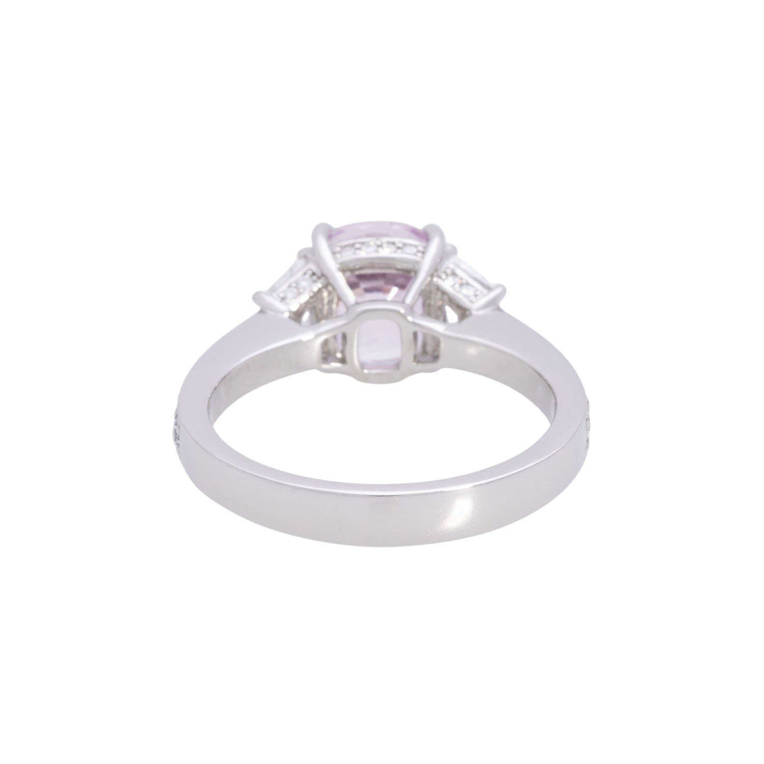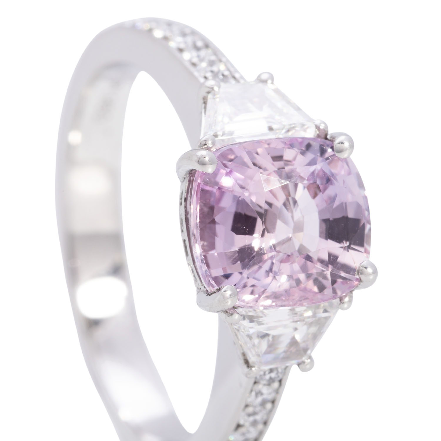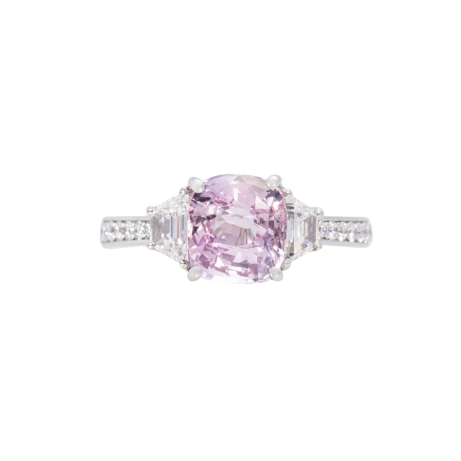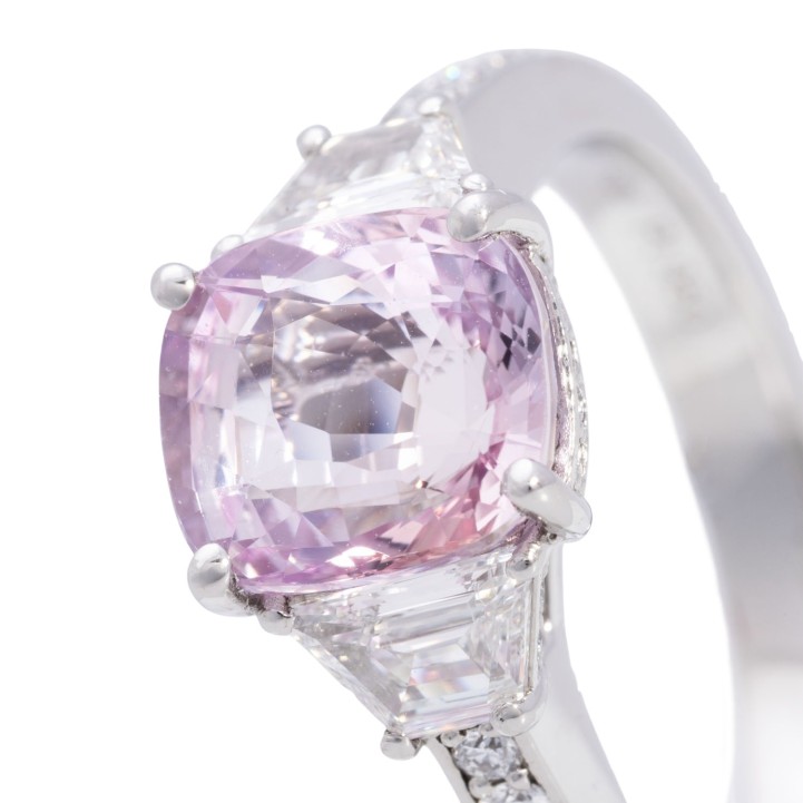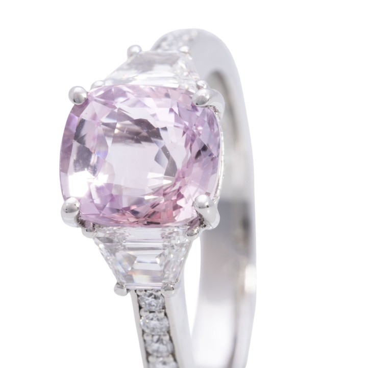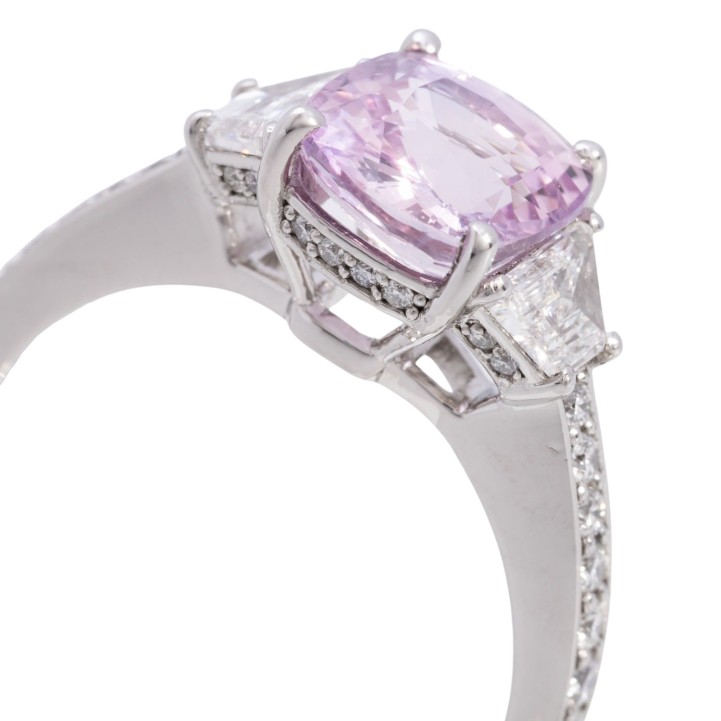 2 Diamantrapeze und Brillanten zus. ca. 1,3 ct, FW (F-G)/VVS, Padparadscha in gleichmäßiger orange-pinker Farbe, ohne Hinweise auf Hitzebehandlung, Herkunft Sri Lanka (Ceylon), PT950, 9,2 g, RW: 60, 20./21. Jh., neuwertig, inklusive Lotus (03/2023) und AIGS Edelsteinbefundbericht (07/2021).