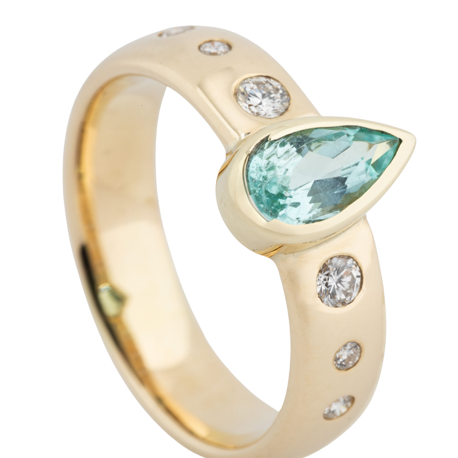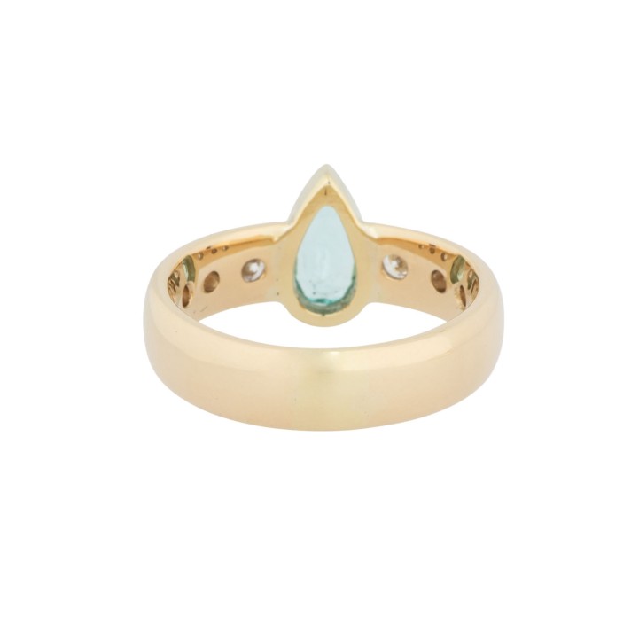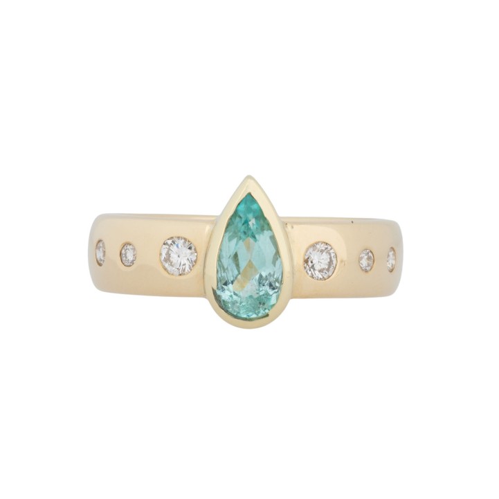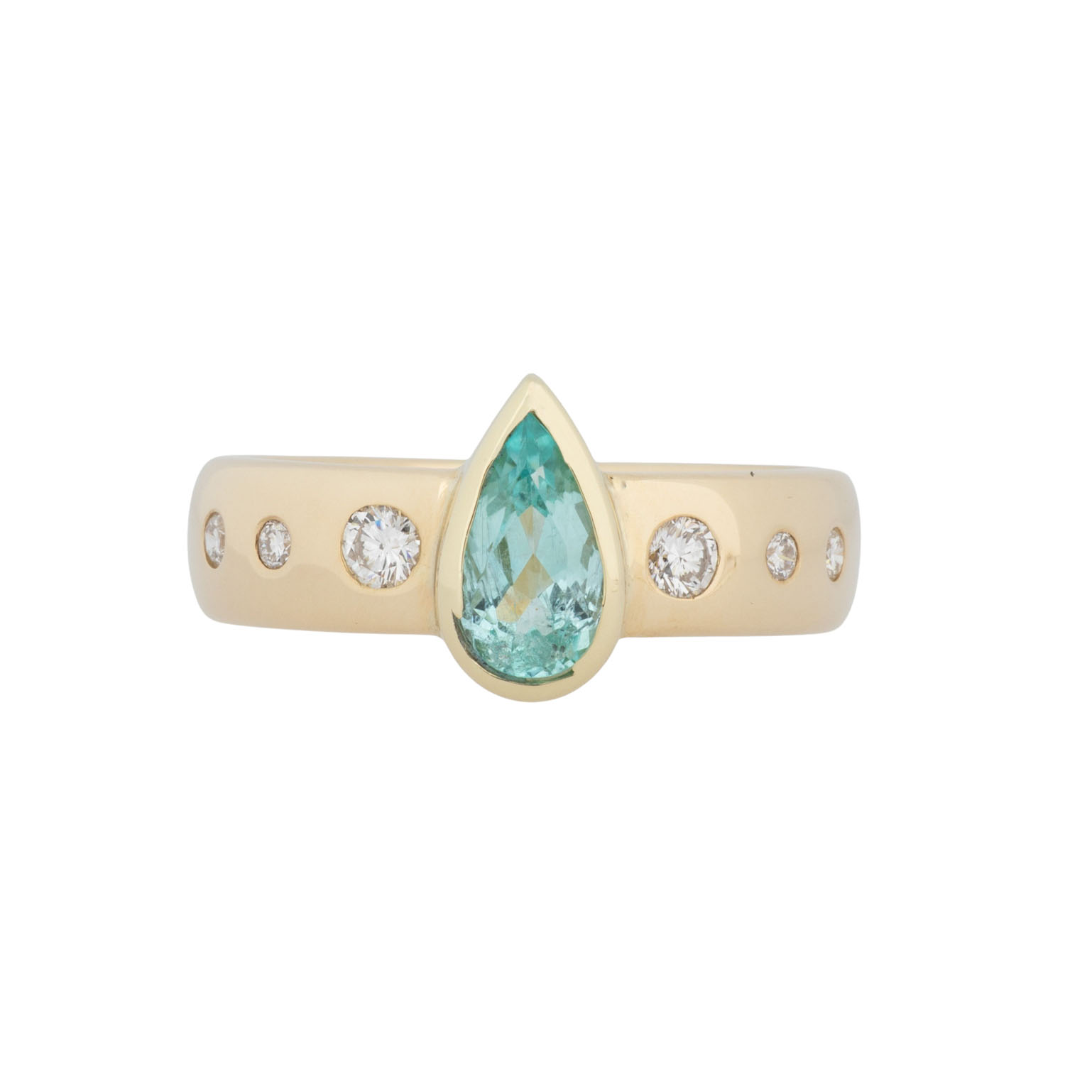 zus. ca. 0,28 ct, gute Farbe und Reinheit, Turmalin in Tropfenform ca. 0,88 ct, GG 14K, 9,4 g, RW: 62, 21. Jh., Fassungsrand unvollständig, ansonsten guter Erhalt, mit Kaufbeleg des Turmalins (2021): 2.380 €.