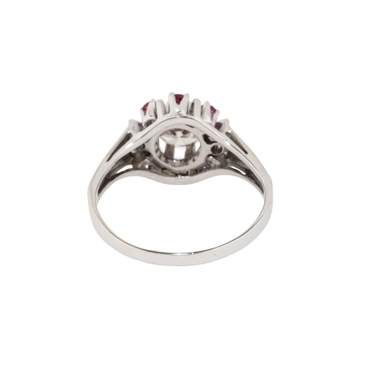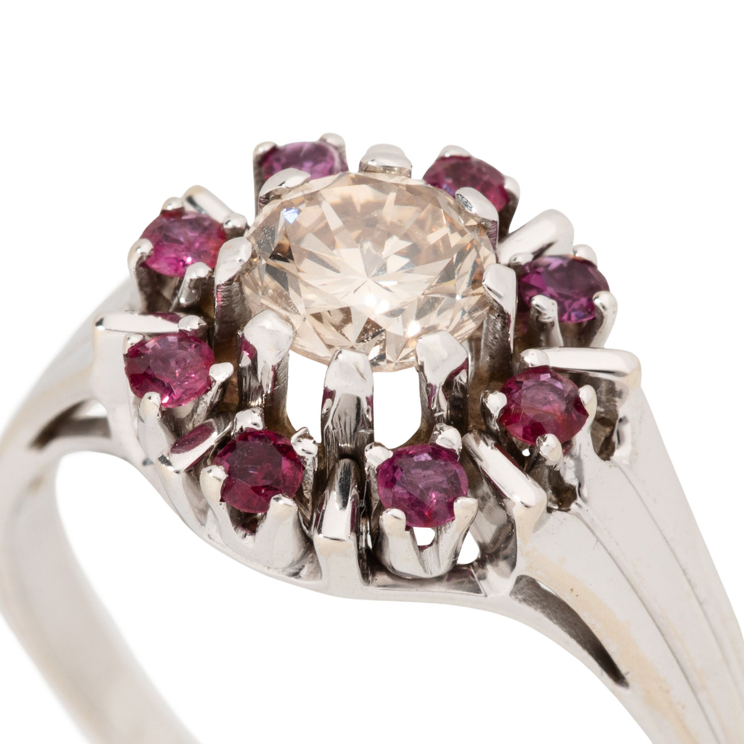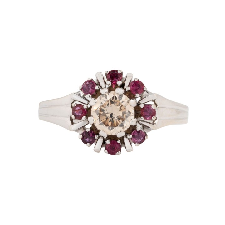 ca. LIGHT BROWN/VS und kleinen Rubinen, WG 14K, 3,9 g, RW: 60 (erweitert, deshalb Ringschiene dünn und oval), 2. H. 20. Jh., Tragespuren. (7)