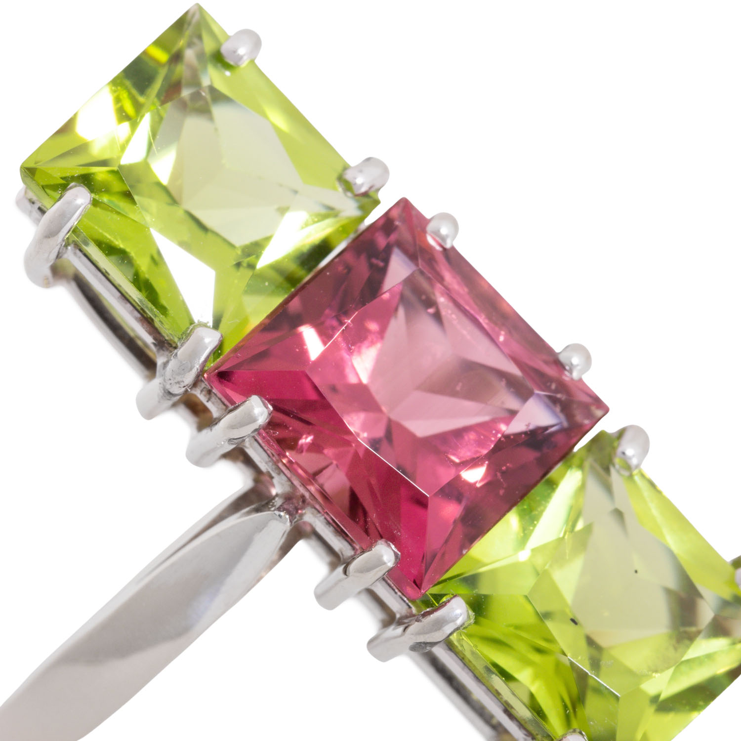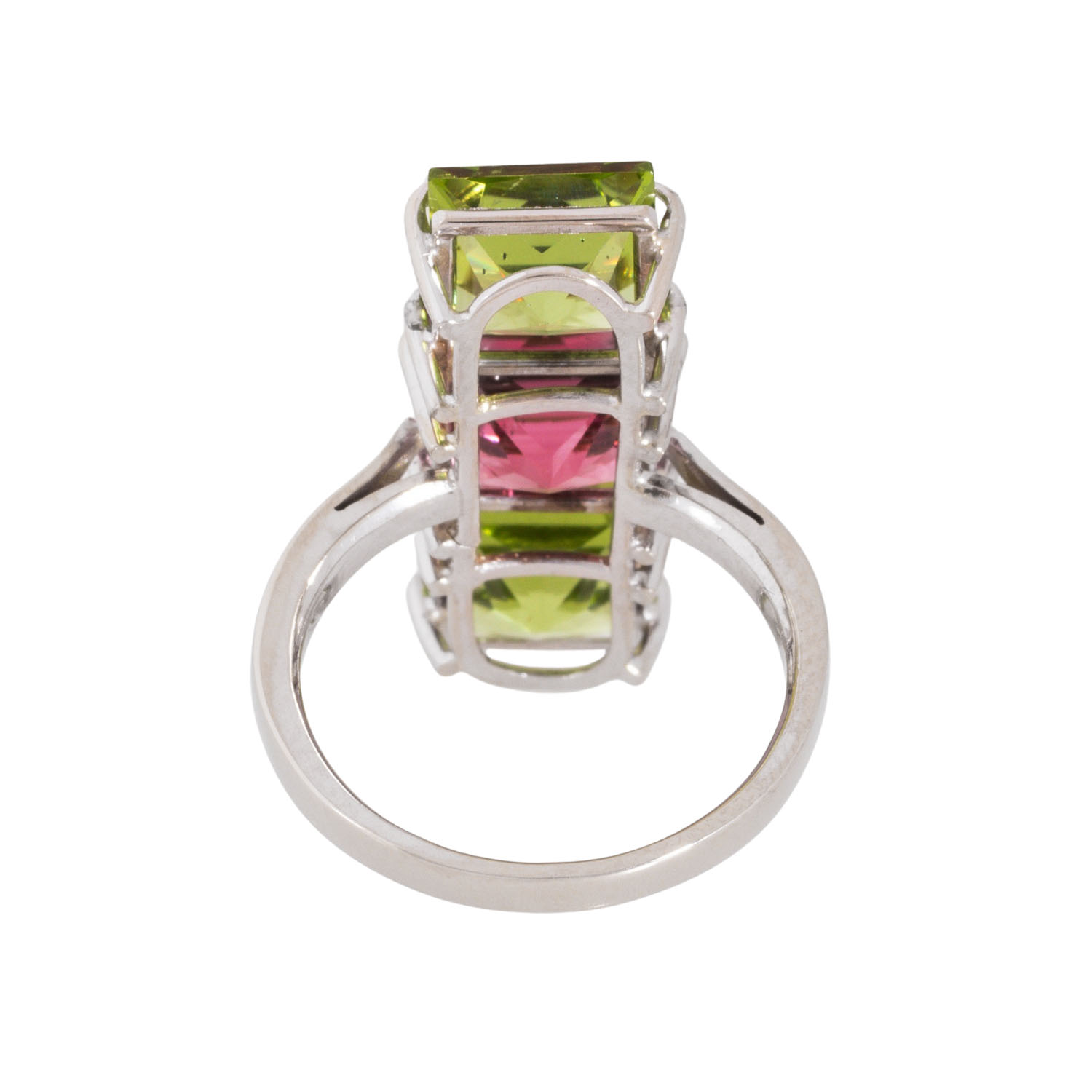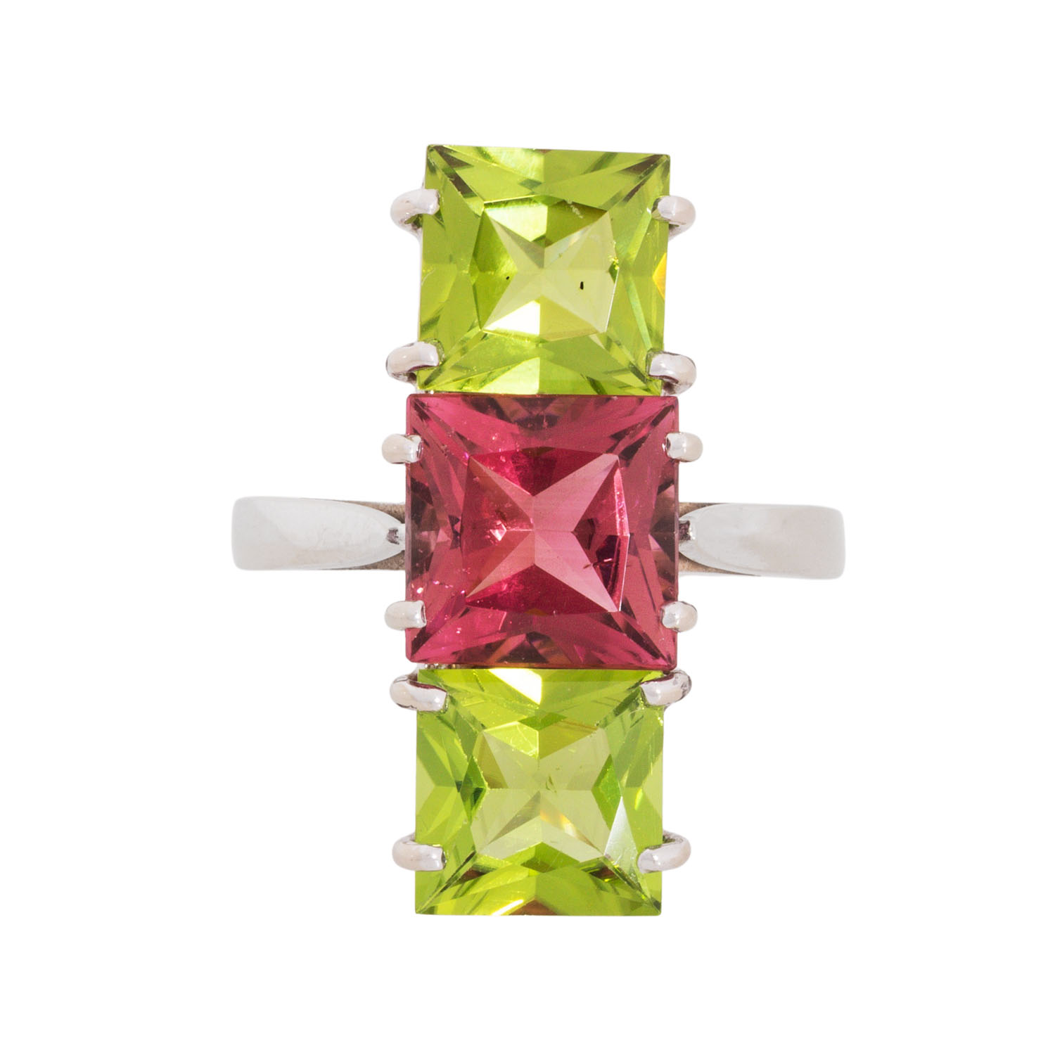 facettierter Rubelith ca. 3 ct, 2 facettierte Peridots zus. ca. 4,8 ct, WG 14K, 5,8 g, RW: 55, 20./21. Jh., neuwertig.