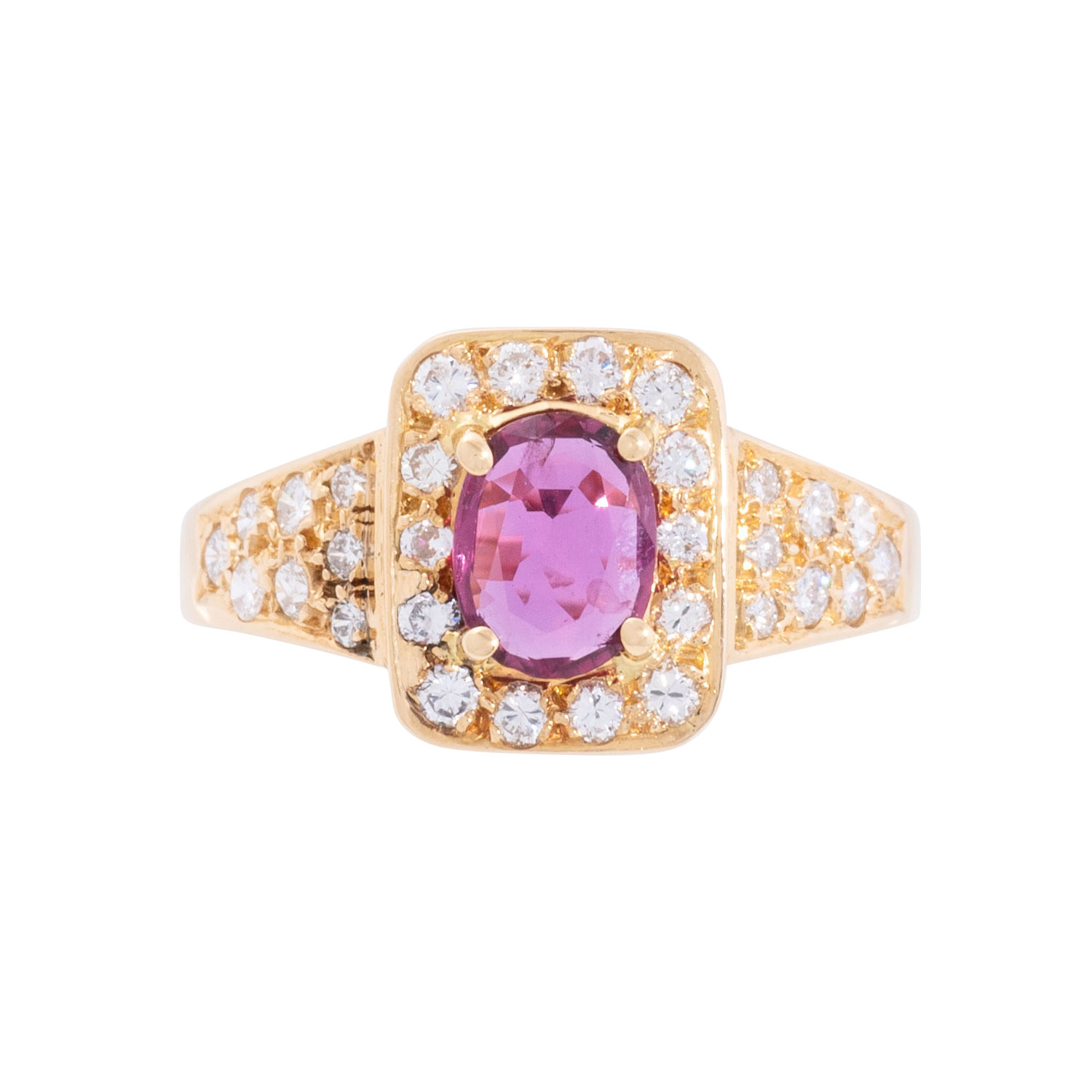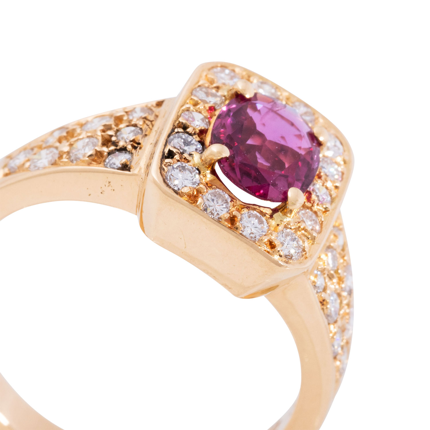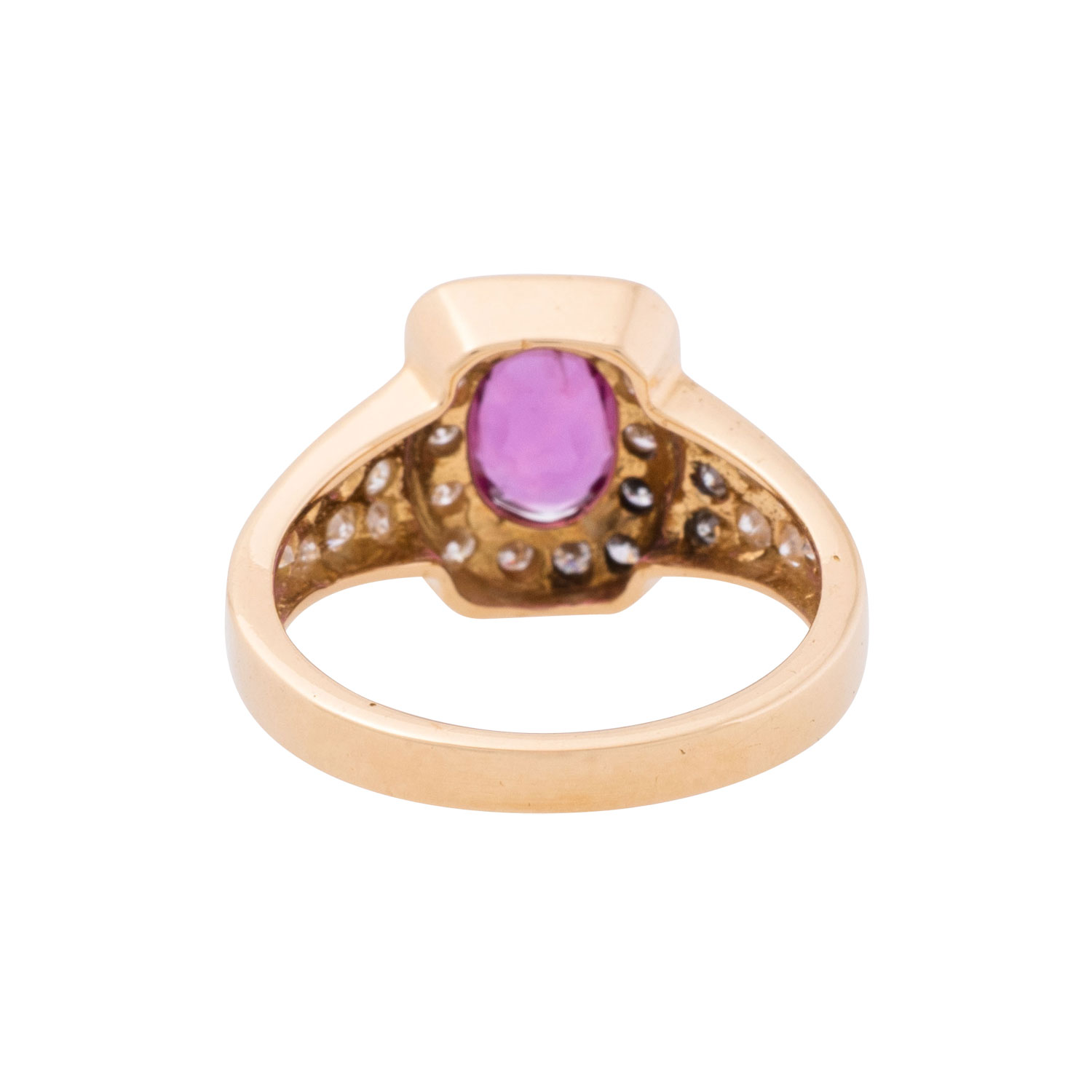 ca. 6,7 x 5,2 mm, 30 Brillanten, ges. 0,50 ct (grav.), FW/VSI, GG 18K, 4,7 g, RW: 52, Rubin mit Wachstumsmerkmalen, Heilungsriss, Ende 20. Jh., leichte Tragespuren.