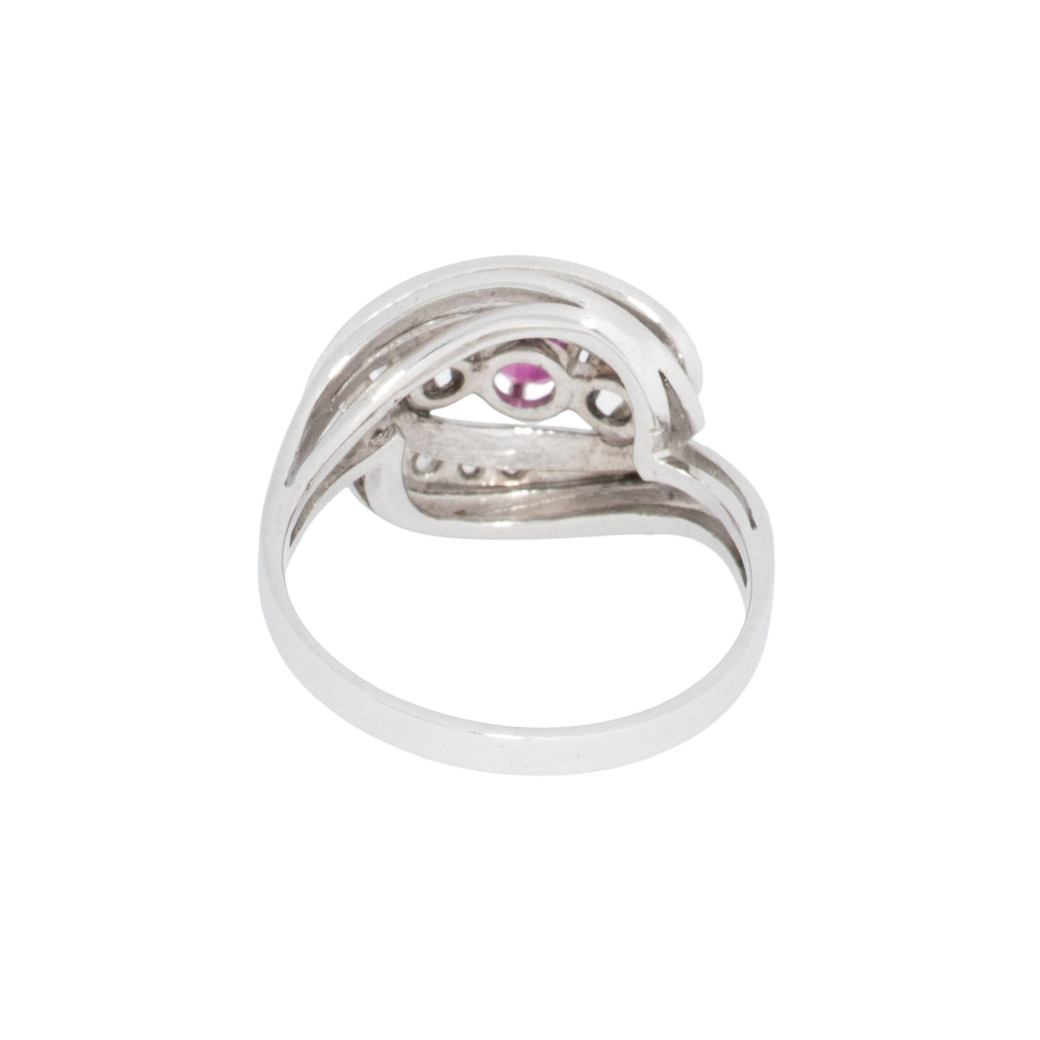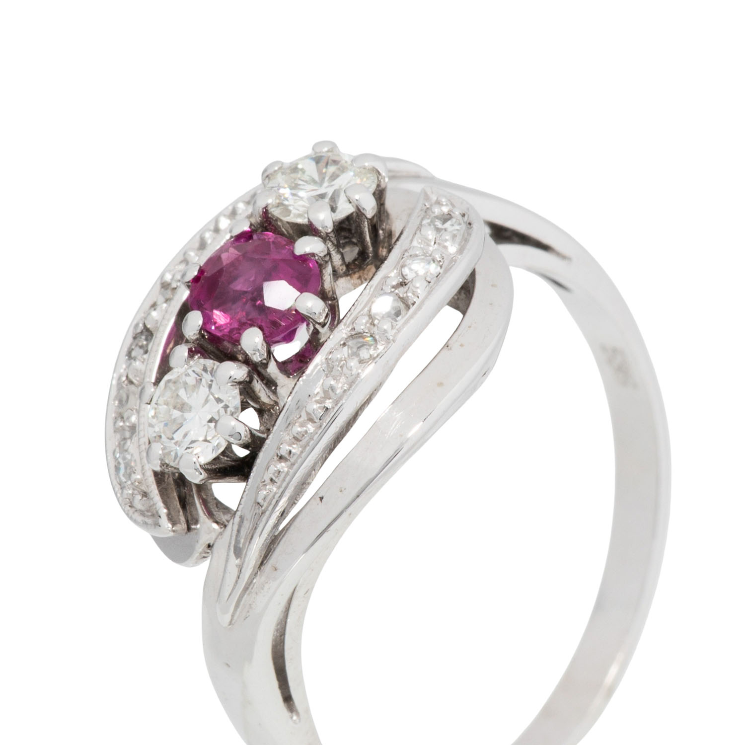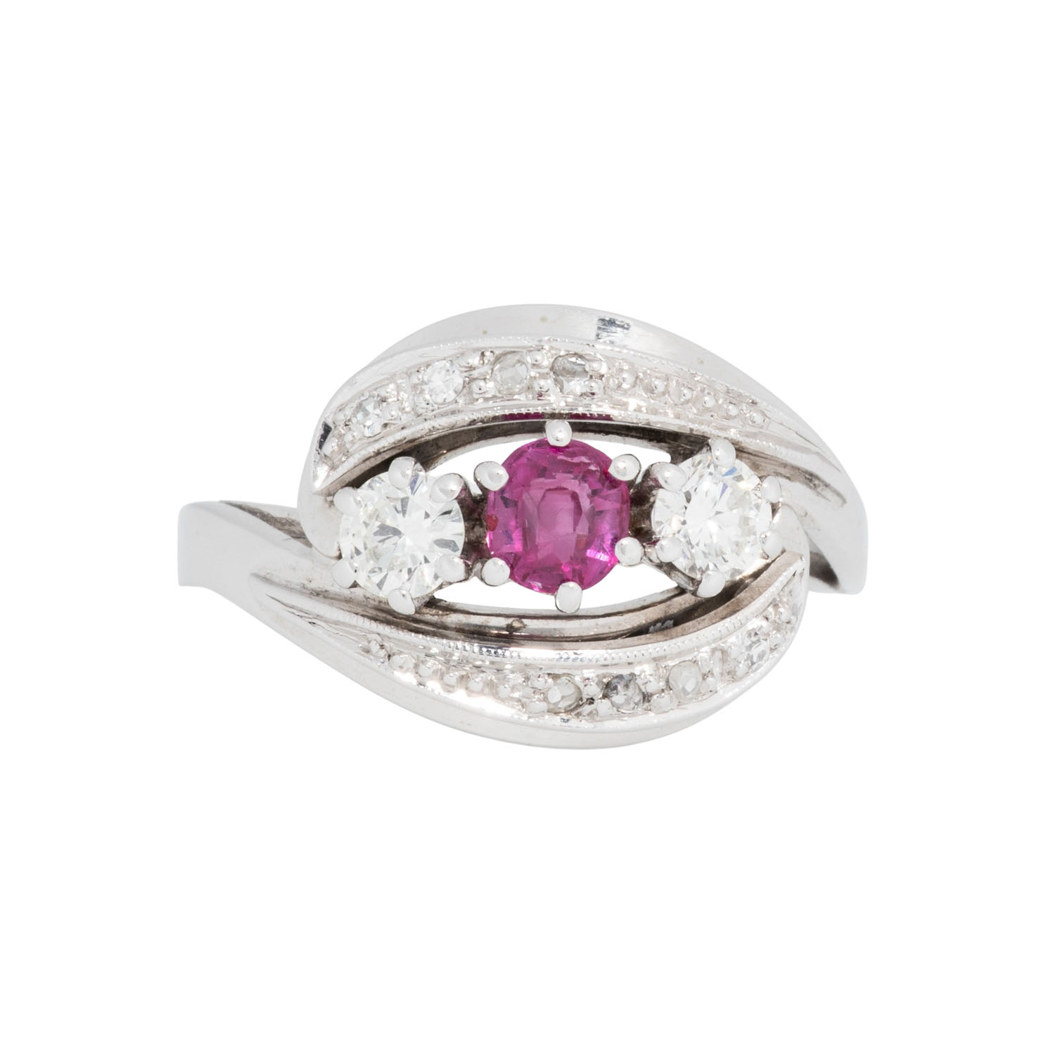 und 2 Brillanten, zus. ca. 0,4 ct, niedere Farbe, gute Reinheit, weiteren 8 Besatzdiamanten im Achtkant- und Rosen-Schliff, WG 14K, 4,0 g, RW 56, 2. Hälfte 20. Jh., Rubin Facettkanten minimal berieben, leichte Tragespuren.