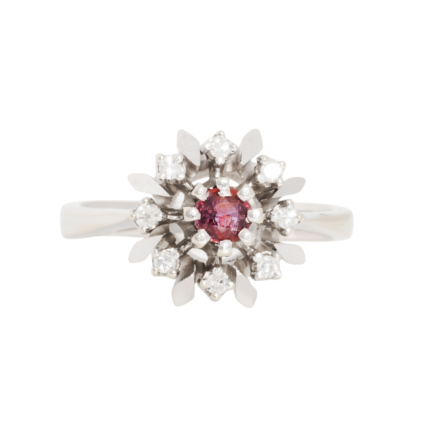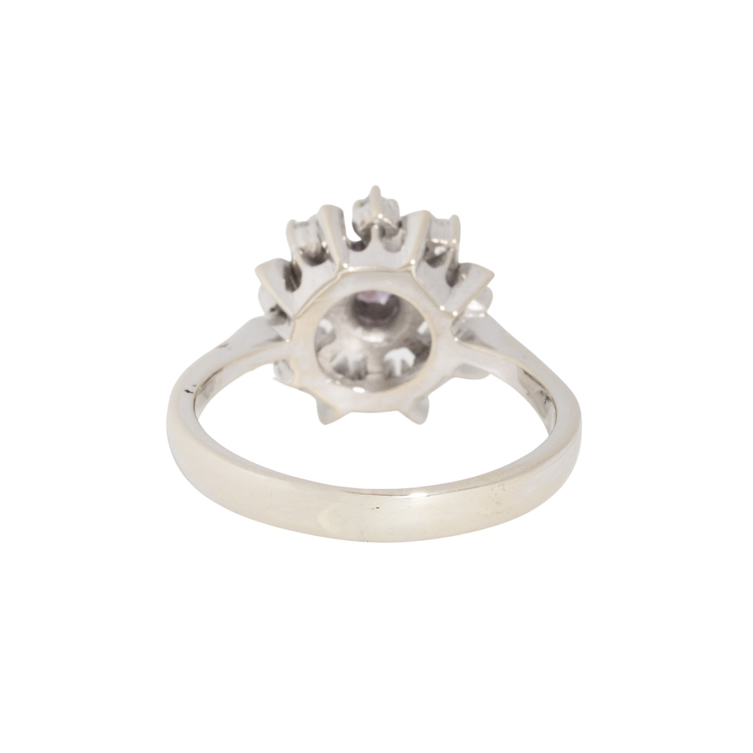 rund facettiert, ca. 3,5 mm, umgeben von 8 Achtkantdiamanten, ges. ca. 0,08 ct, WG 14K, 4,8 g, RW: 54, Ende 20. Jh., minimale Tragespuren.