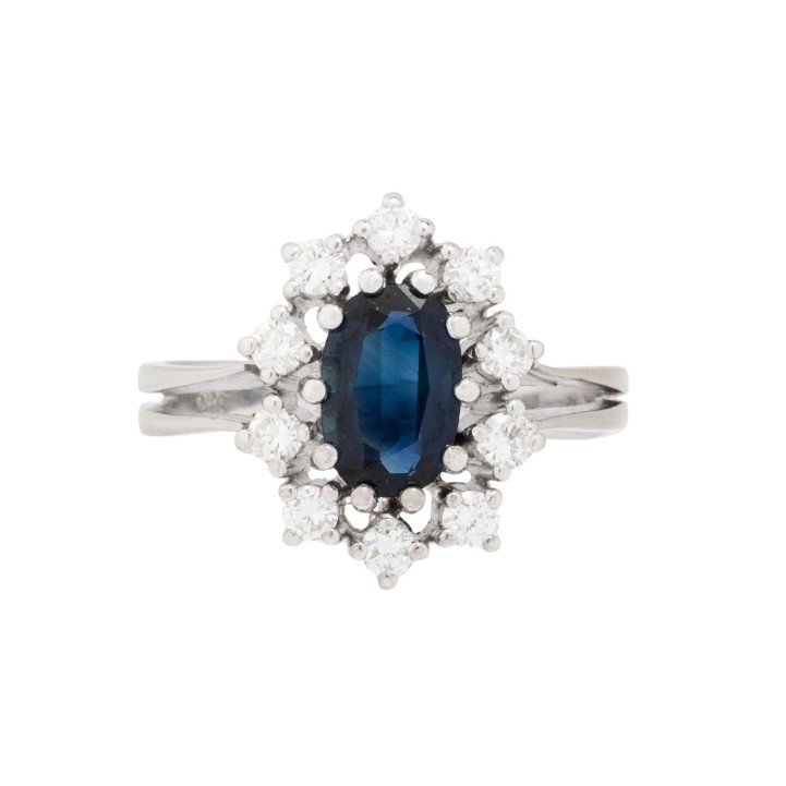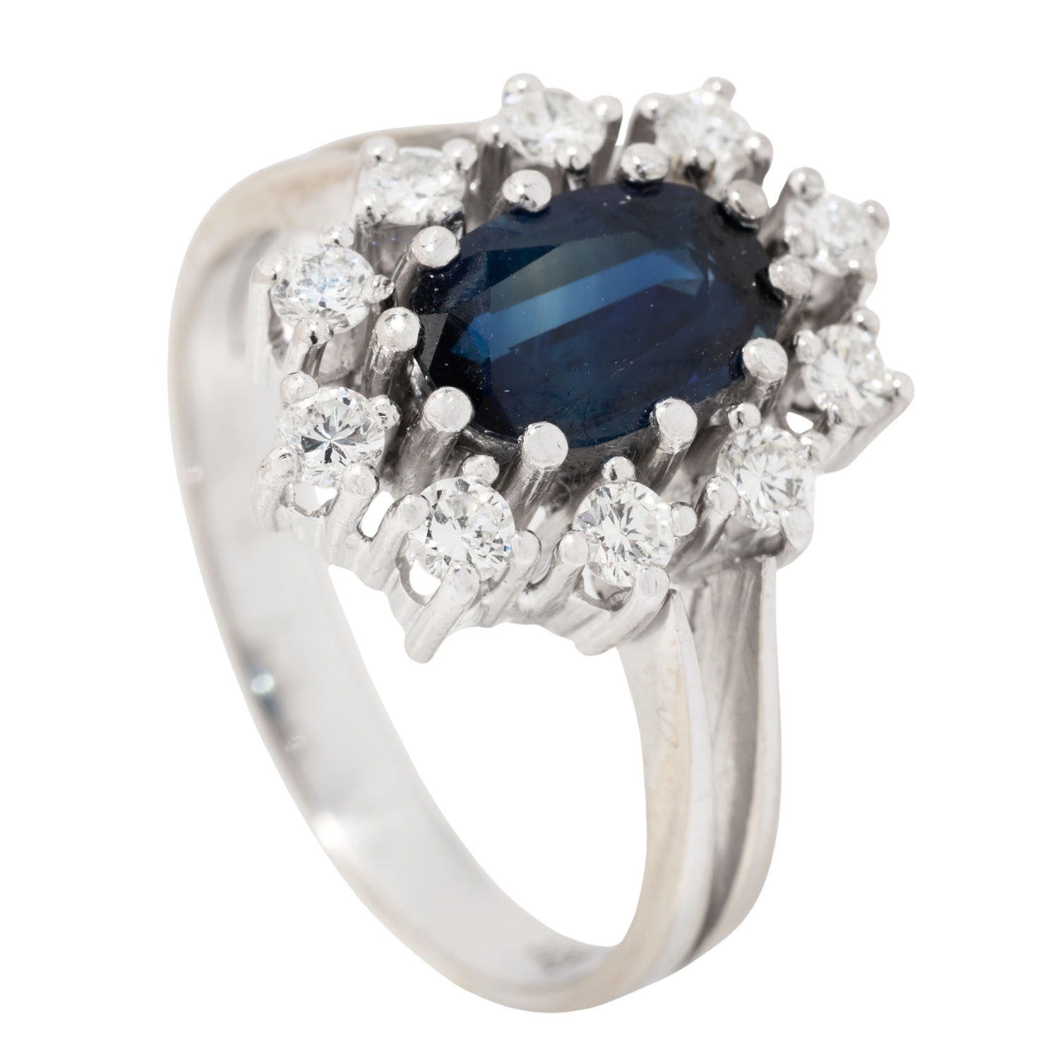entouriert von 10 Brillanten zus. ca. 0,50 ct, gute Farbe und Reinheit, WG 14K, 6,2 g, RW: 61, 2. H. 20. Jh., leichte Tragespuren.