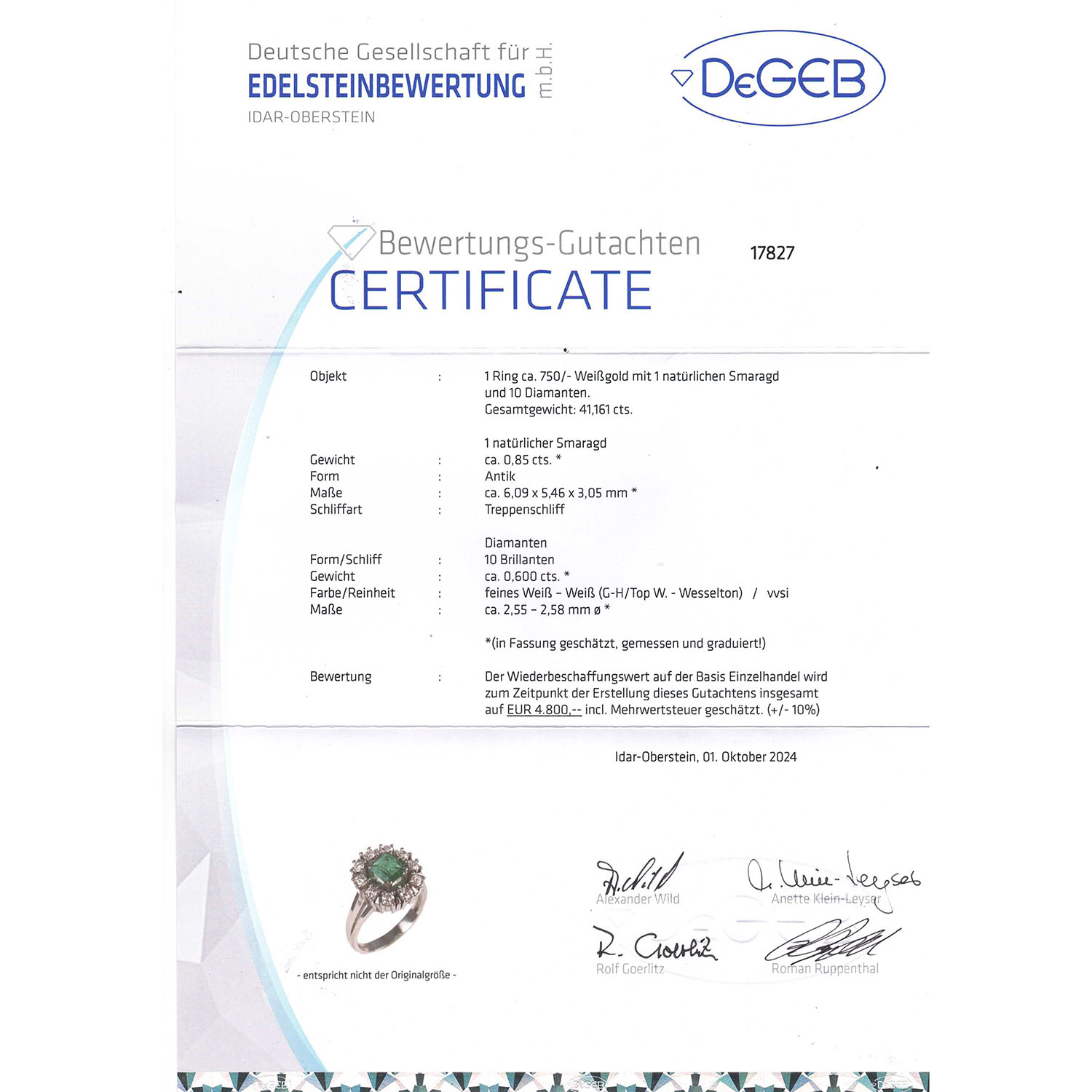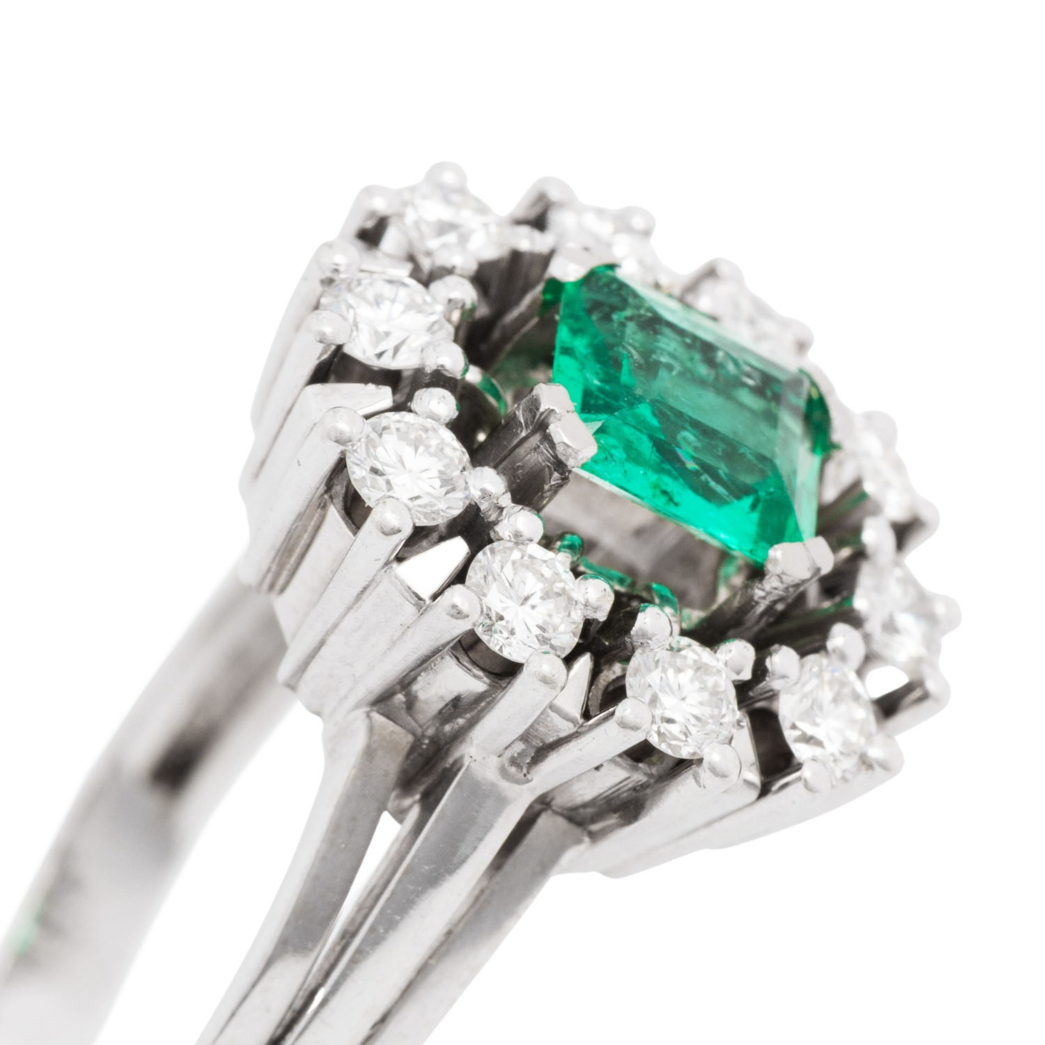 Achtecktreppenschliff, ca. 6,1 x 5,4 mm, 10 Brillanten, ges. ca. 0,53 ct, FW (F-G)/IF, WG 18K, 8,2 g, RW: 55, 1977, minimale Tragespuren, Zubehör: Bewertungsgutachten 17827 Dt. Ges. für Edelsteinbewertung, 2024, Qualitätsbescheinigung/Rechnung (1977, Copie), Mayer, Ludwigsburg.