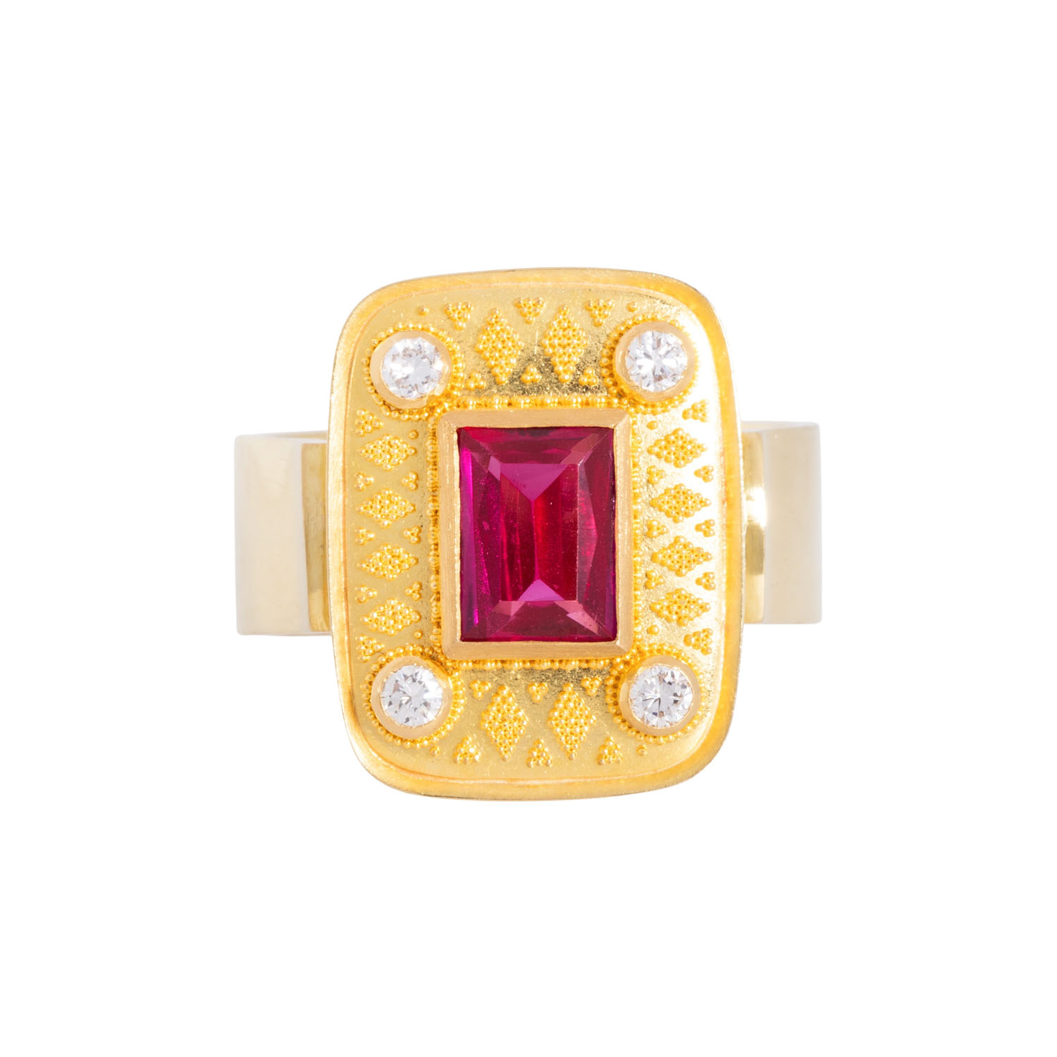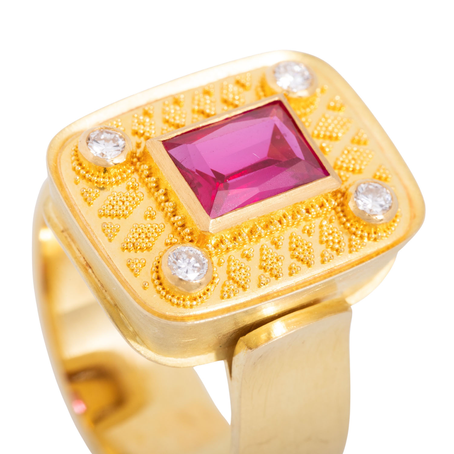 und 4 Brillanten von zus. ca. 0,20 ct mit guter Farbe und Reinheit, GG 18K, 13,4 gr, RW 61, 2. Hälfte 20. Jh., Tragespuren vorhanden, feine Granulationstechnik.