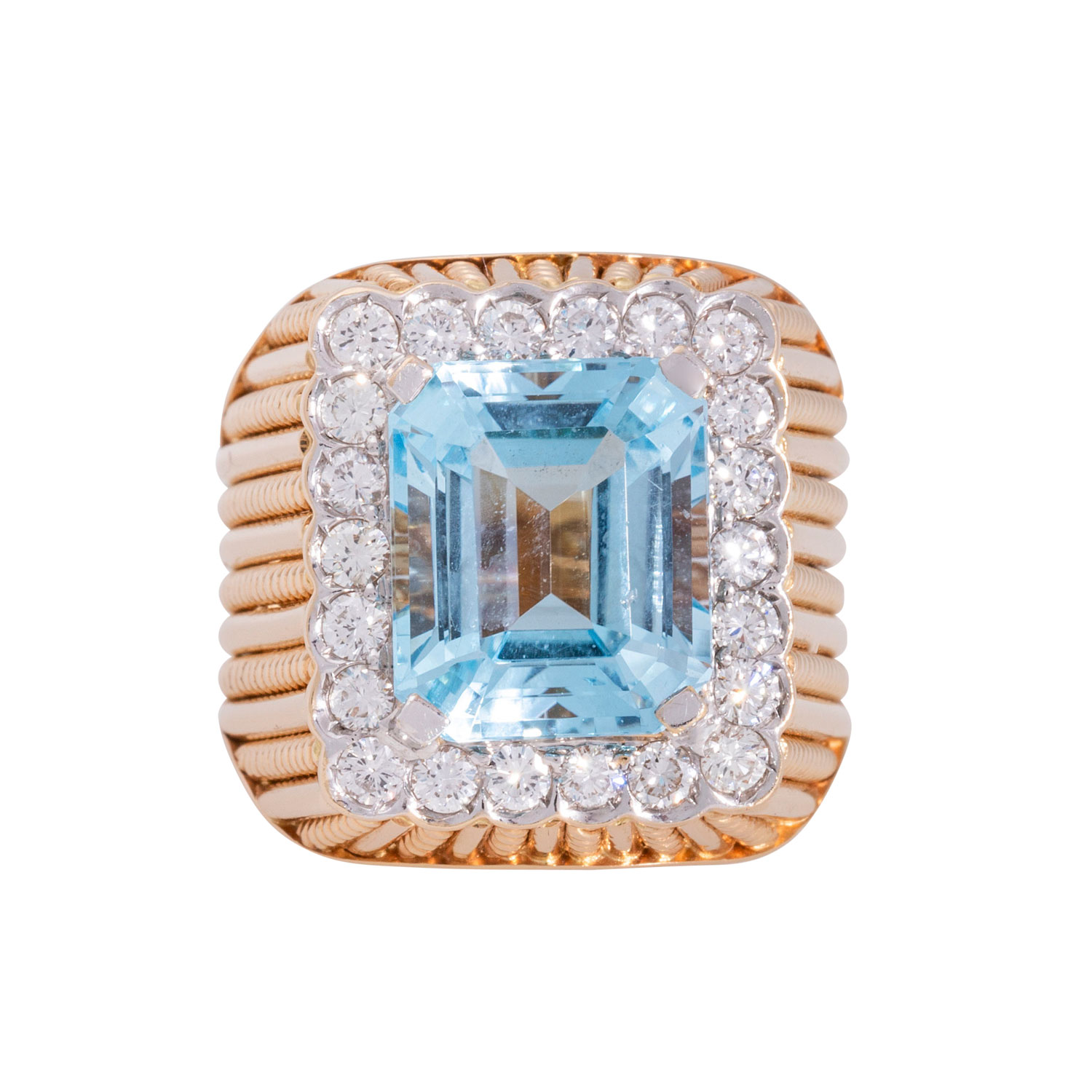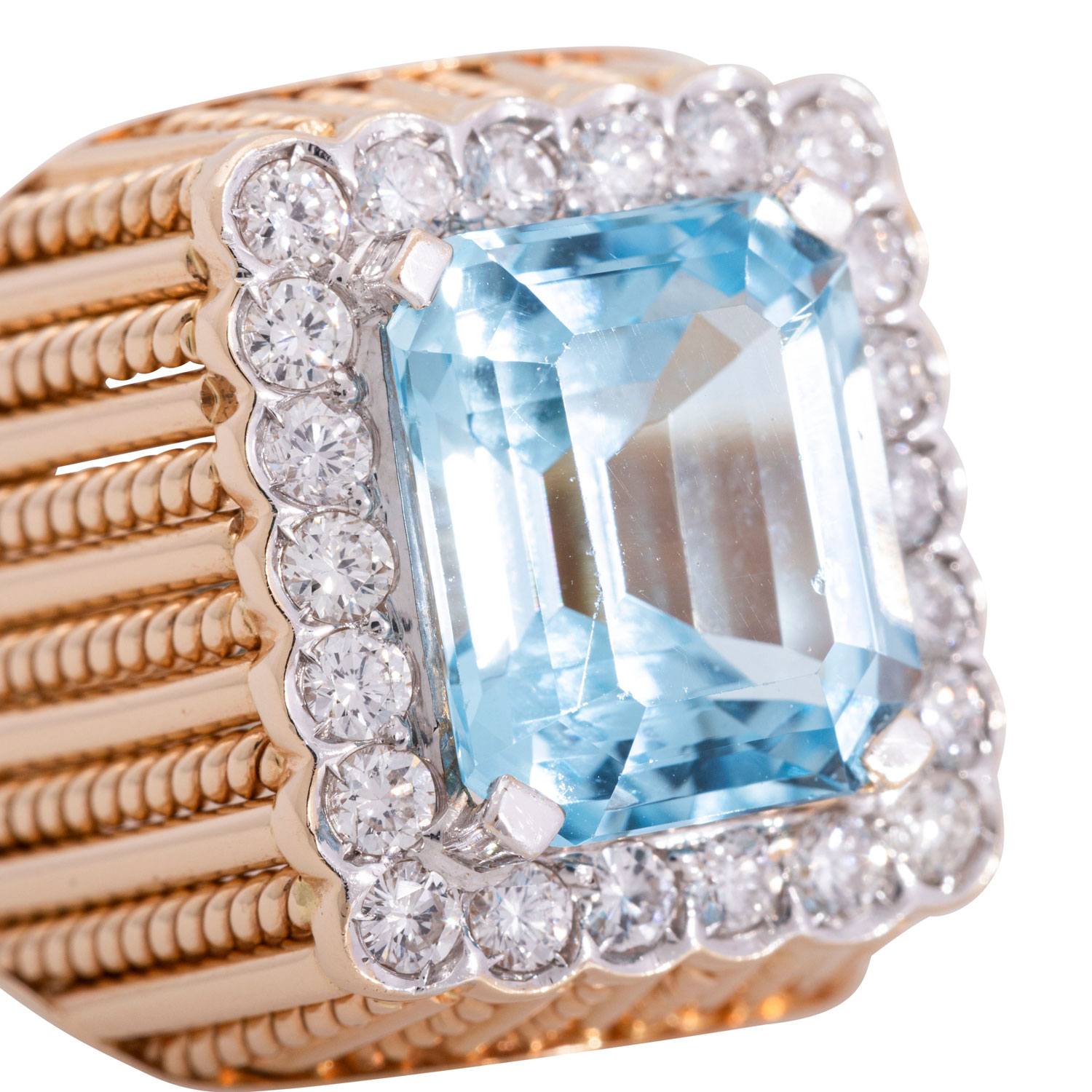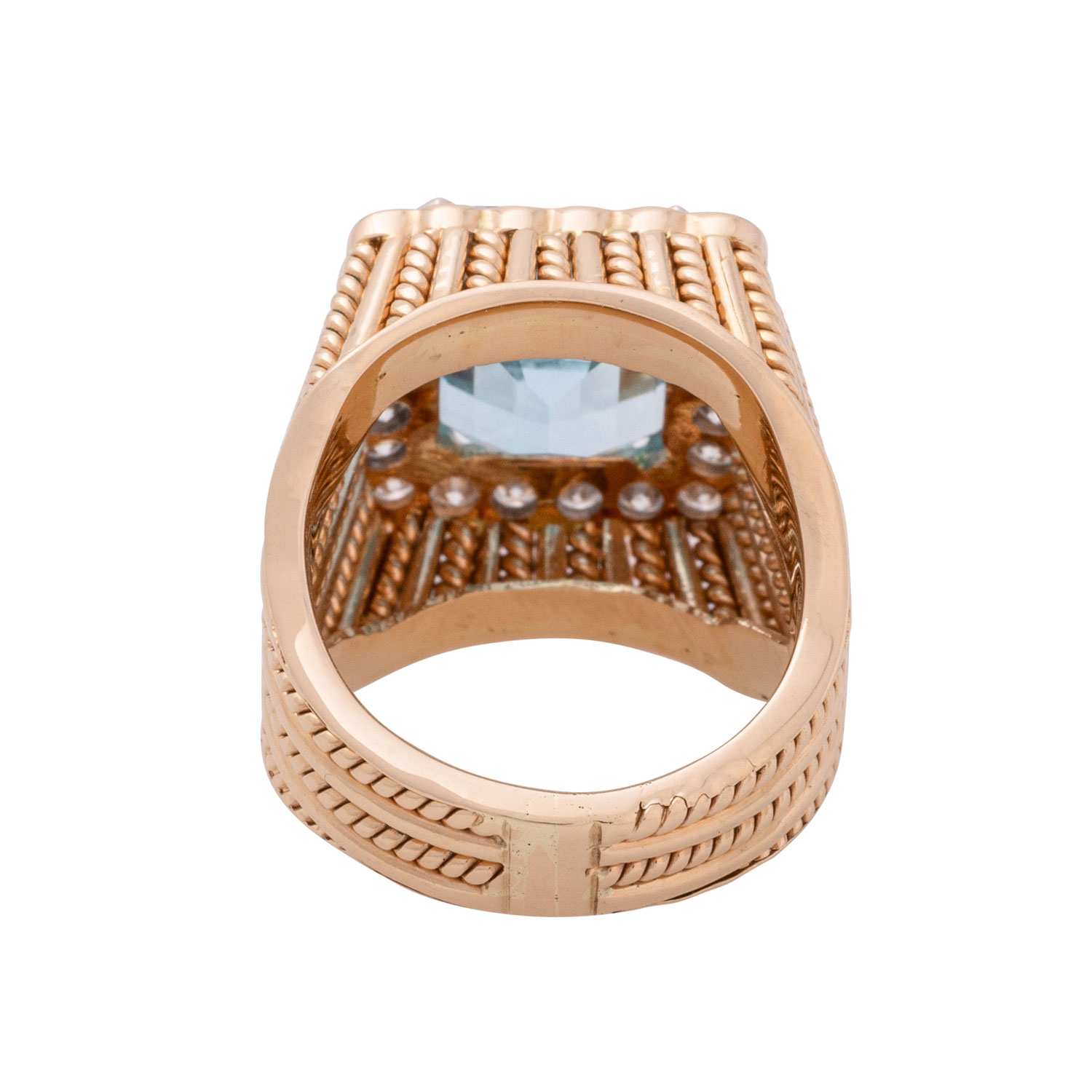 ca. FW-LGW (G-I)/VS, Topas im achteckigen Treppenschliff, 1 Facettkante min. bestoßen, GG 18K, 15,5 g, RW: 50, solider Mantelring strukturiert durch Kordeldraht, Ende 20. Jh., guter Erhalt, schwere Ausführung.