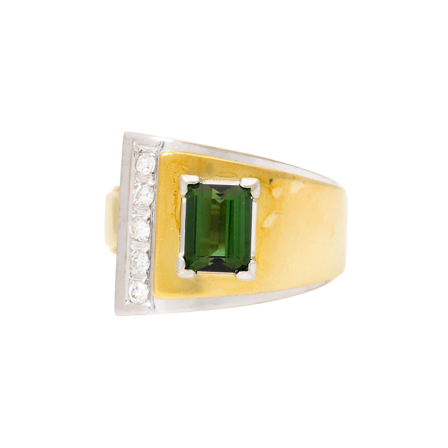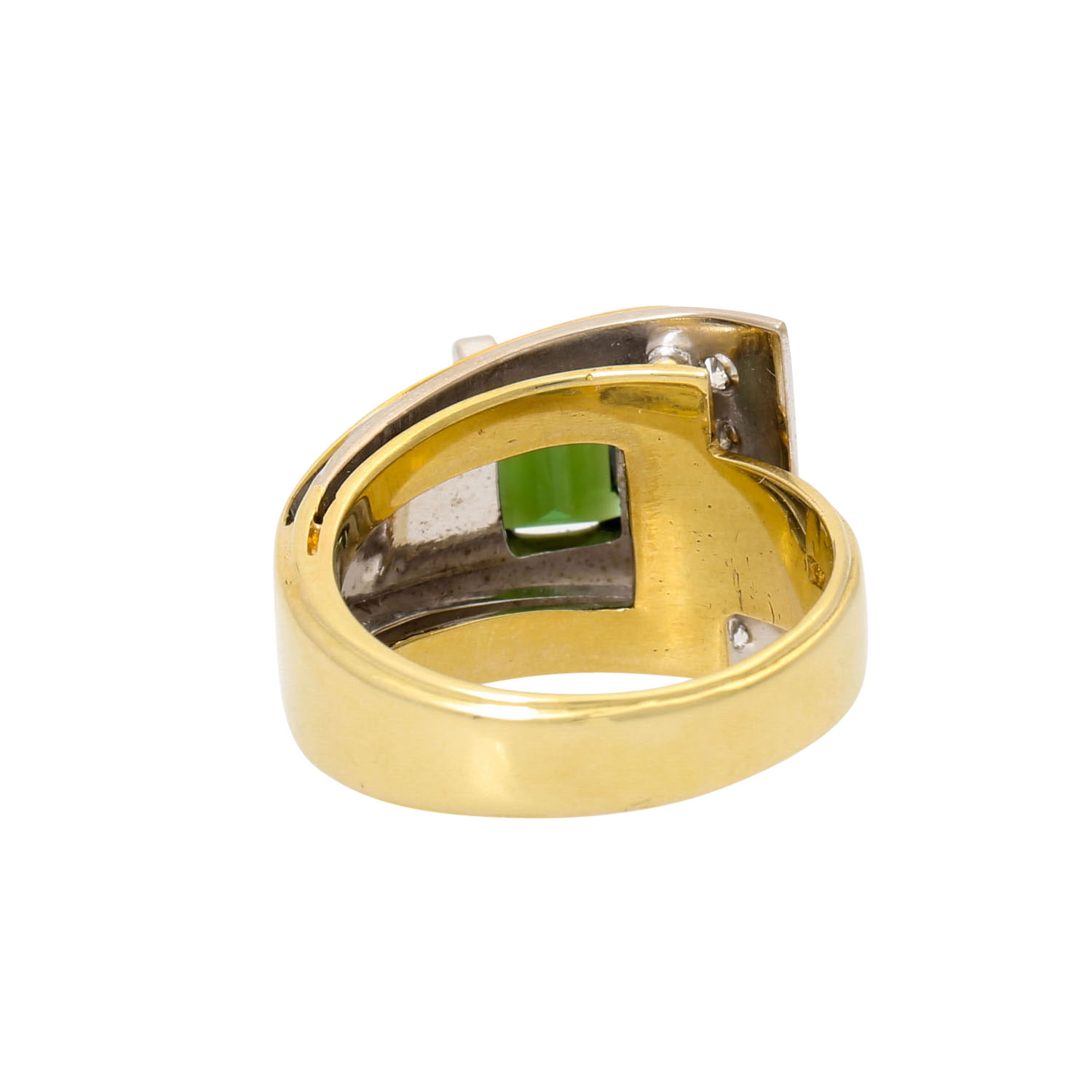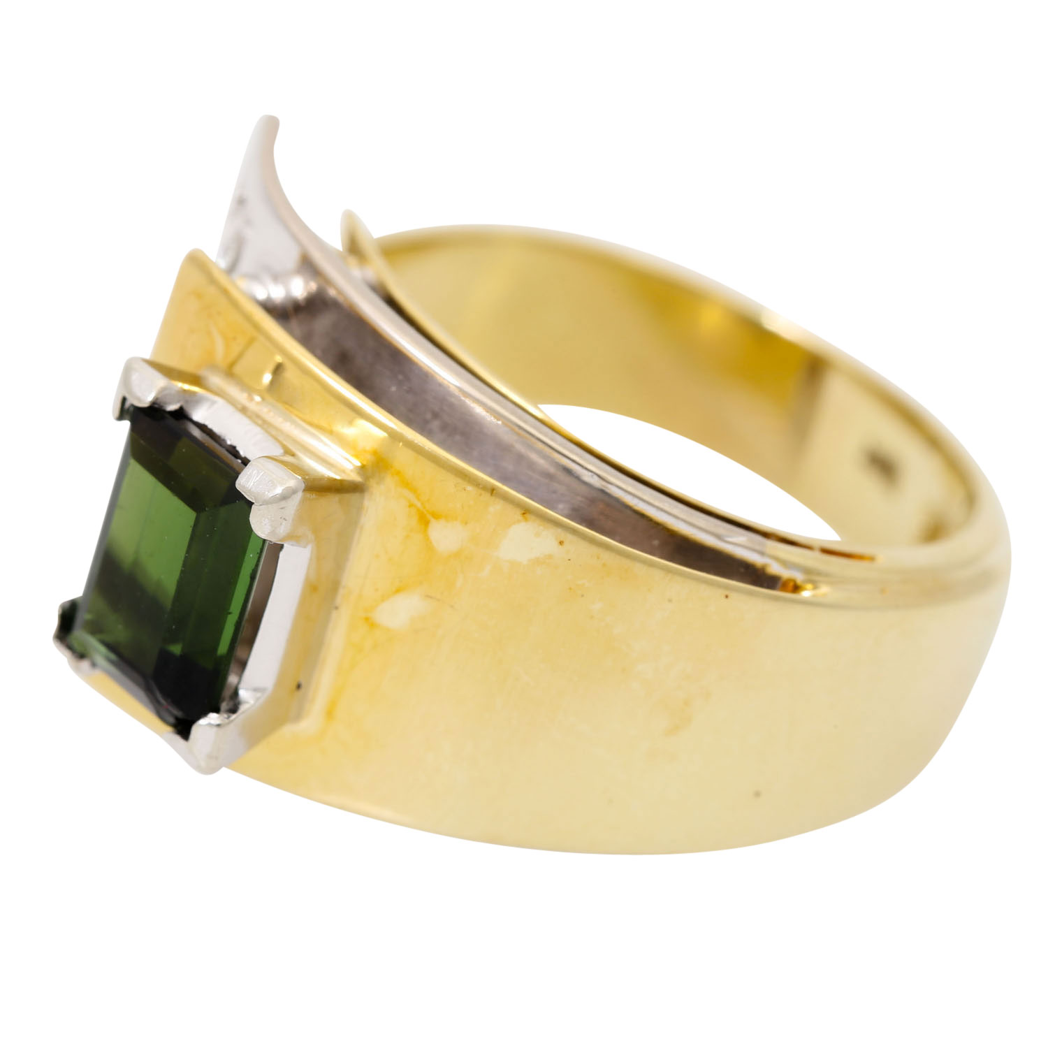 gute Farbe und sehr gute Reinheit, grüner Turmalin im rechteckigen Treppenschliff (1 Ecke bestoßen), GG/WG 14K, 9,2 g, RW: 53, Ende 20. Jh., leichte Tragespuren.