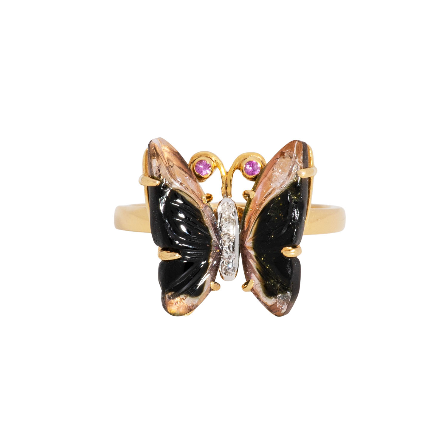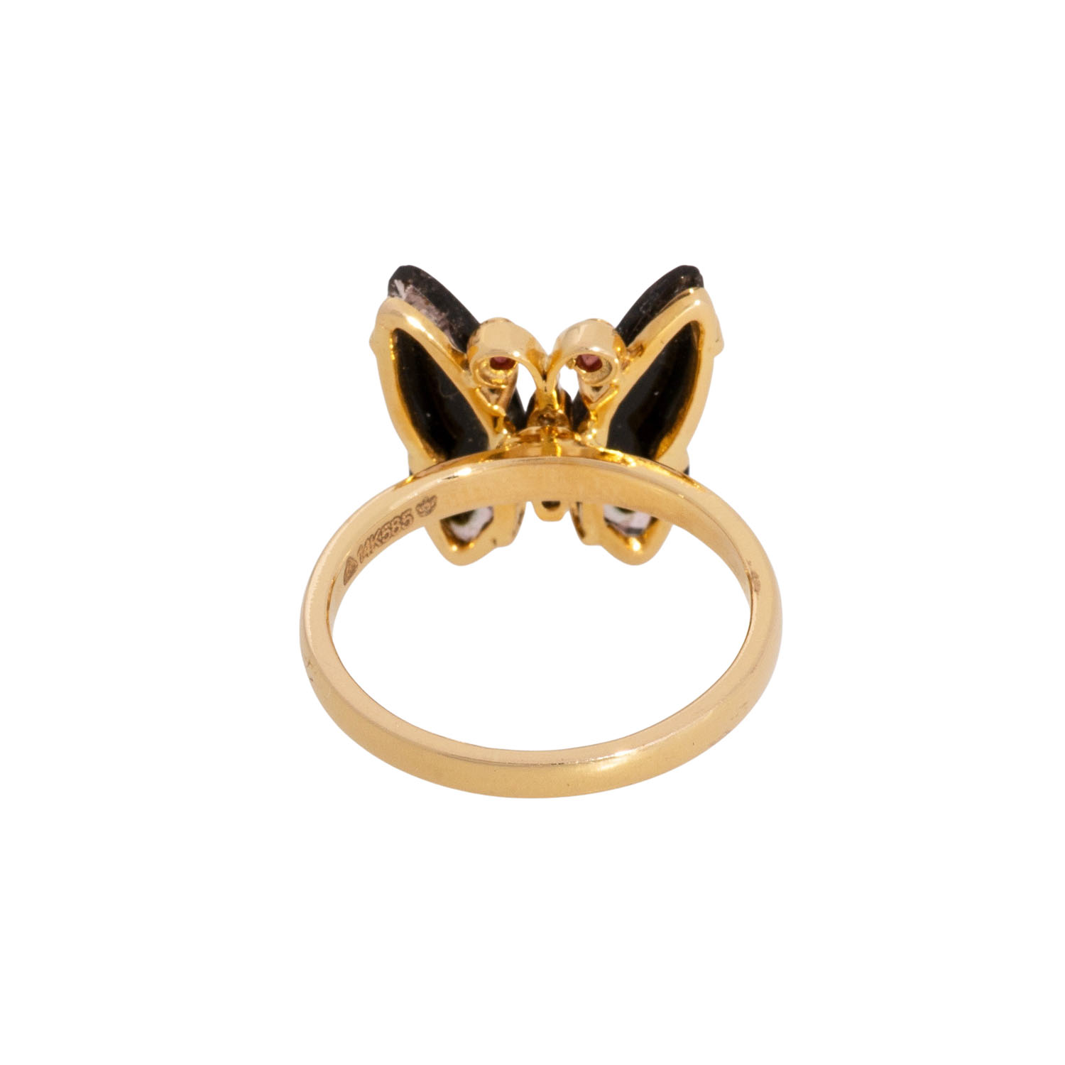 'Butterfly' Ring, with 2 rubies, 5 diamonds, YG 14 K, 4.3 g, ring size 55, 21st century, mint condition.