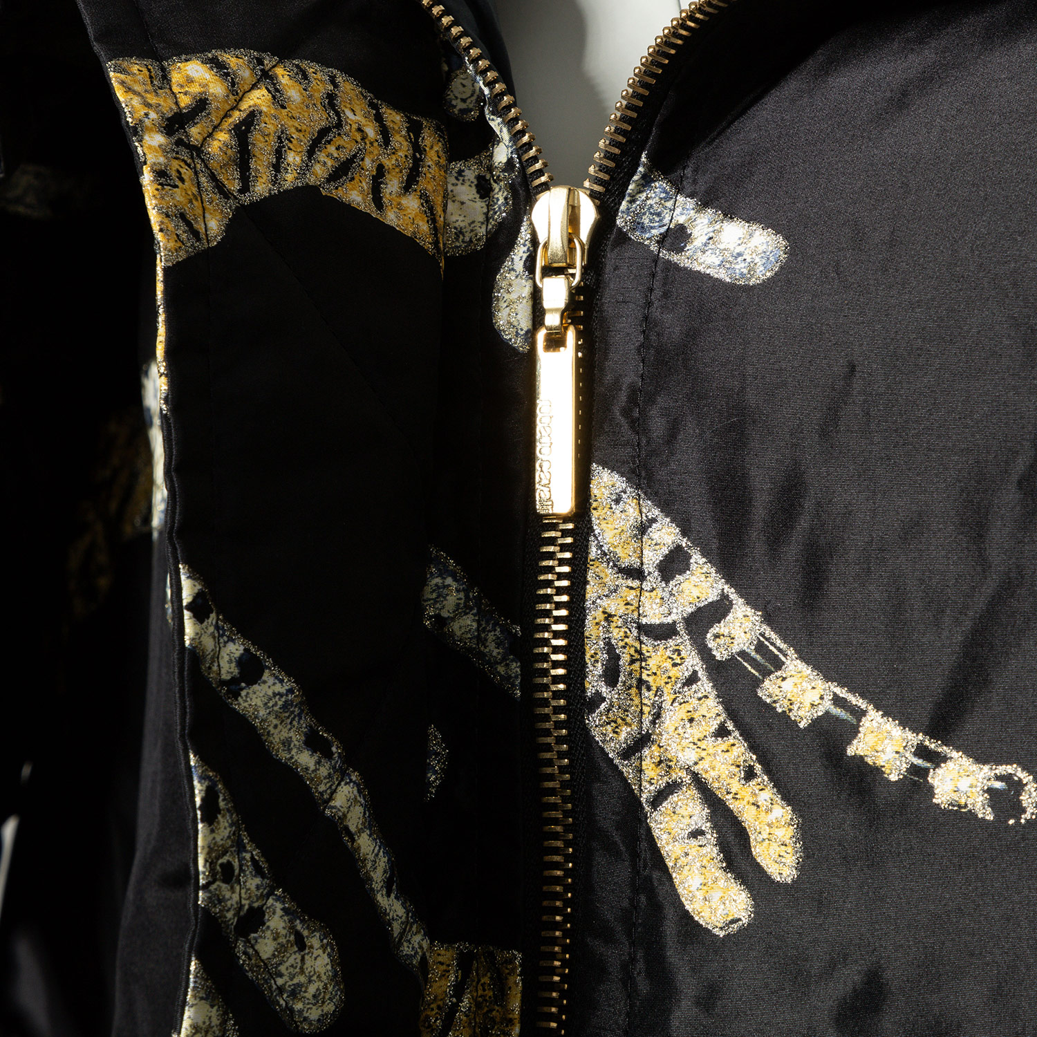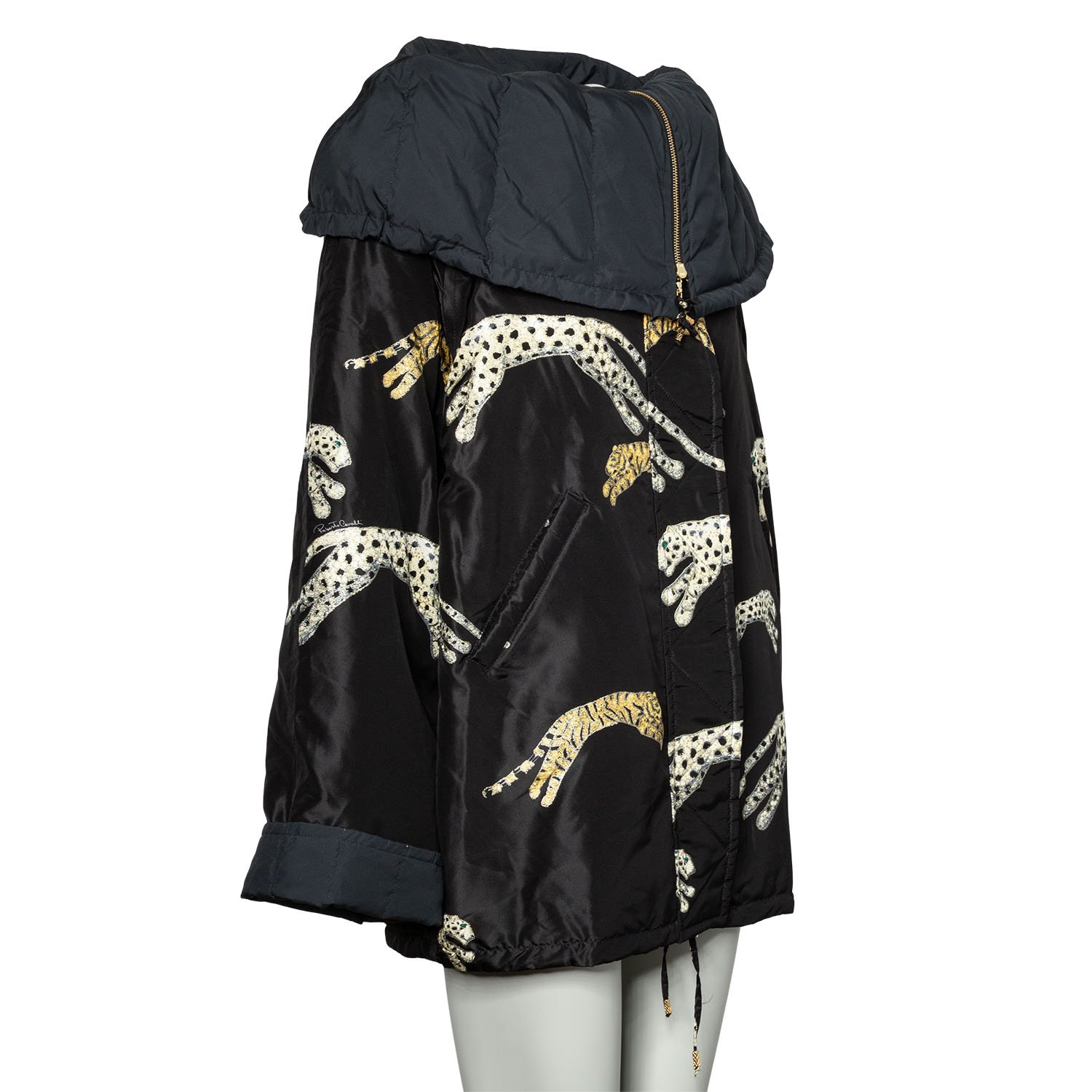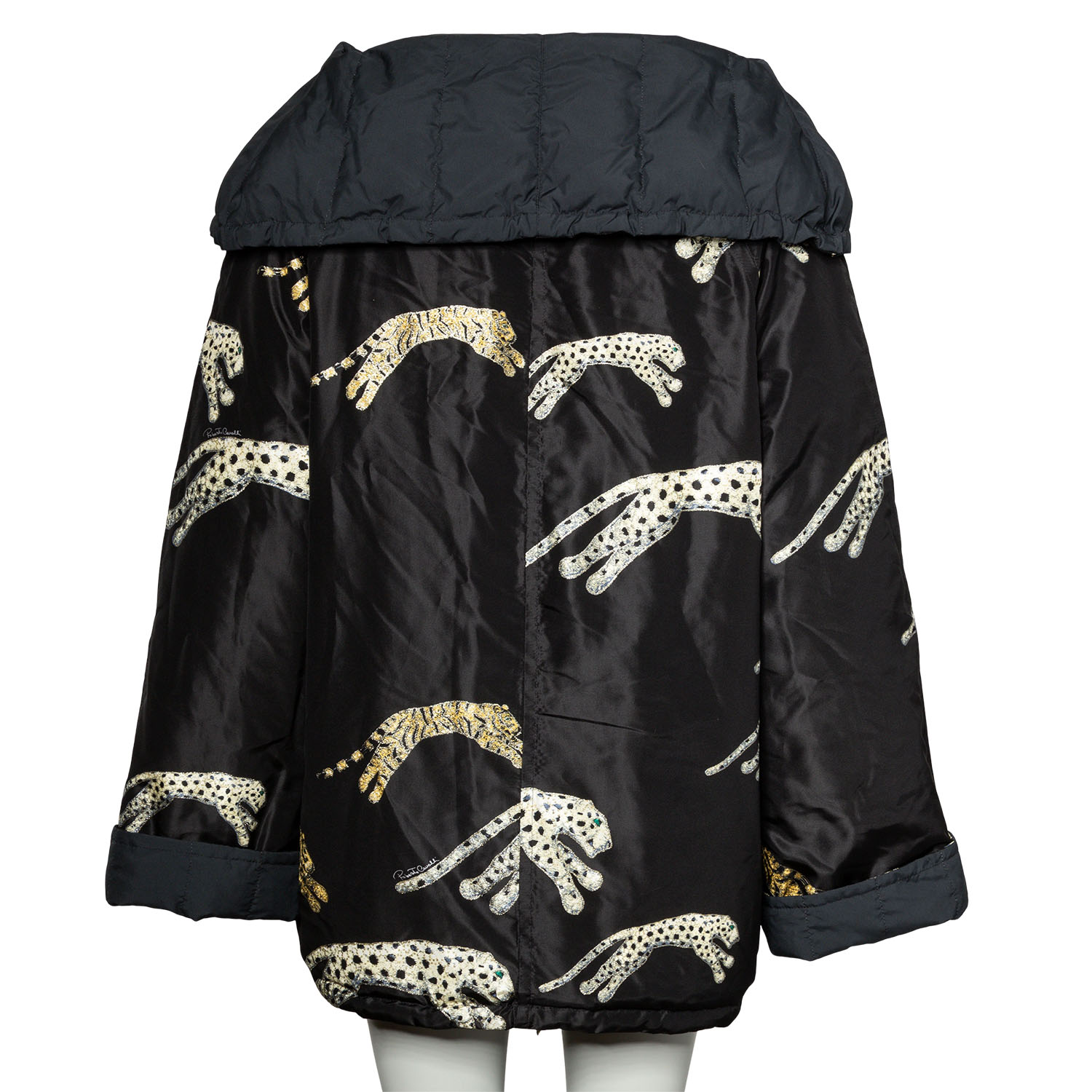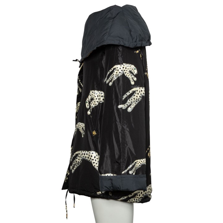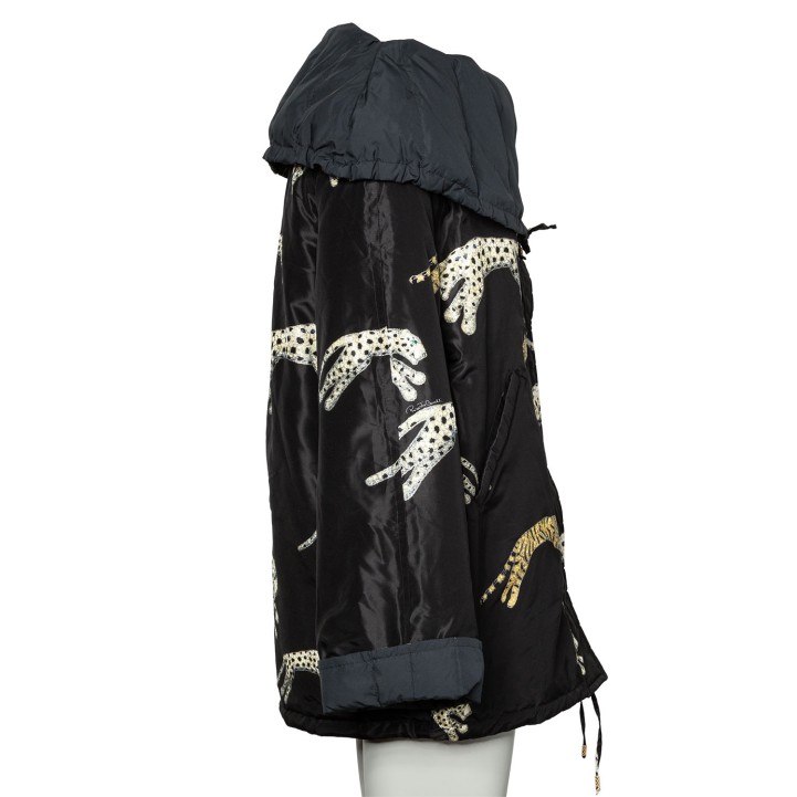 Herbst/Winter Kollektion 2002. Sammlerstück. Wattierter Blouson in Schwarz mit breitem Schalkragen, verdecktem Reißverschluss und dekorativem Gepard Patches. Leichte Altersspuren vorhanden, dennoch schöner Erhaltungszustand.