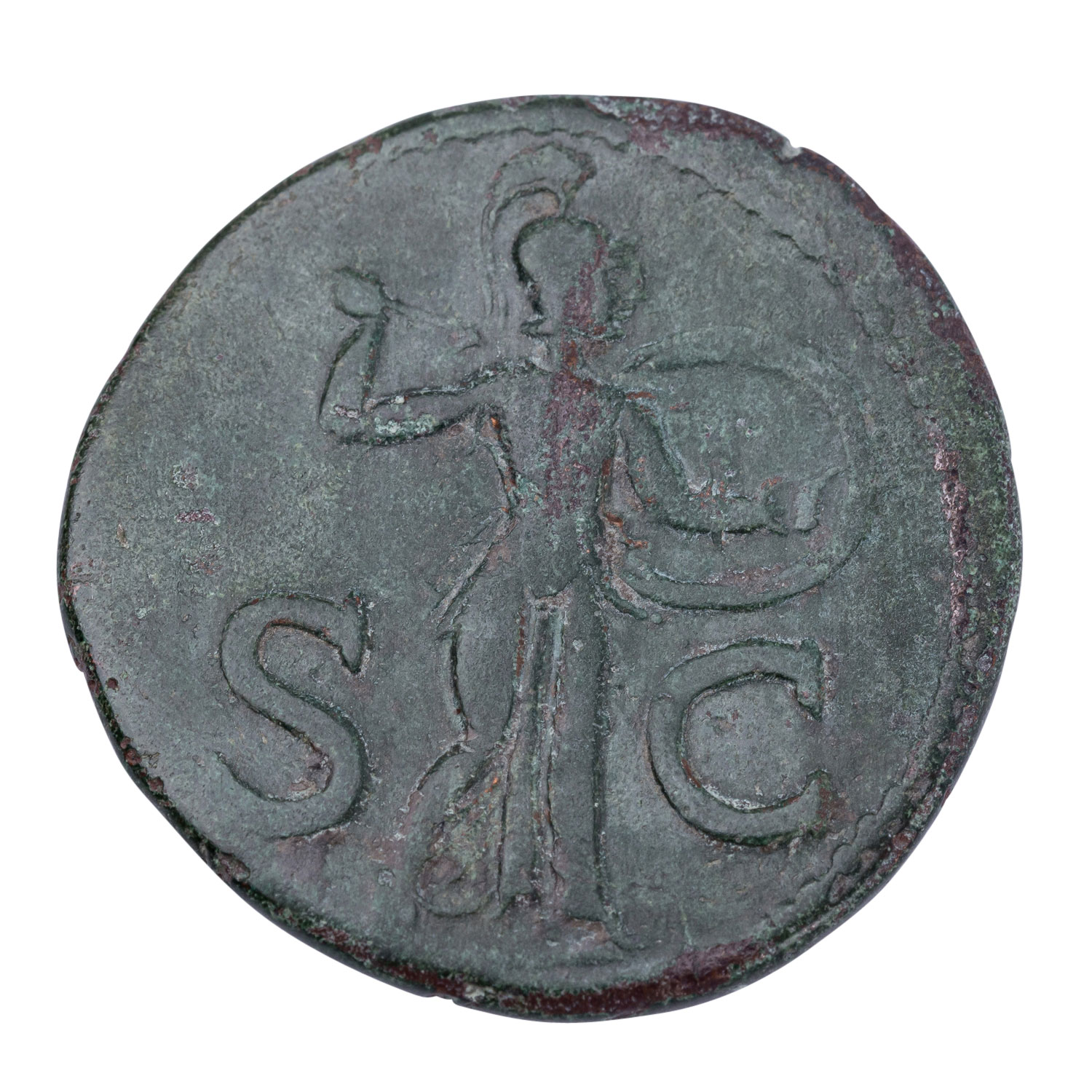 Av: Büste des Kaisers Claudius, Rv: stehende Minerva mit Speer und Schild, s-ss, stark berieben, Patina, Kratzer, korrodiert, 9,5g rau. Mit Zertifikat.