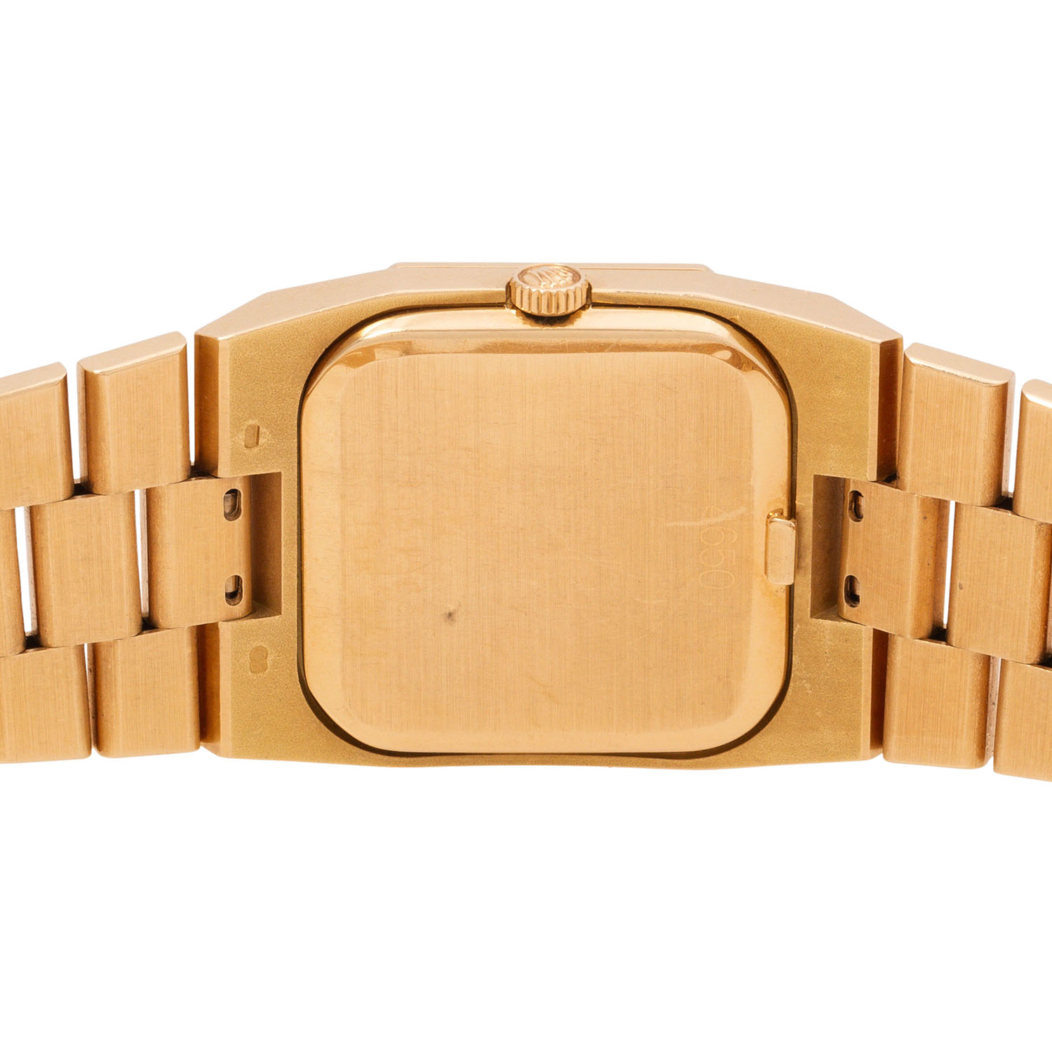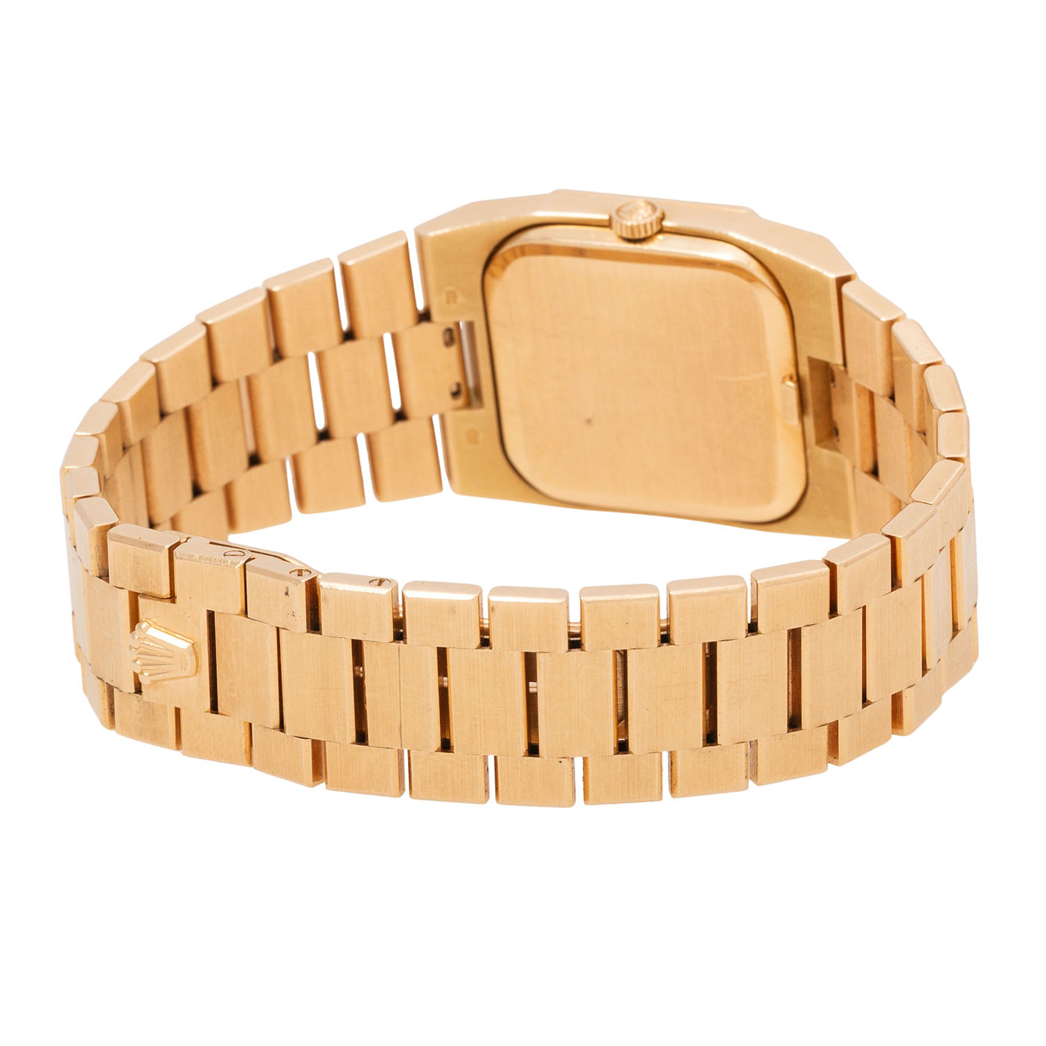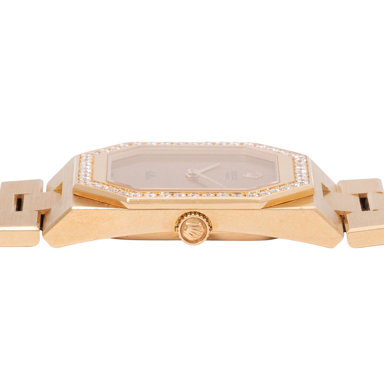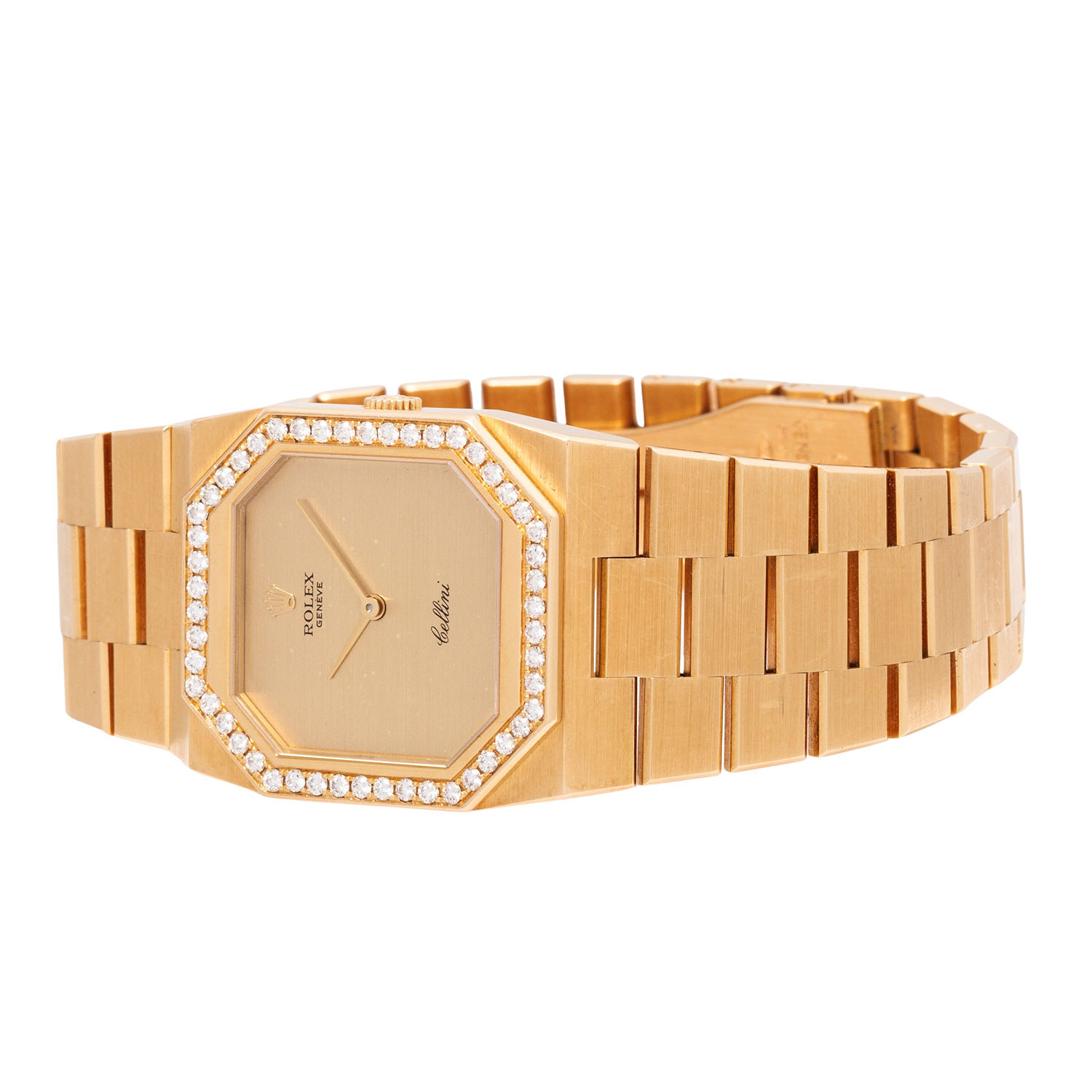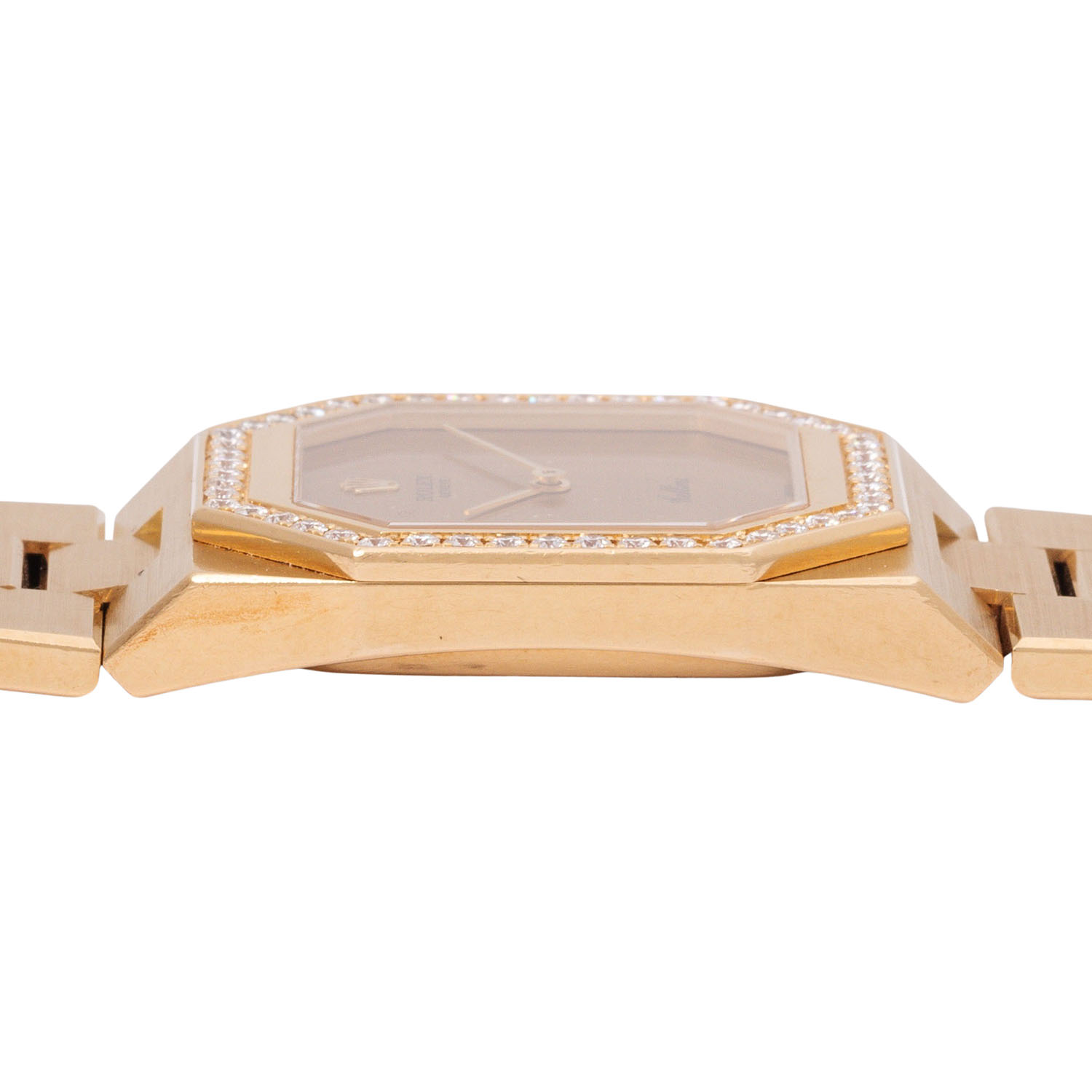 18K Gebgold. Handaufzugswerk Kal. 1601 mit sehr guten Gangwerten (+7s/d. 299°). Goldfarbenes Zifferblatt. Rolex Armband in 18K Gebgold mit Faltschließe. Lünette octagonal und ab Werk mit Diamanten besetzt. Guter Vintage Zustand mit sichtbaren Tragespuren am Gehäuse, Band und Zifferblatt (mit kleinen Flecken). Durchmesser ca. 27 mm ohne Krone. Passend bis zu ca. 18 cm Handgelenkumfang.