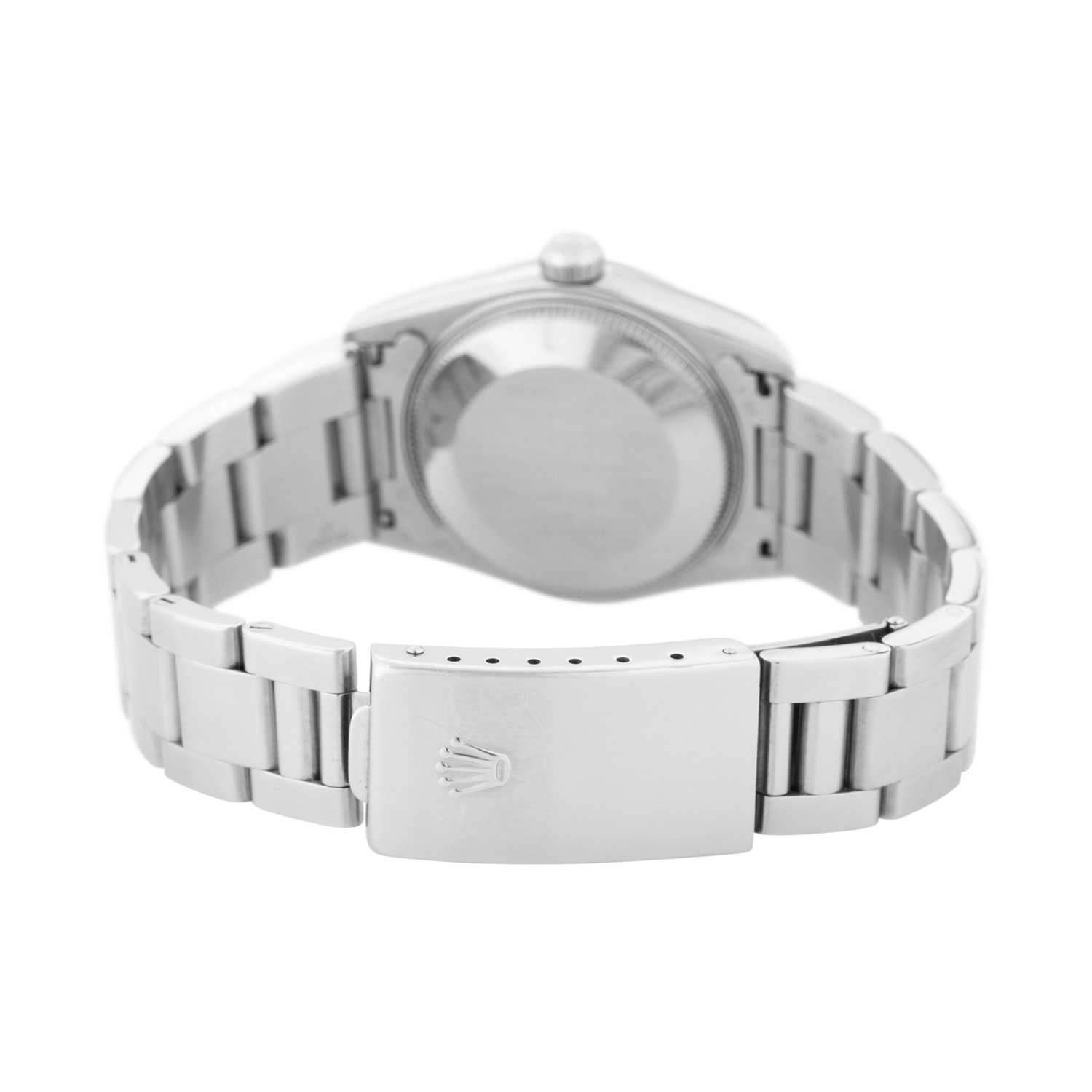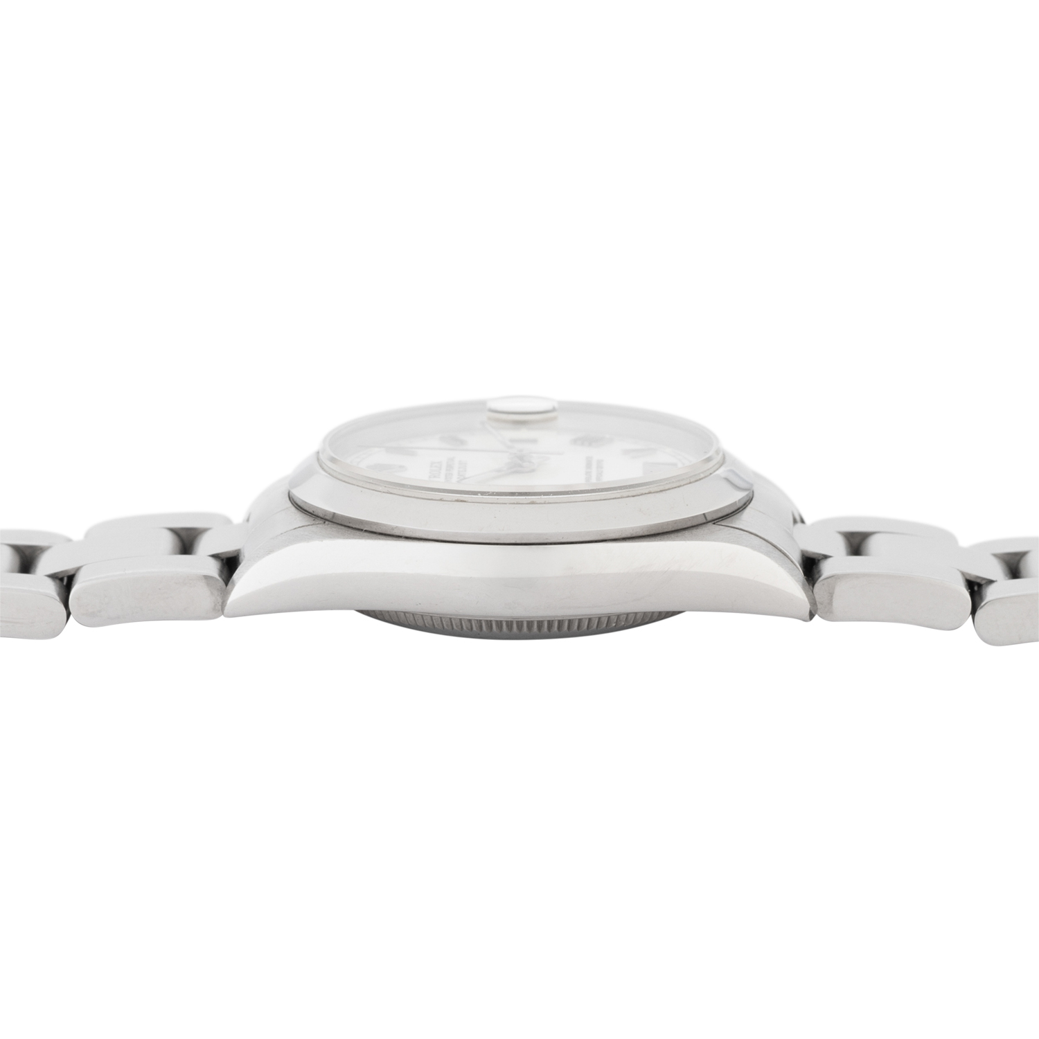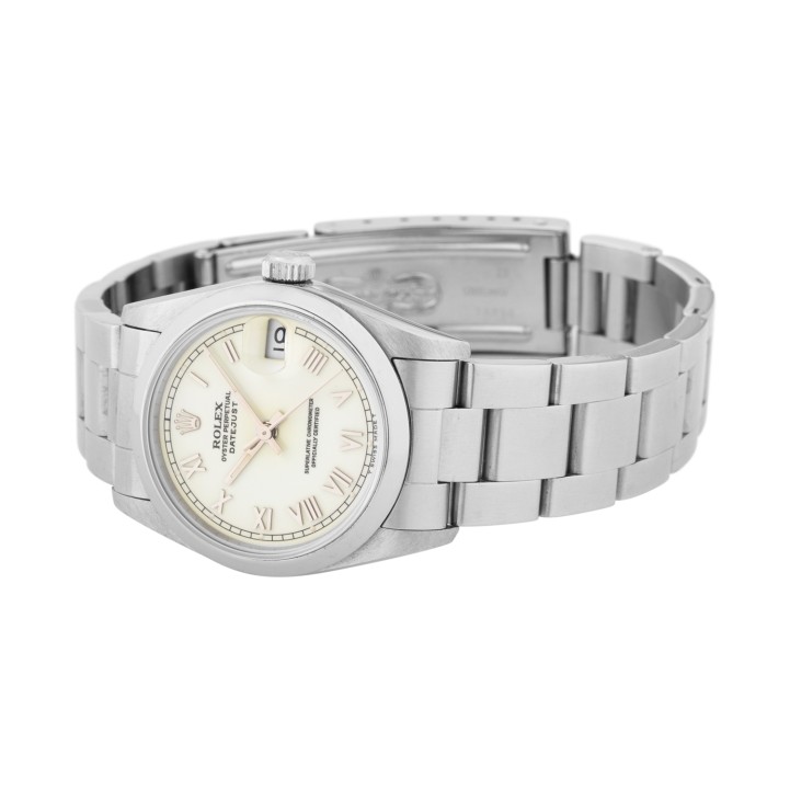 Edelstahl. Seriennummer T507380. Automatik-Werk Kal. 2135 mit guten Gangwerten (+8 s/d. 247° Amplitude). Eierschalenfarbenes Tritium Zifferblatt mit aufgesetzten römischen Ziffern, Eisenbahnminuterie und Datumsanzeige. Rolex Oyster Armband (leichter Stretch) mit Faltschließe. Guter Zustand mit Tragespuren. Original Box (ohne Kissen), Anleitung, Card Folder, Hang Tag, Kalender von 1997 / 1998, Übersetzungsheft und Garantiezertifikat anbei. Gekauft im Mai 1997 bei Juwelier Kittel in Aurich. Durchmesser ca. 31 mm (gemessen ohne Krone). Passend bis zu ca. 19 cm Handgelenkumfang.