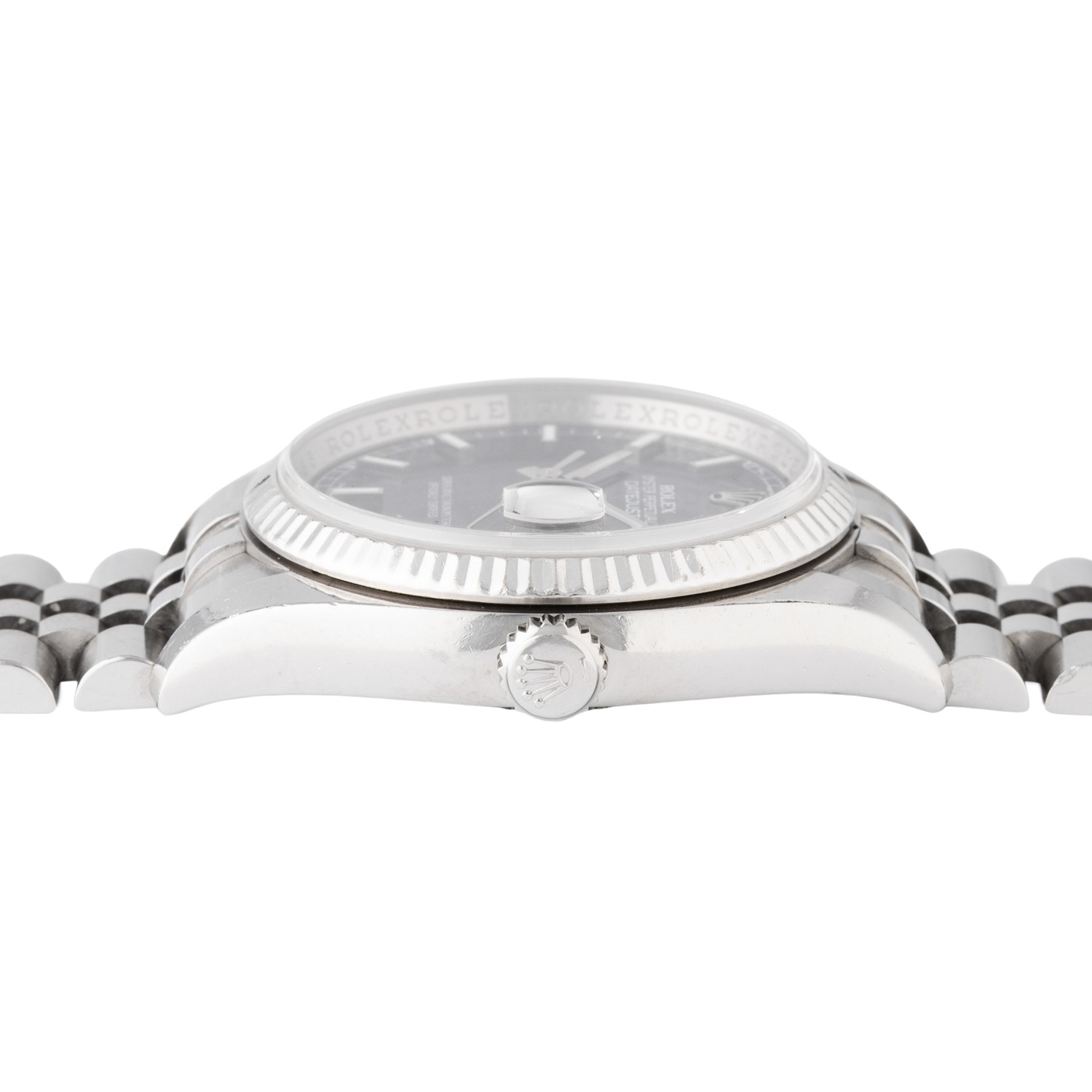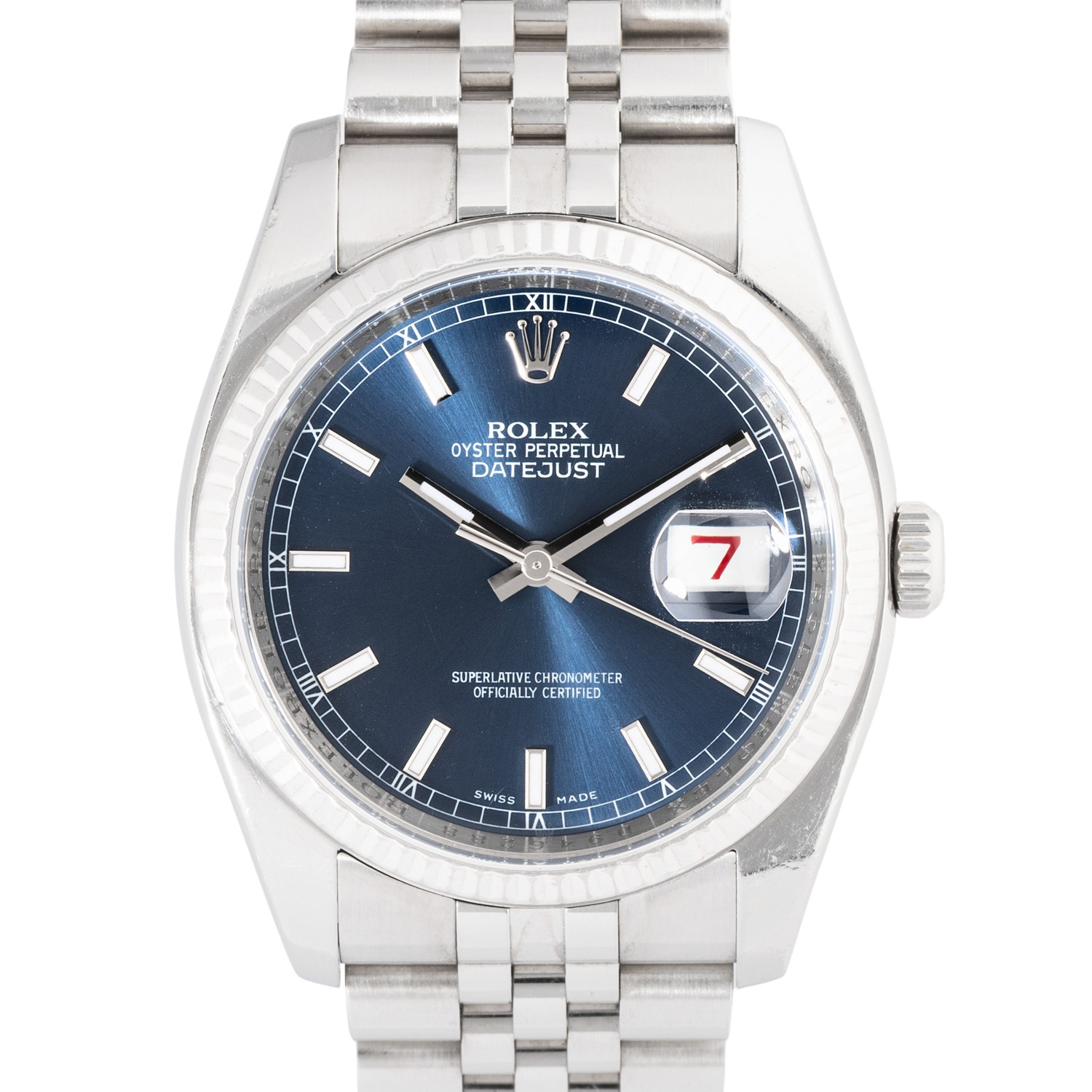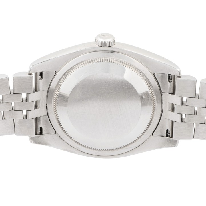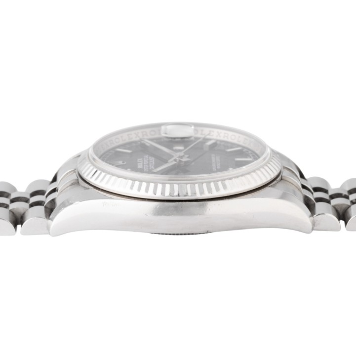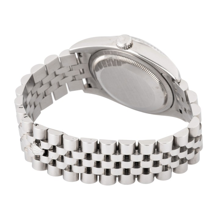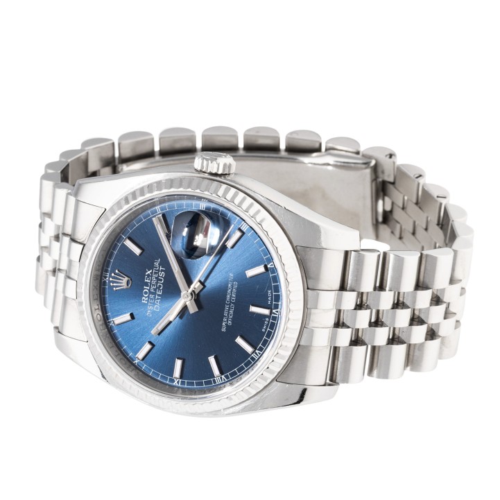 Edelstahl / Weißgold. Seriennummer D946288. Automatik-Werk Kal. 3135 mit sehr guten Gangwerten (+4 s/d. 314° Amplitude). Blaues Zifferblatt mit Sonnenschliff, aufgesetzten Indizes, Eisenbahnminuterie mit römischen Ziffern und Roulette-Datumsanzeige. Geriffelte Lünette aus Weißgold. Rolex Jubilee Armband (mit Stretch) mit Faltschließe. Guter Zustand mit sichtbaren Tragespuren am Gehäuse, Lünette und Armband. Durchmesser ca. 36 mm (gemessen ohne Krone). Passend bis zu ca. 17,5 cm Handgelenkumfang.