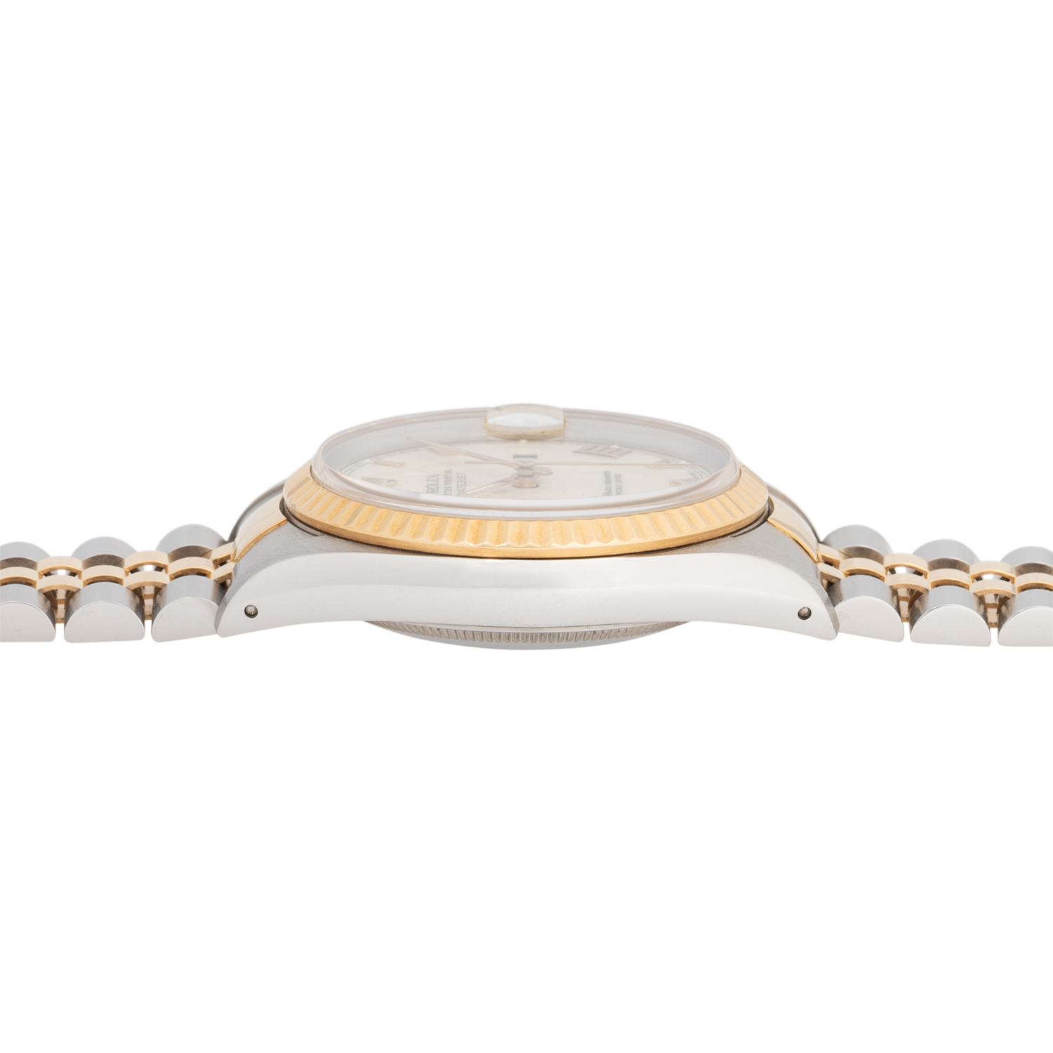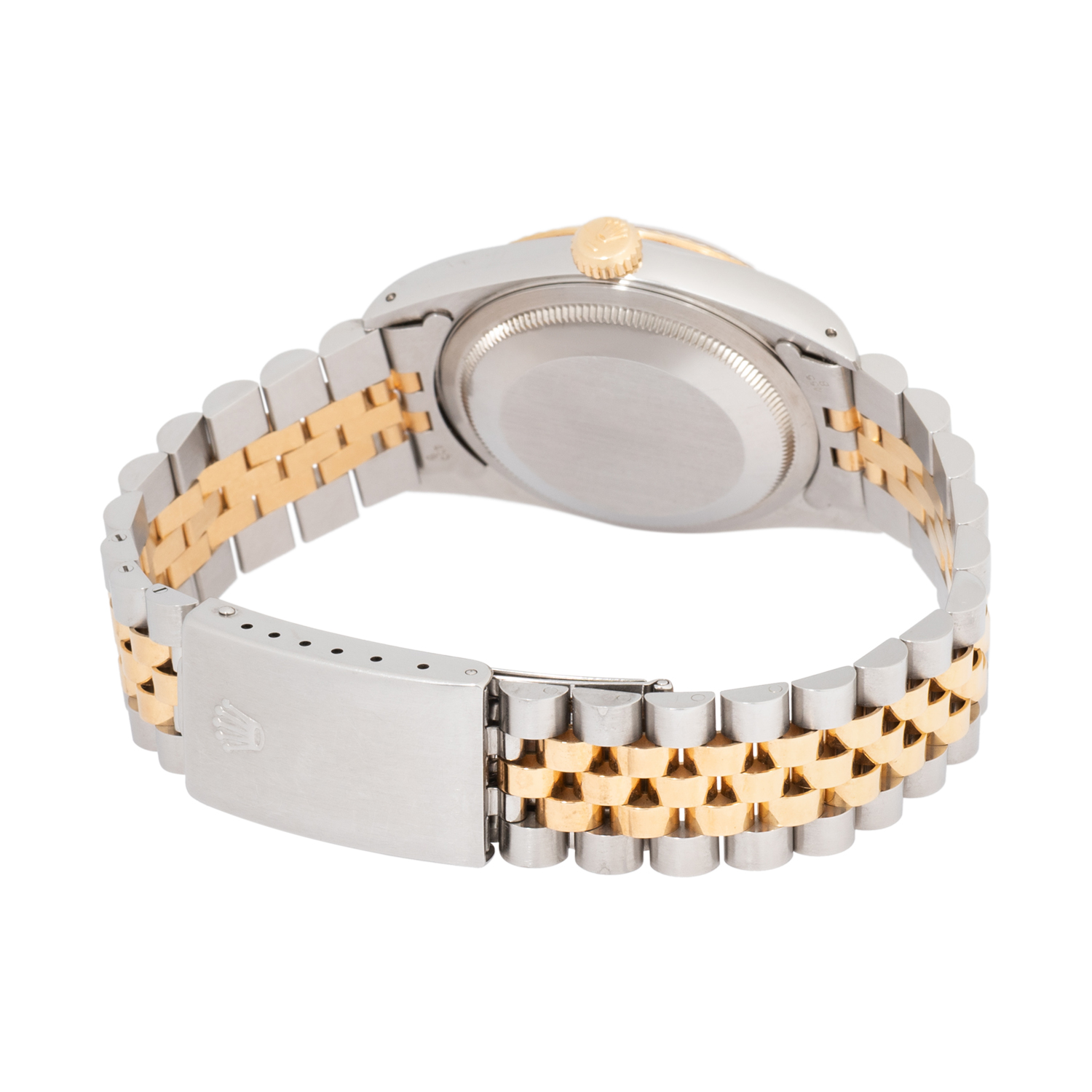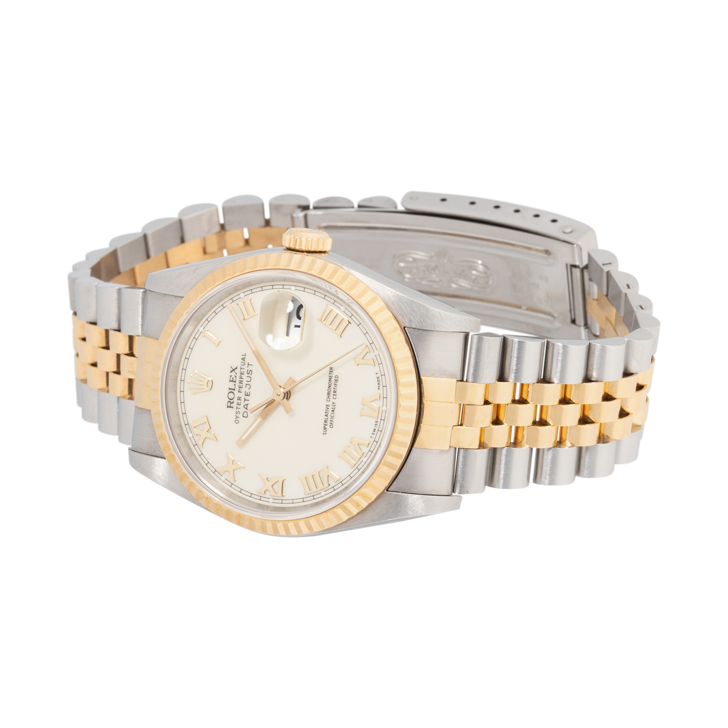 Edelstahl / Gelbgold 18K. Seriennummer L872135. Automatik-Werk Kal. 3135 mit sehr guten Gangwerten (+7 s/d. 279° Amplitude). Cremefarbenes Porzellan Tritium Zifferblatt mit aufgesetzten römischen Ziffern, Eisenbahnminuterie und Datumsanzeige. Geriffelte Lünette. Rolex Jubilee Armband (mit Stretch) aus Edelstahl / 18K Gelbgold mit Faltschließe. Guter Zustand mit Tragespuren. Rolex Box, Übersetzungsheft und Garantiezertifikat anbei. Gekauft im Dezember 1990 bei Juwelier Bartels in Ravensburg. Durchmesser ca. 36 mm (gemessen ohne Krone). Passend bis zu ca. 20 cm Handgelenkumfang.