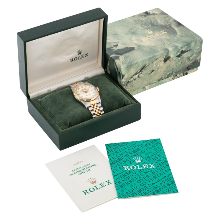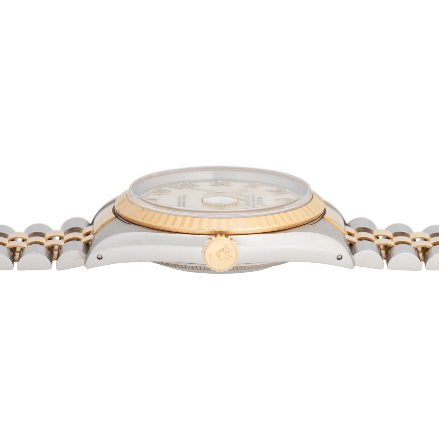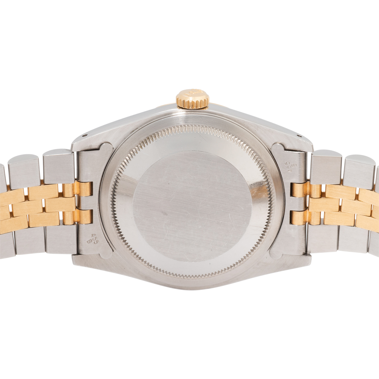 Edelstahl / Gelbgold 18K. Seriennummer L872135. Automatik-Werk Kal. 3135 mit sehr guten Gangwerten (+7 s/d. 279° Amplitude). Cremefarbenes Porzellan Tritium Zifferblatt mit aufgesetzten römischen Ziffern, Eisenbahnminuterie und Datumsanzeige. Geriffelte Lünette. Rolex Jubilee Armband (mit Stretch) aus Edelstahl / 18K Gelbgold mit Faltschließe. Guter Zustand mit Tragespuren. Rolex Box, Übersetzungsheft und Garantiezertifikat anbei. Gekauft im Dezember 1990 bei Juwelier Bartels in Ravensburg. Durchmesser ca. 36 mm (gemessen ohne Krone). Passend bis zu ca. 20 cm Handgelenkumfang.