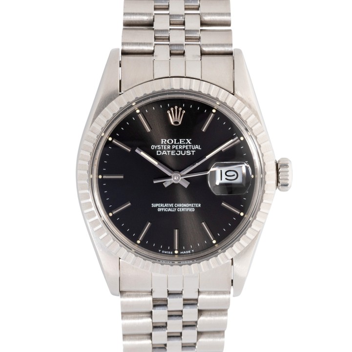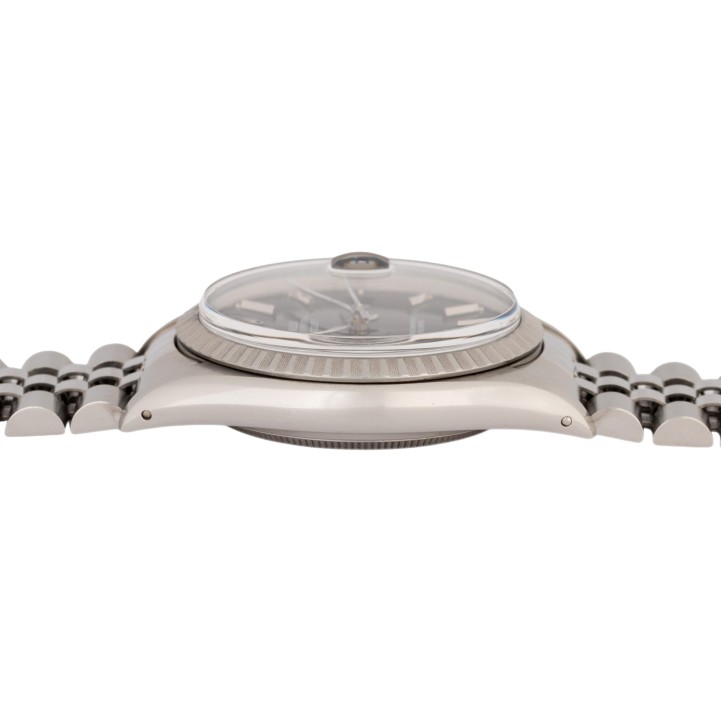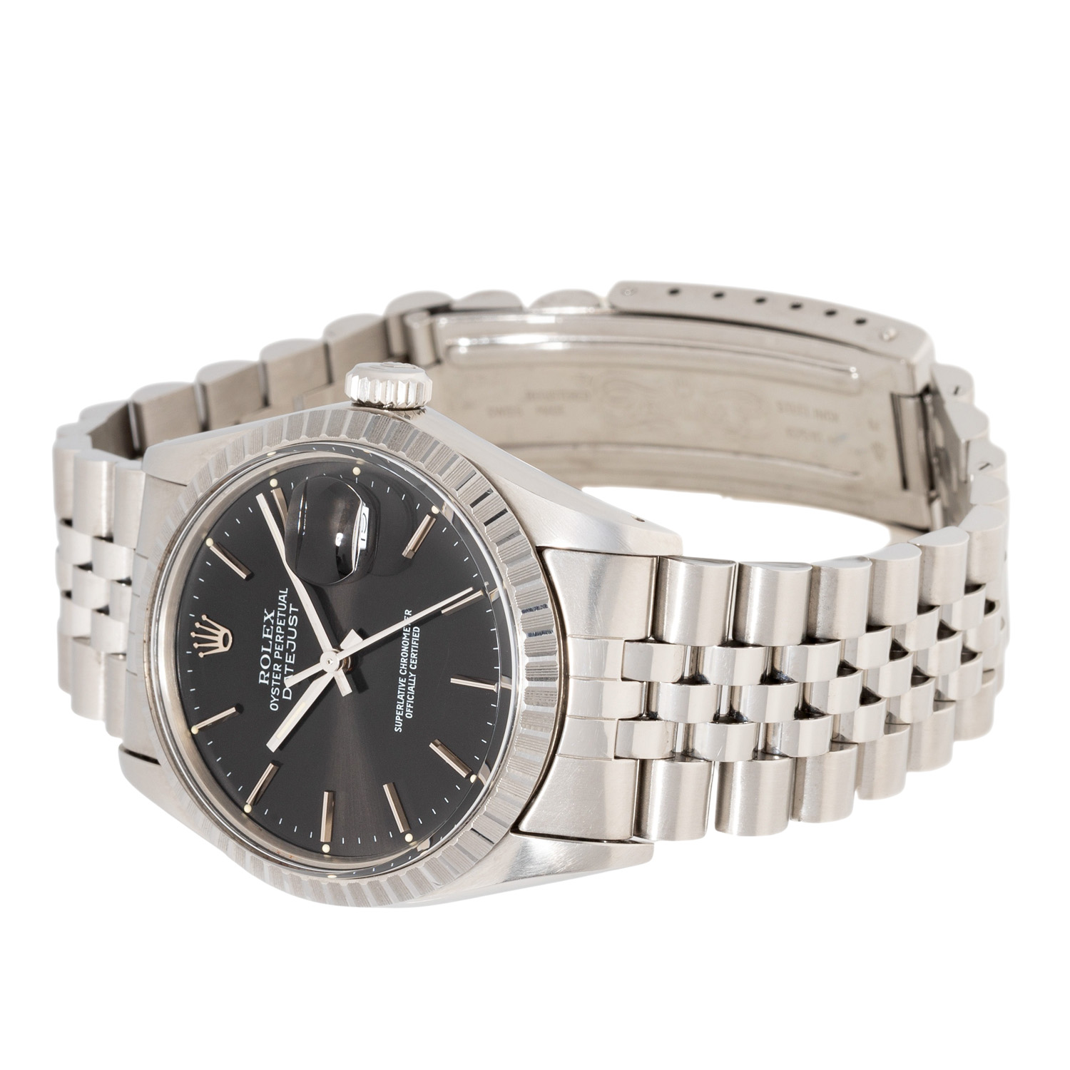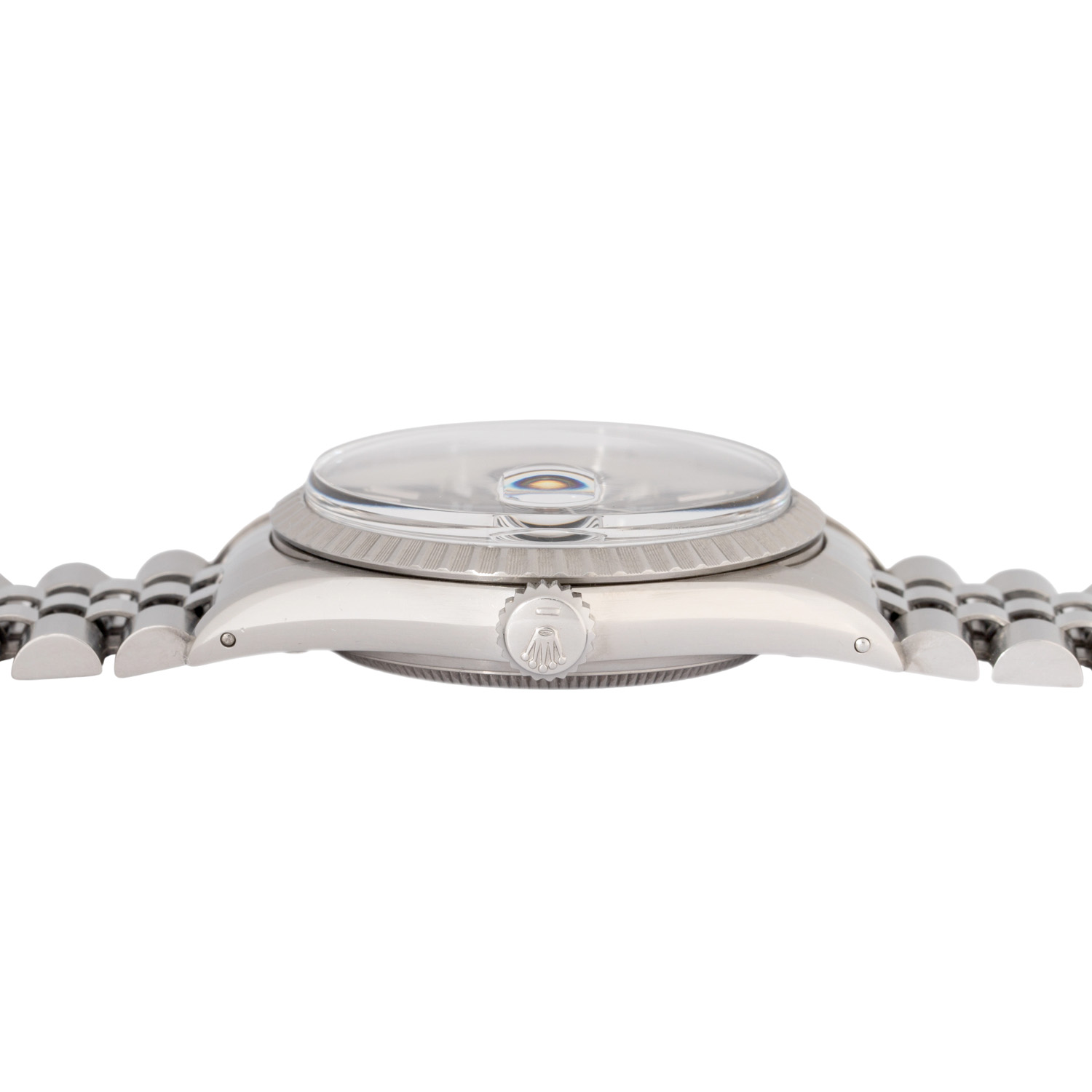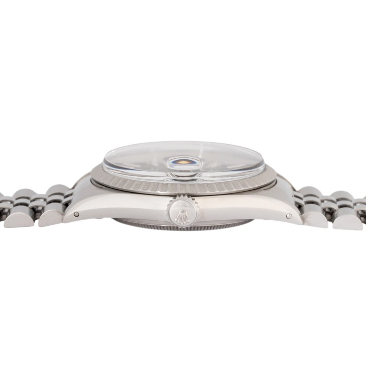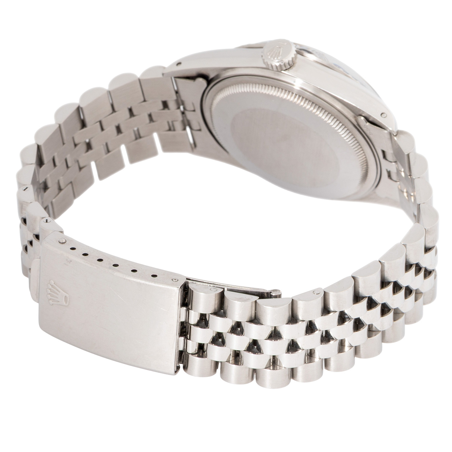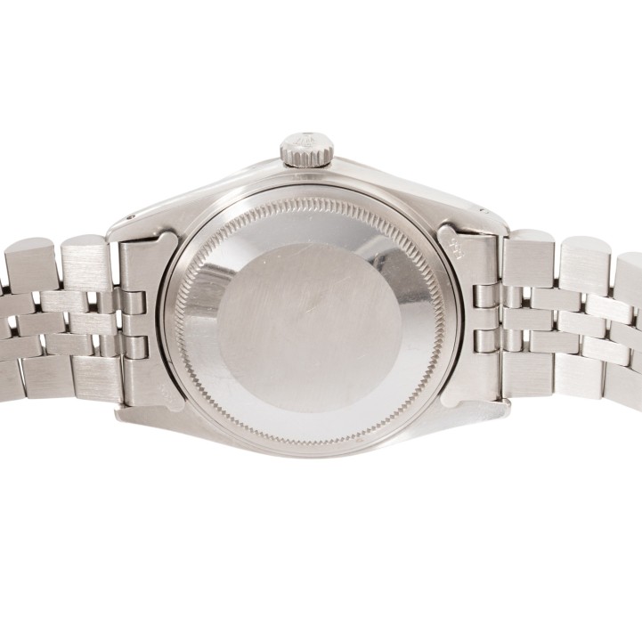 Edelstahl. Seriennummer R309047. Automatik-Werk Kal. 3035 mit sehr guten Gangwerten (+3 s/d. 273° Amplitude). Schwarzes Zifferblatt mit Stabindizes und open 6/9 Datumsanzeige. Geriffelte Lünette. Rolex Jubilee Armband (leichter Stretch) mit Faltschließe. Guter Zustand mit Tragespuren. Durchmesser ca. 36 mm (gemessen ohne Krone). Passend bis zu ca. 20 cm Handgelenkumfang.