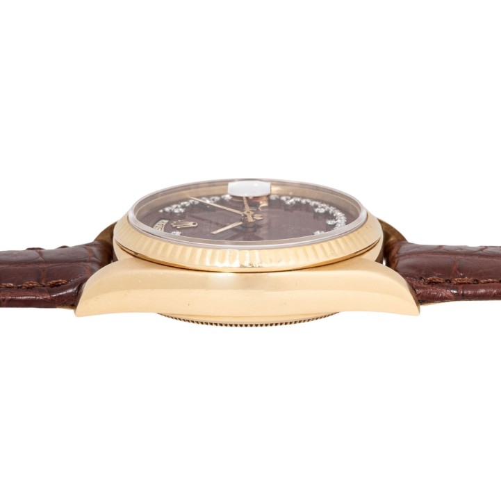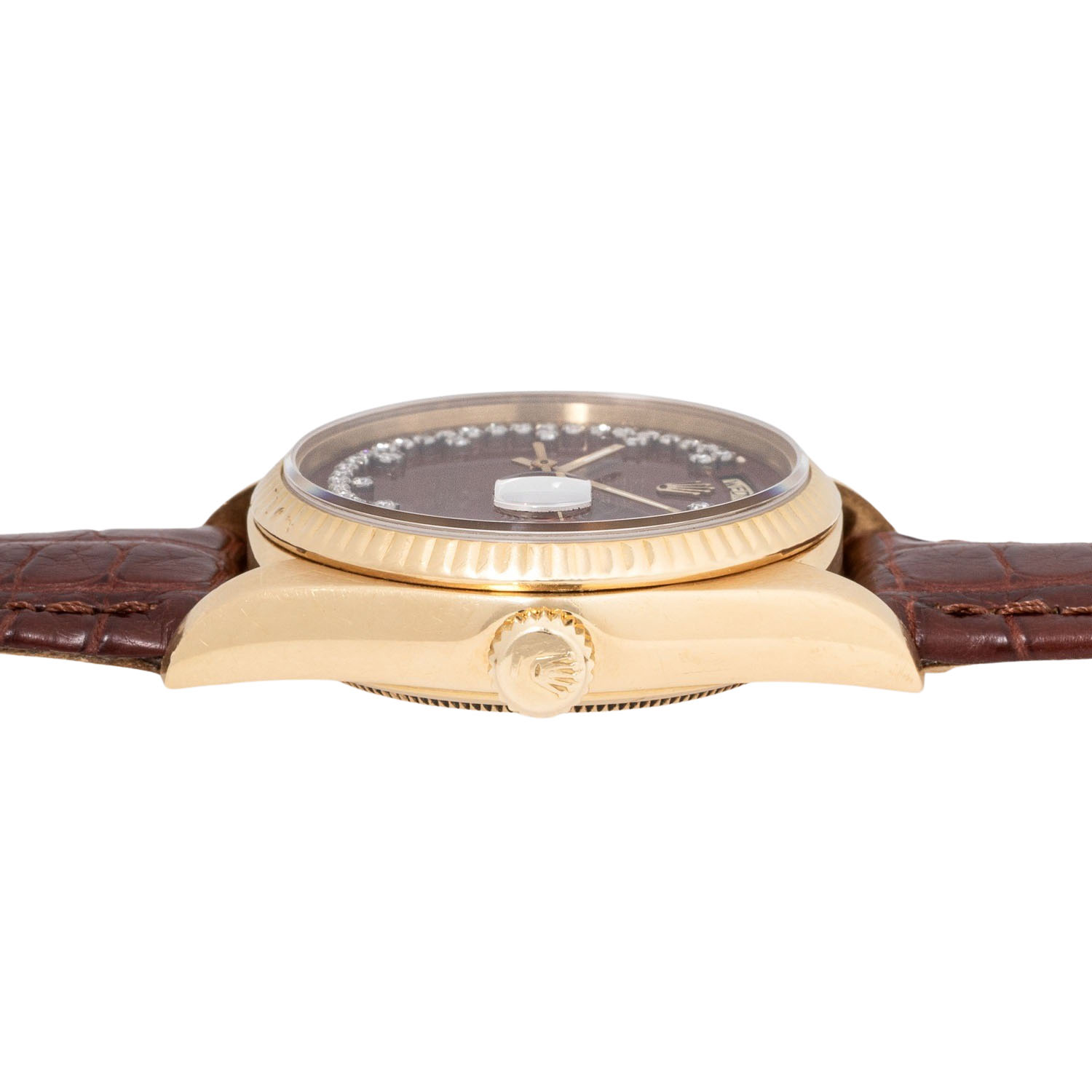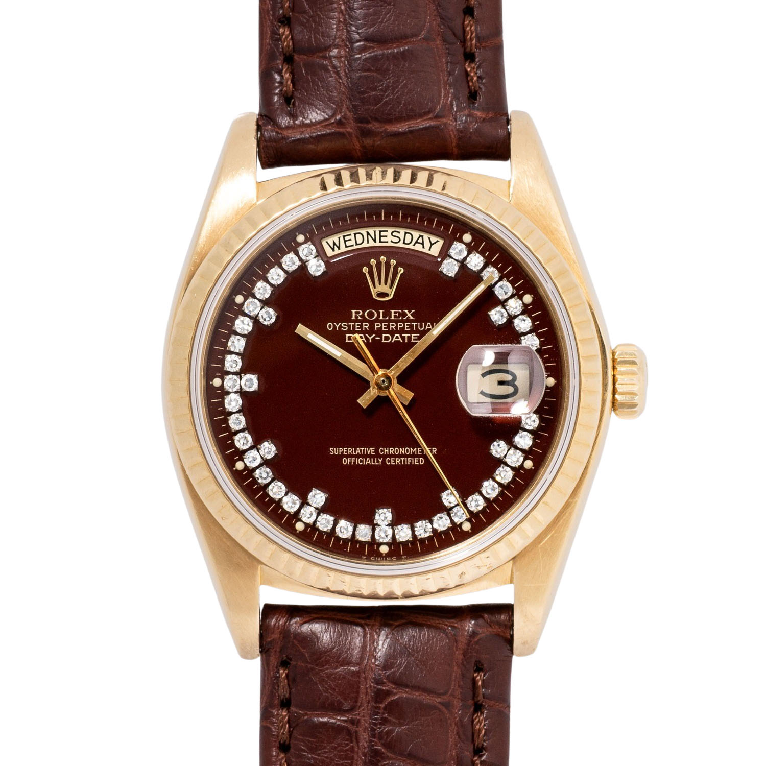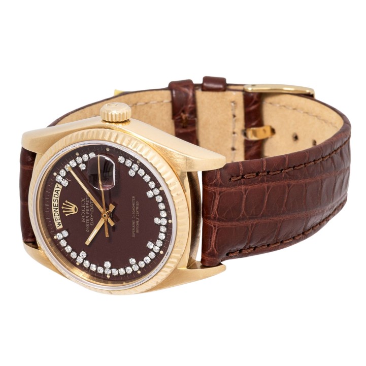 ROLEX Day-Date 36 mit seltenem 'Oxblood Stella Diamond String Dial' Ref 18038 Herrenuhr von ca. 1979.