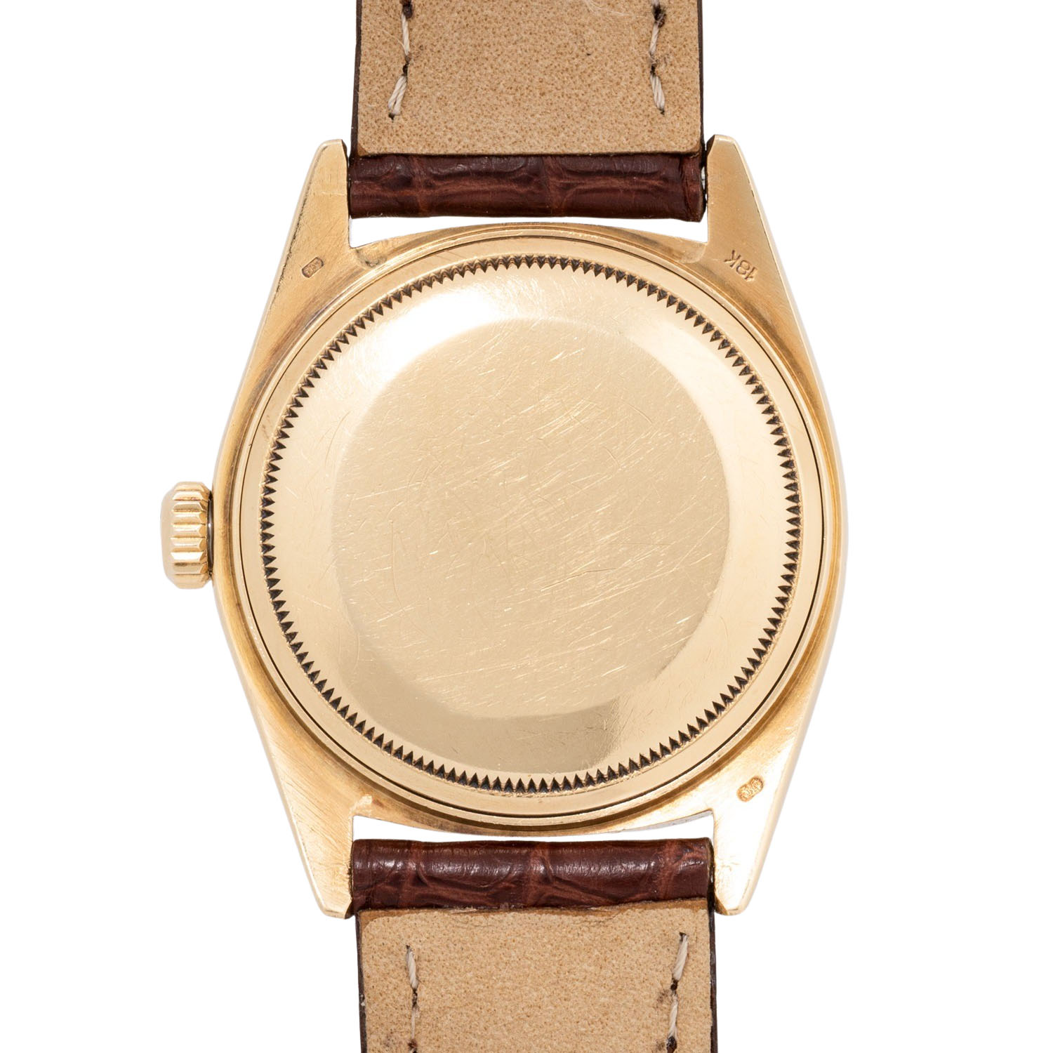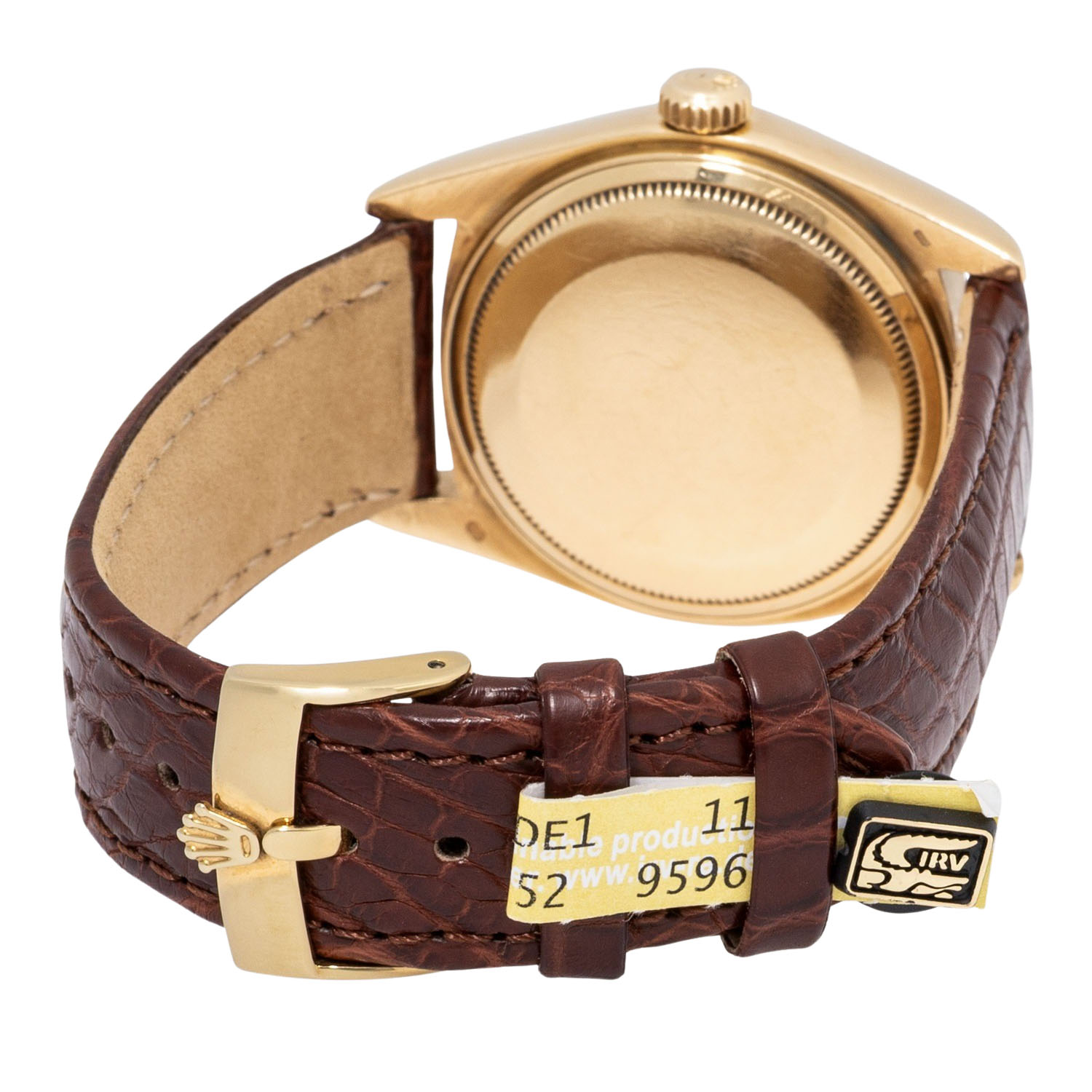 Gelbgold 18K. Seriennummer 5767632. Automatik-Werk Kal. 3035 mit sehr guten Gangwerten (0 s/d. 297° Amplitude). Seltenes Oxblood Stella Diamond String Tritium Zifferblatt mit 48 Diamanten und Anzeige von Wochentag und Datum. Geriffelte Lünette. Neues Lederband mit vergoldeter Rolex Dornschließe. Guter Zustand mit sichtbaren Tragespuren. Durchmesser ca. 36 mm (gemessen ohne Krone).