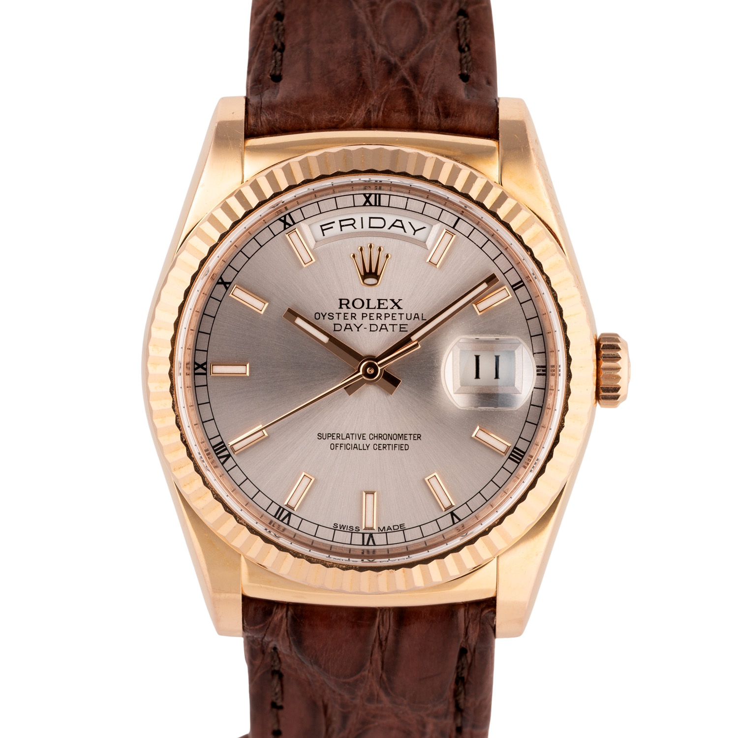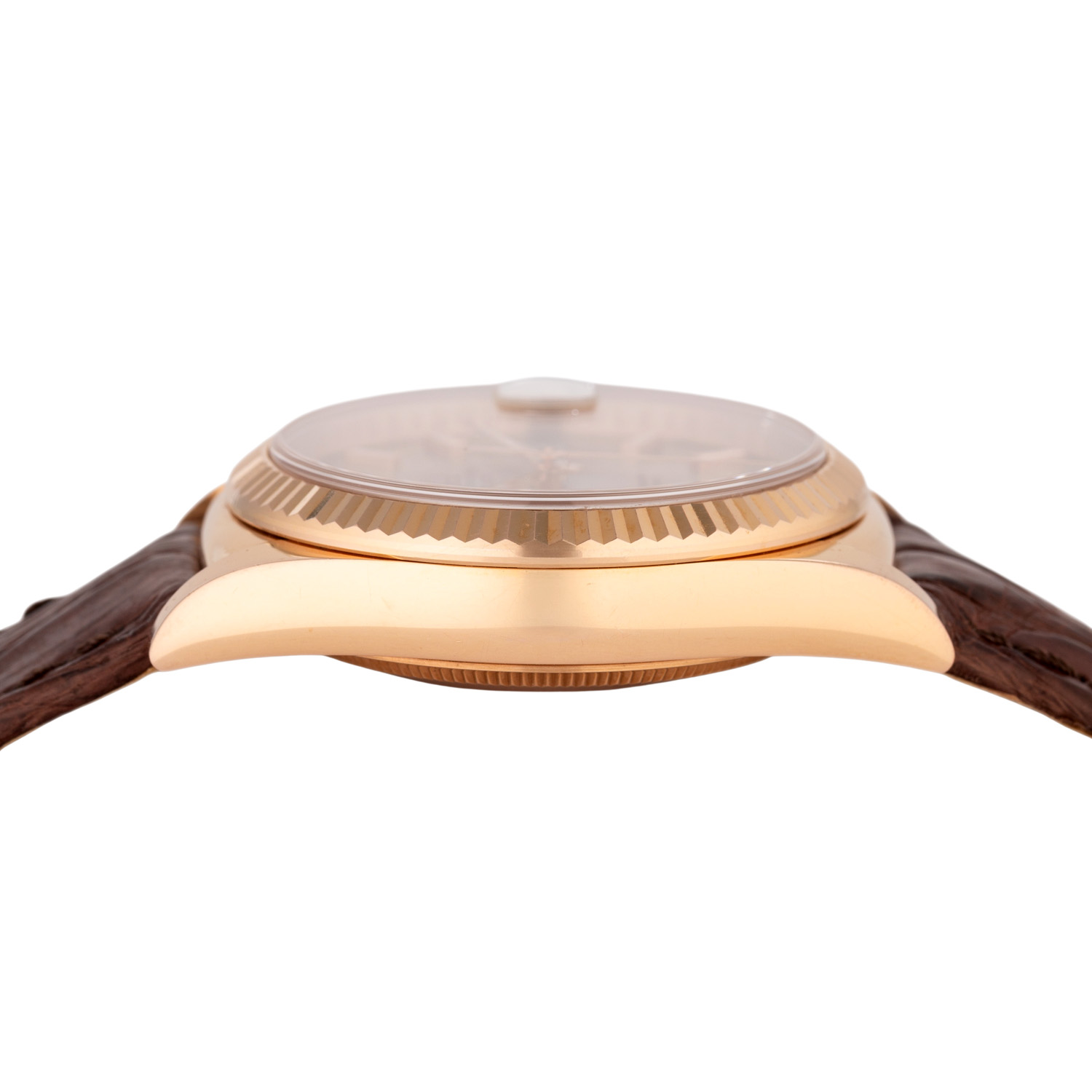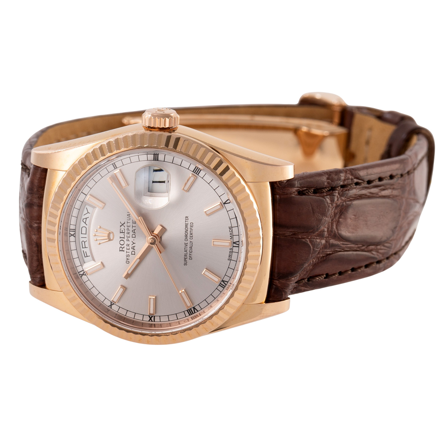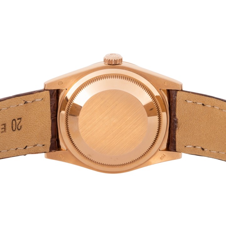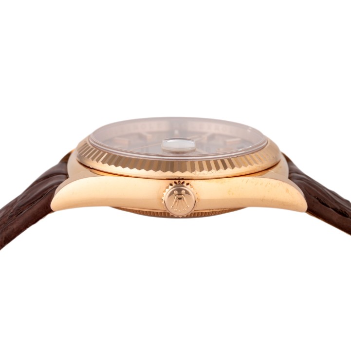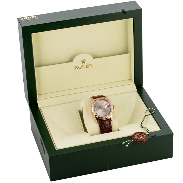 Rosegold 18K. Seriennummer 46M14019. Automatik-Werk Kal. 3155 mit sehr guten Gangwerten (+3 s/d. 266° Amplitude). Silberfarbenes Zifferblatt mit aufgesetzten Indizes, Eisenbahnminuterie mit römischen Ziffern, Anzeige Wochentag und Datumsanzeige. Geriffelte Lünette. Neues Lederband mit der originalen Rolex Faltschließe aus 18K Rosegold. Guter Zustand mit Tragespuren. Original Box und Hang Tag anbei. Durchmesser ca. 36 mm (gemessen ohne Krone). Passend bis zu ca. 20 cm Handgelenkumfang.