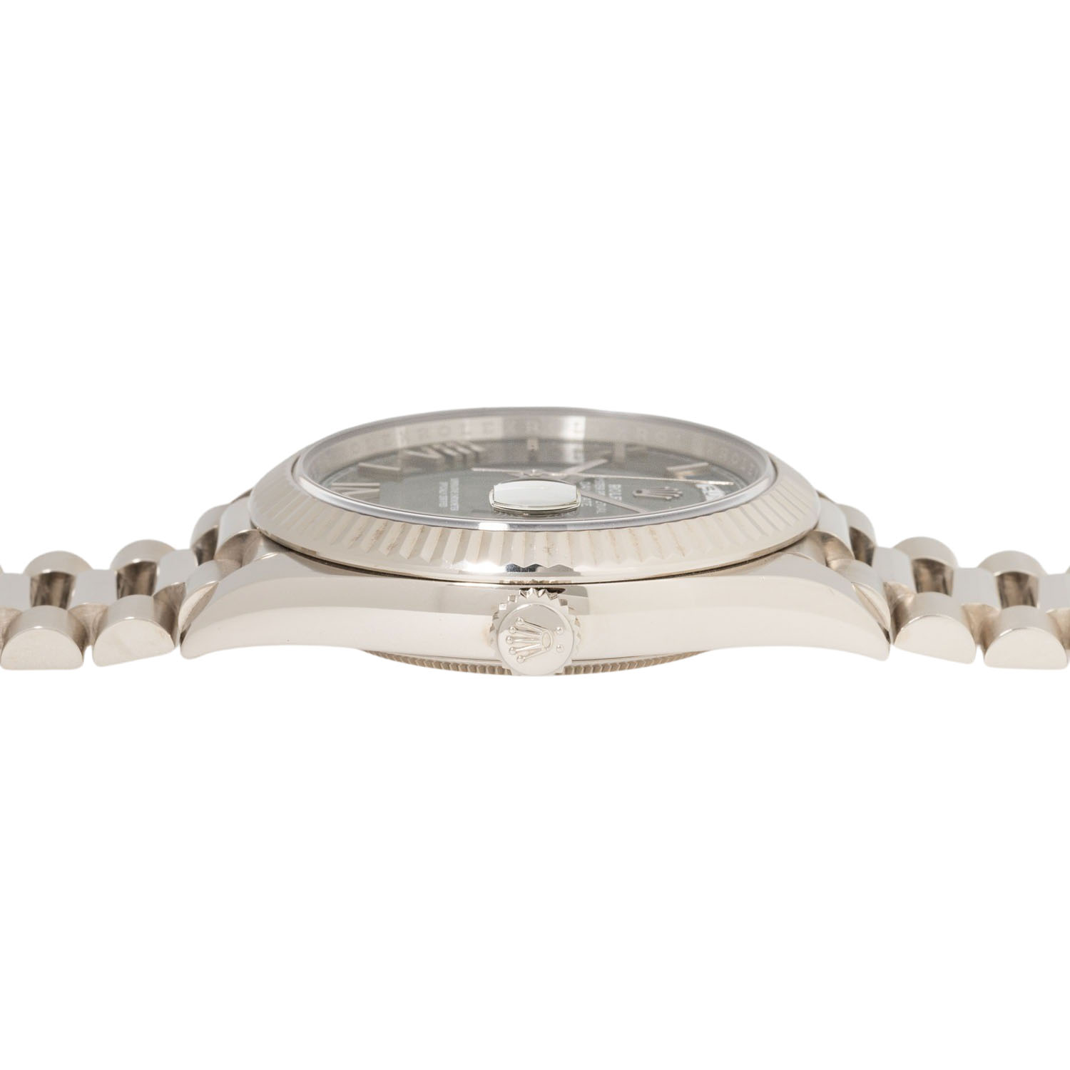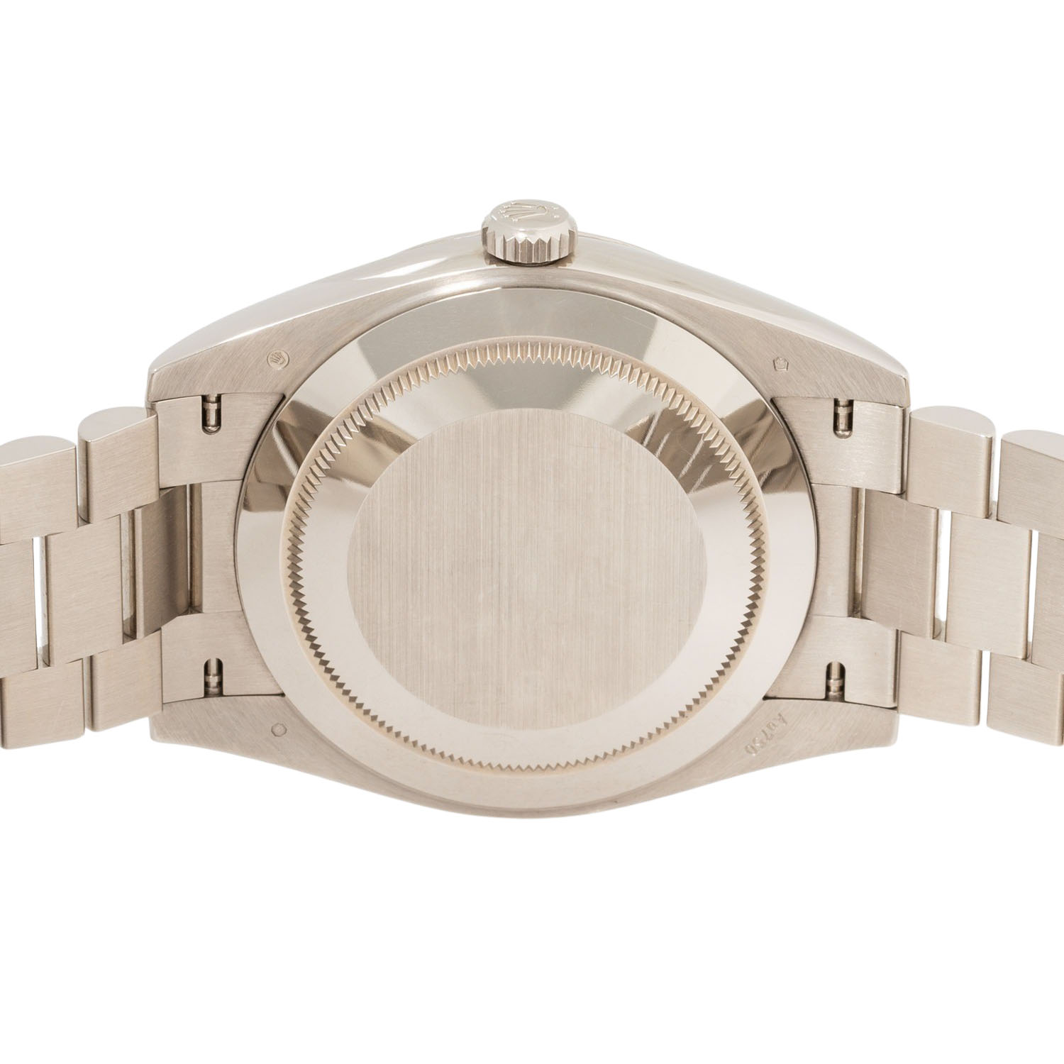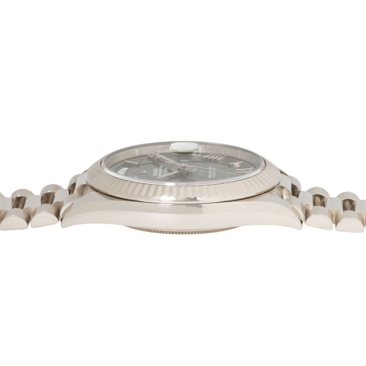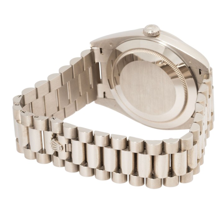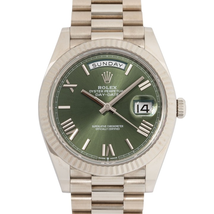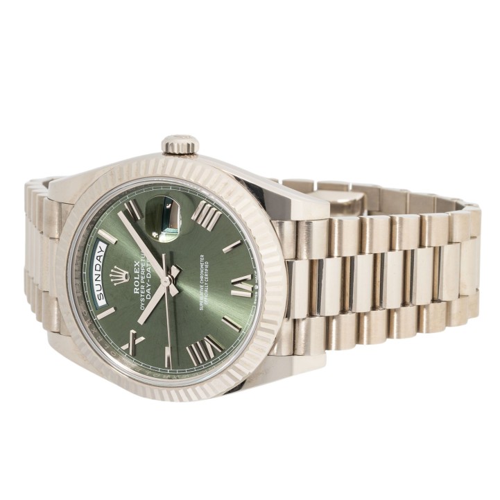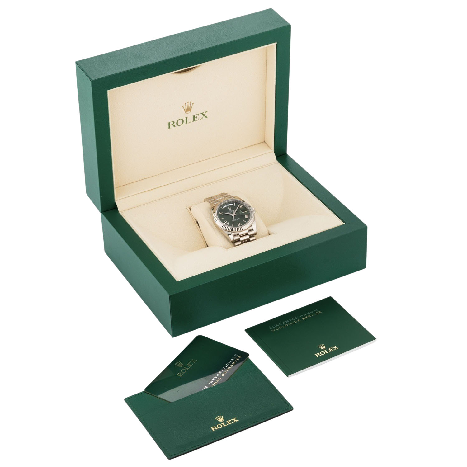 Weißgold 18K. Seriennummer 0AH55678. Automatik-Werk Kal. 3255 mit sehr guten Gangwerten (+4 s/d. 273° Amplitude). Olivgrünes Zifferblatt (Sonnenschliff) mit aufgesetzten römischen Ziffern, Eisenbahnminuterie und Anzeige von Wochentag (Englisch) und Datum. Geriffelte Lünette. Rolex President Armband aus 18K Weißgold mit Faltschließe. Guter Zustand mit Tragespuren. Original Box, Card Folder, Garantieheft und Garantiekarte vom Kauf im Oktober 2022 anbei. Durchmesser ca. 40 mm (gemessen ohne Krone). Passend bis zu ca. 19 cm Handgelenkumfang.