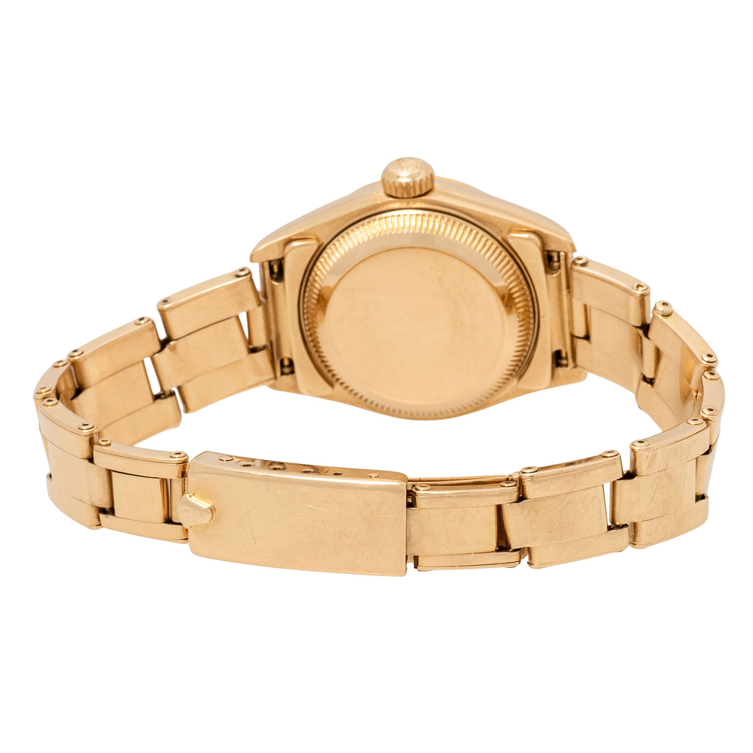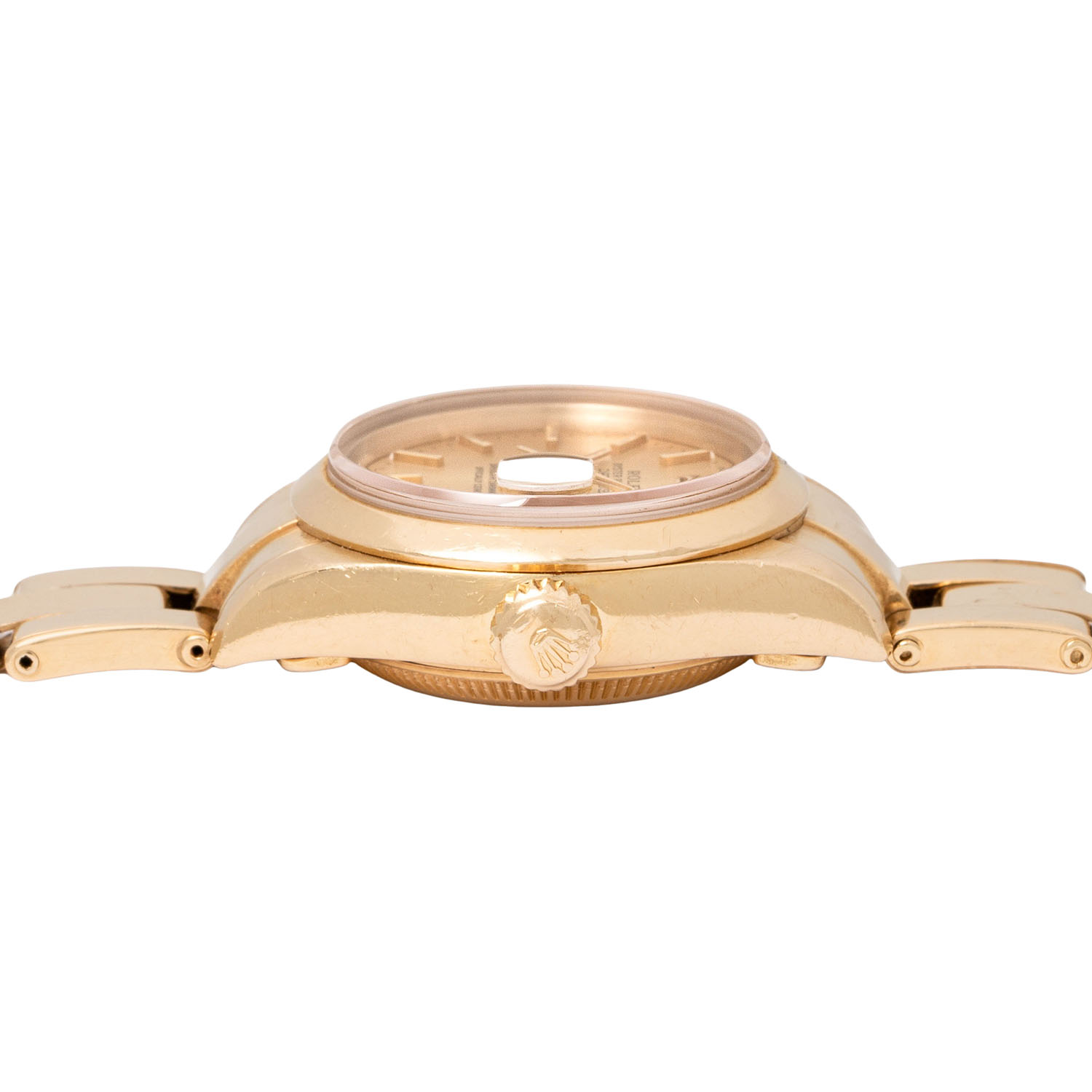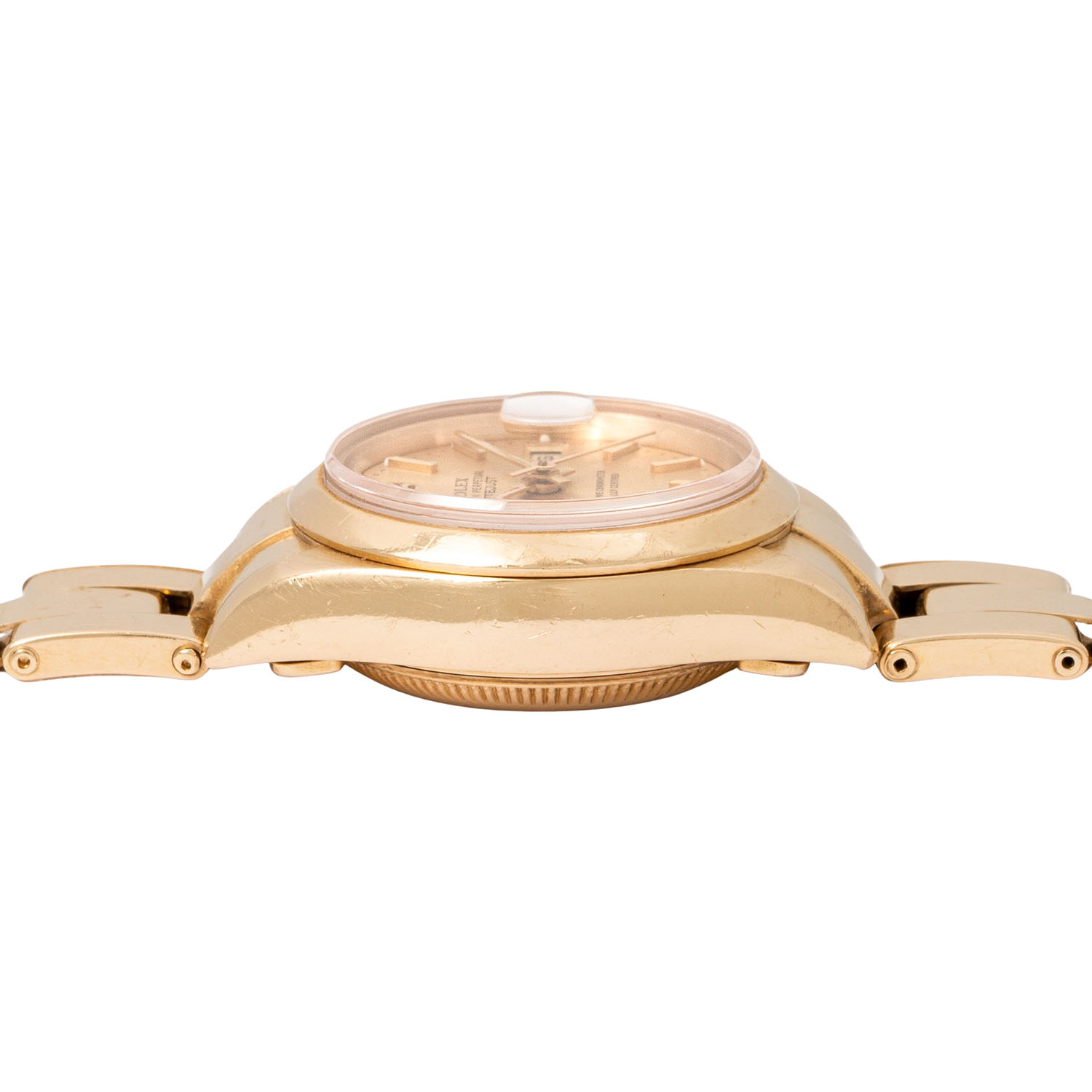 18K Gelbgold. Automatik-Werk Kal. 2135 mit sehr guten Gangwerten (+3s/d, 260°). Goldfarbenes Tritium Zifferblatt mit Stabindizes und open 6/9 Datumsanzeige. Rolex Oyster Armband (mit Stretch) in 18K Gelbgold mit Faltschließe. Guter Zustand mit sichtbarenTragespuren. Original Box (ohne Kissen) und Garantieschein anbei. Gekauft im November 1992 bei Juwelier Wempe in Stuttgart. Durchmesser ca. 26 mm ohne Krone, passend für ca. 16,5 cm Handgelenkumfang.