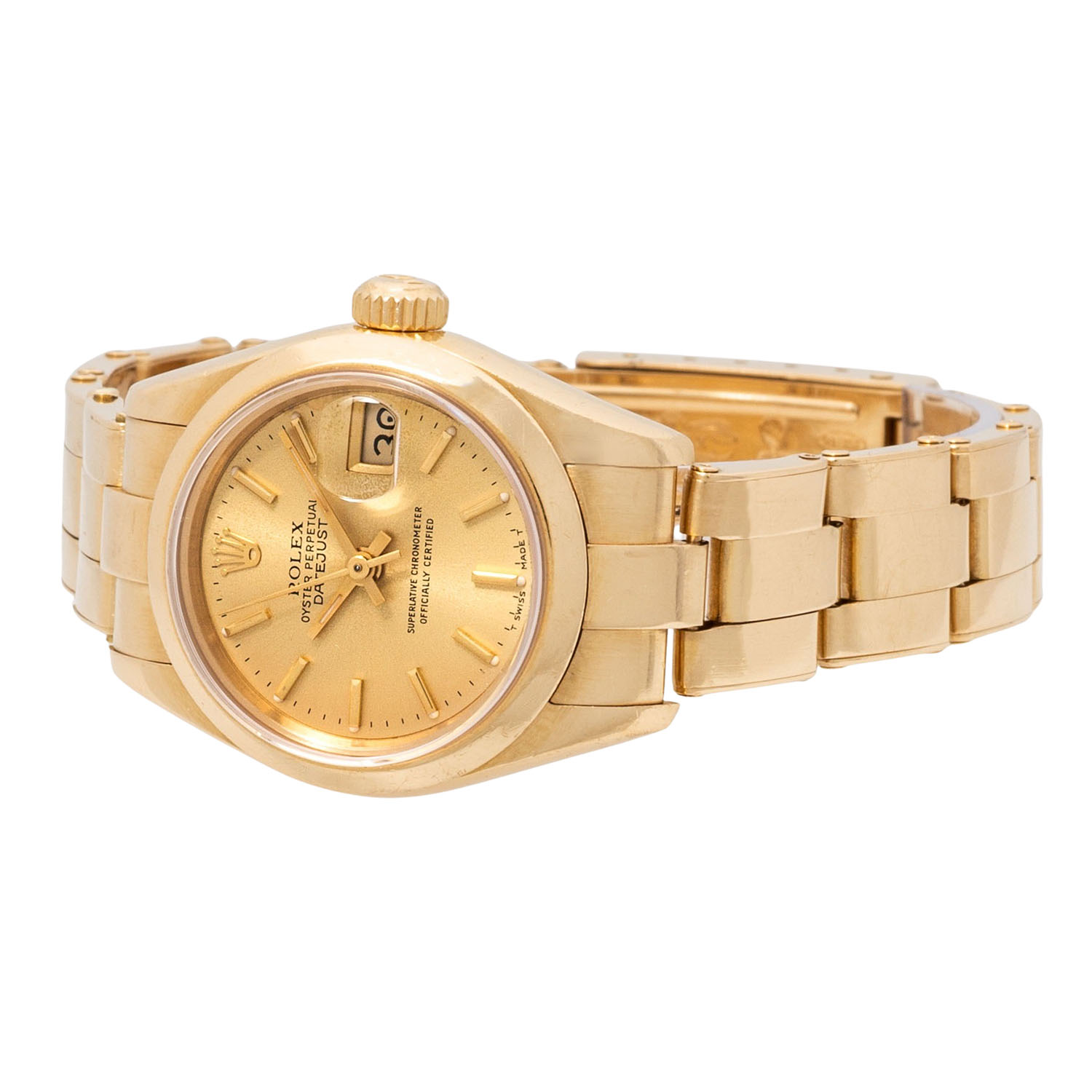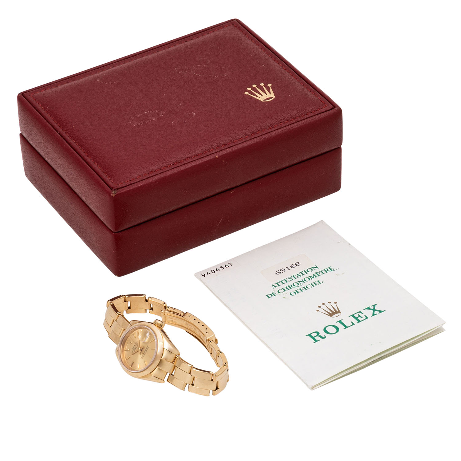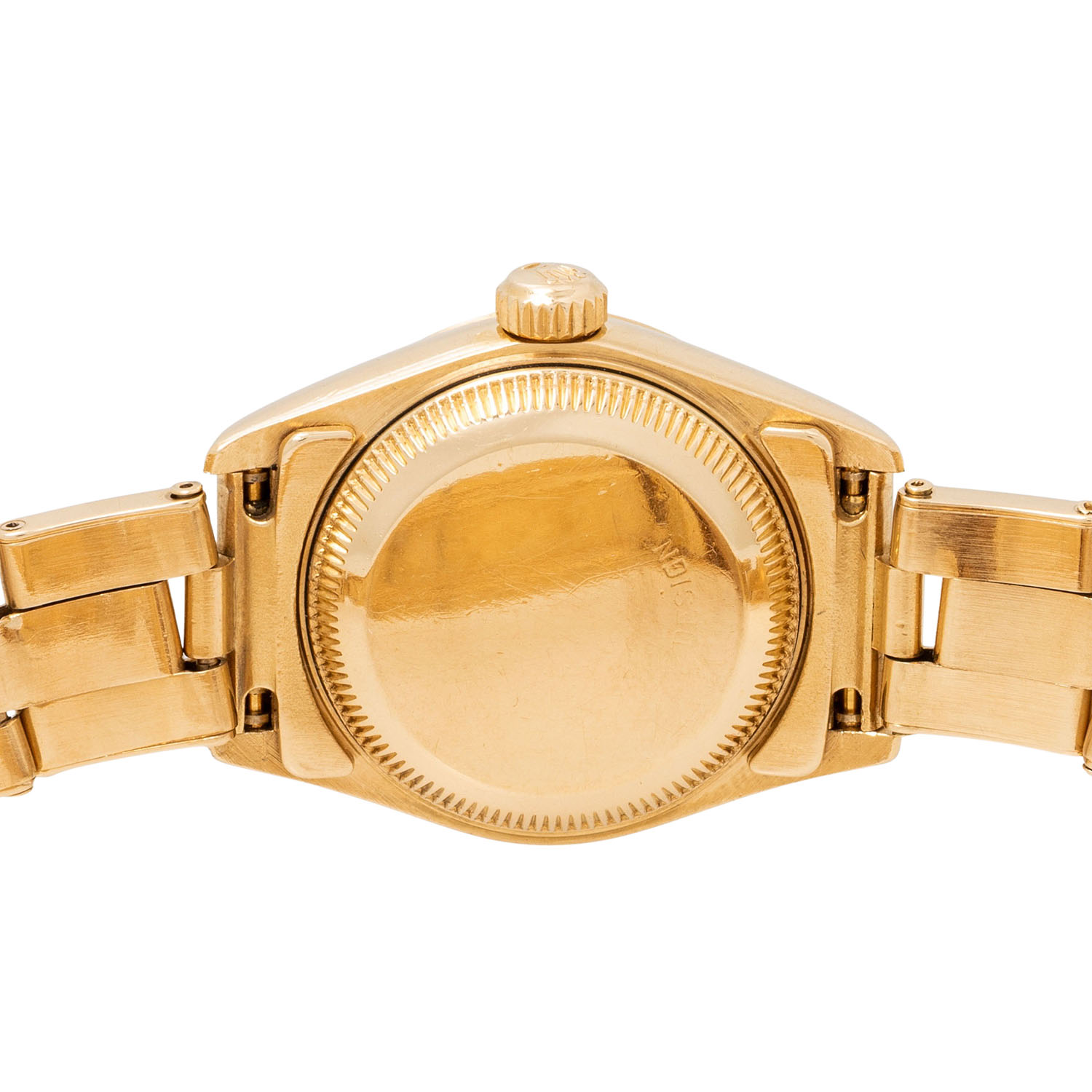 18K Gelbgold. Automatik-Werk Kal. 2135 mit sehr guten Gangwerten (+3s/d, 260°). Goldfarbenes Tritium Zifferblatt mit Stabindizes und open 6/9 Datumsanzeige. Rolex Oyster Armband (mit Stretch) in 18K Gelbgold mit Faltschließe. Guter Zustand mit sichtbarenTragespuren. Original Box (ohne Kissen) und Garantieschein anbei. Gekauft im November 1992 bei Juwelier Wempe in Stuttgart. Durchmesser ca. 26 mm ohne Krone, passend für ca. 16,5 cm Handgelenkumfang.