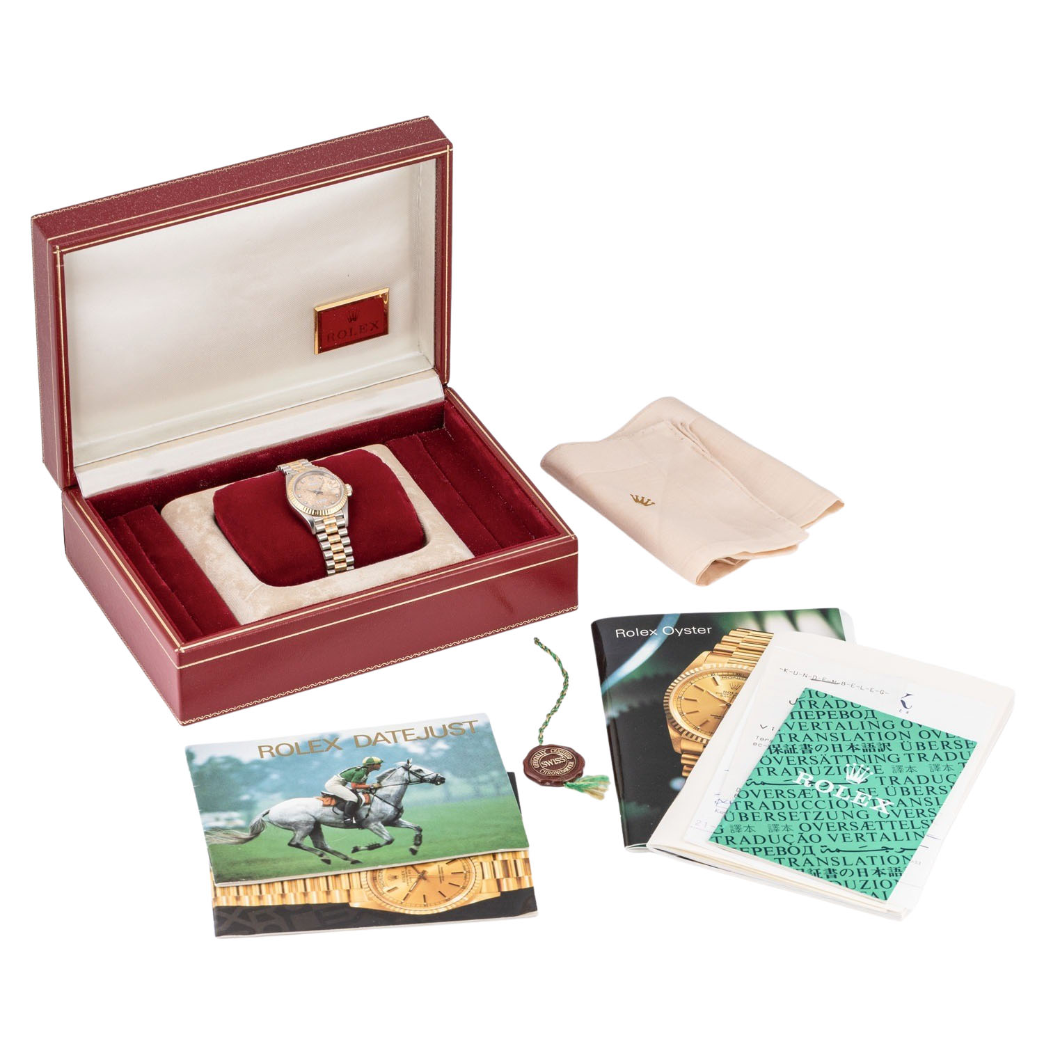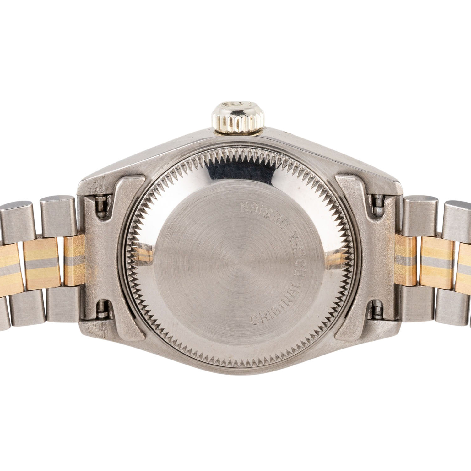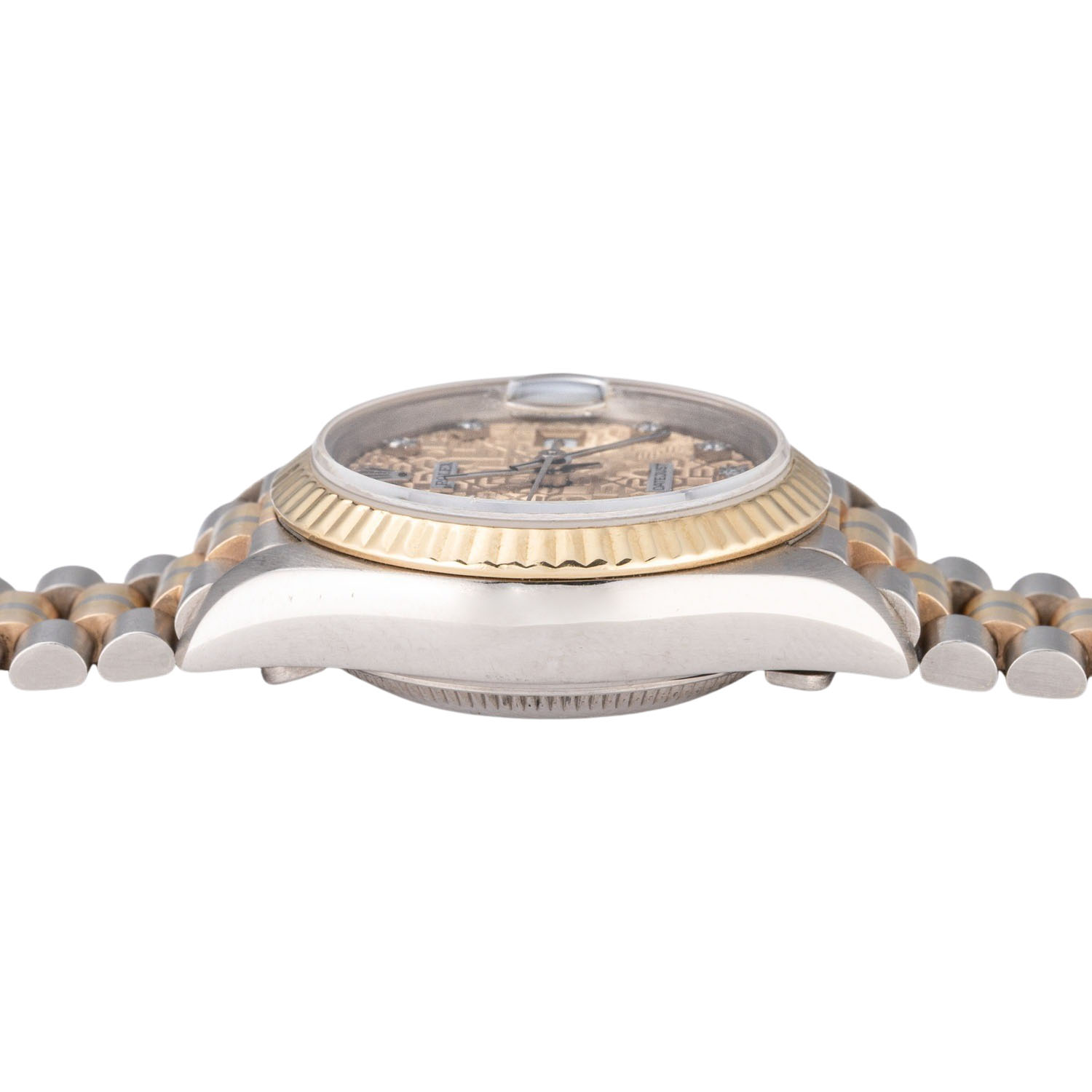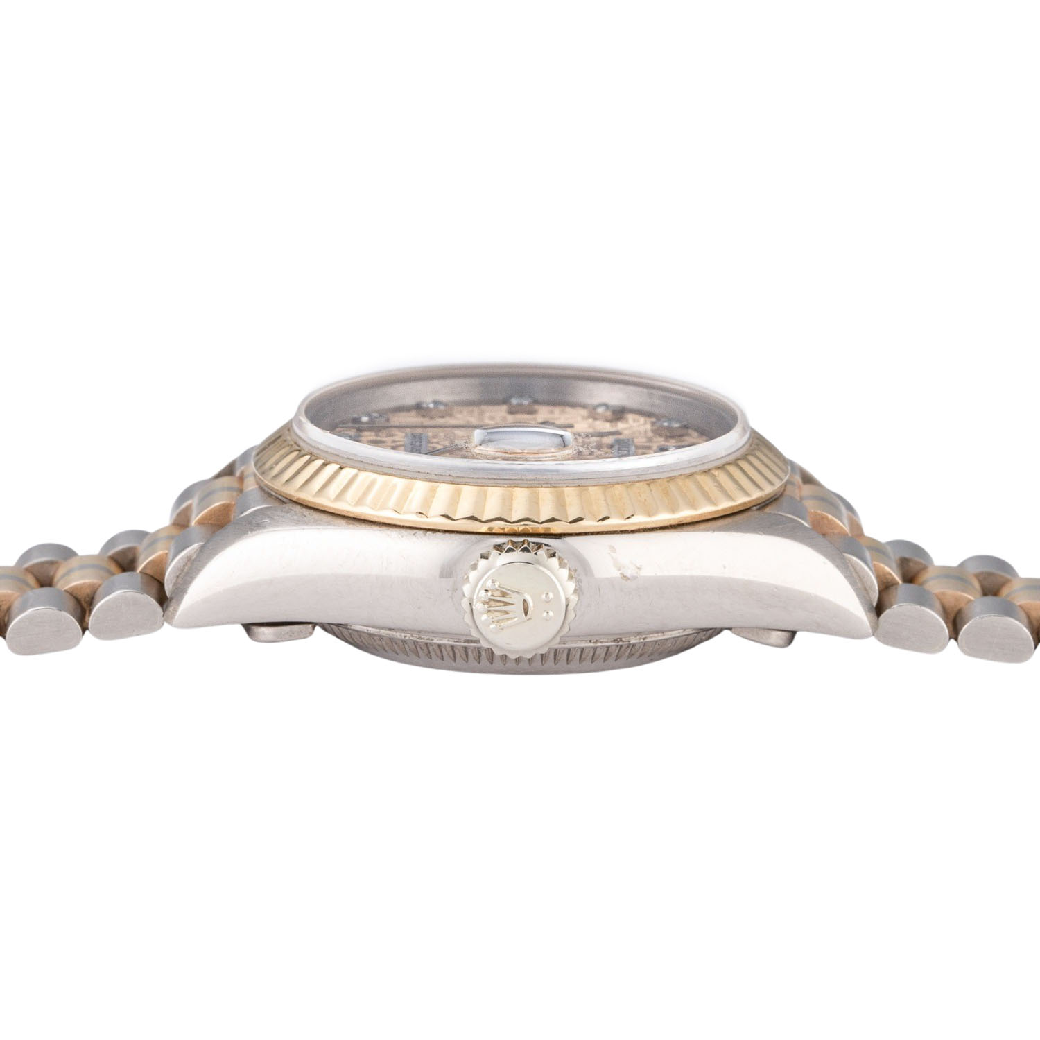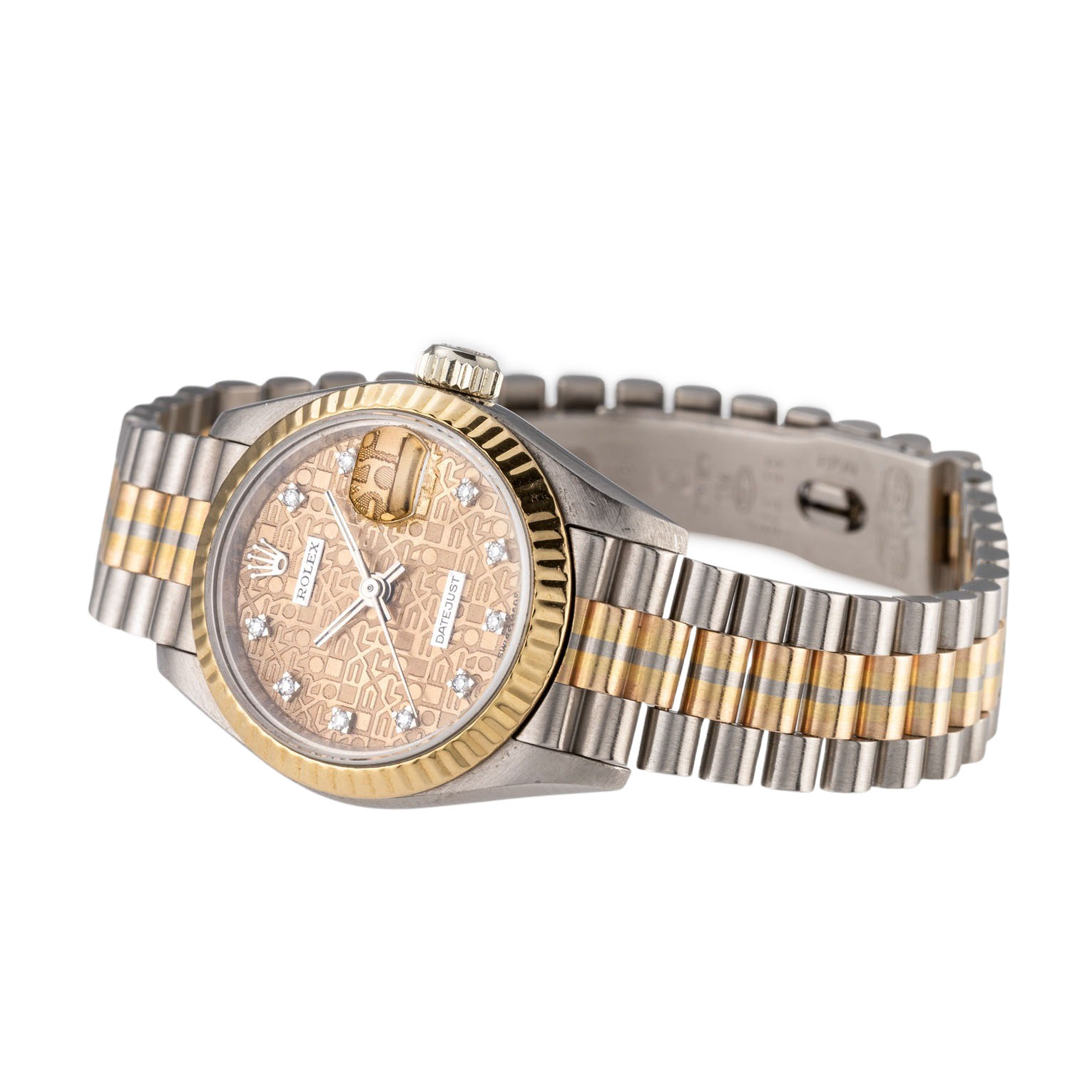 Weißgold 18K Gehäuse. Seriennummer L778161. Automatik-Werk Kal. 2135 mit sehr guten Gangwerten (+1 s/d. 277° Amplitude). Goldfarbenes Jubilee Zifferblat mit Diamanten Indizes und Datumsanzeige. Geriffelte Lünette aus 18K Gelbgold. Rolex Armband (mit Stretch) in 18K Weiß-Gelb-Rosegold mit Faltschließe. Guter Zustand mit sichtbaren Tragespuren am Gehäuse, Lünette und Armband. Original Box, 2 Anleitungen, 2 Rolex Kataloge mit Preisliste, Hangtag, Revisionsnachweis von 2008 (inkl. Tauschteile), Übersetzungsheft und Rolex Tuch anbei. Durchmesser ca. 26 mm (gemessen ohne Krone). Passend bis zu ca. 17 cm Handgelenkumfang.