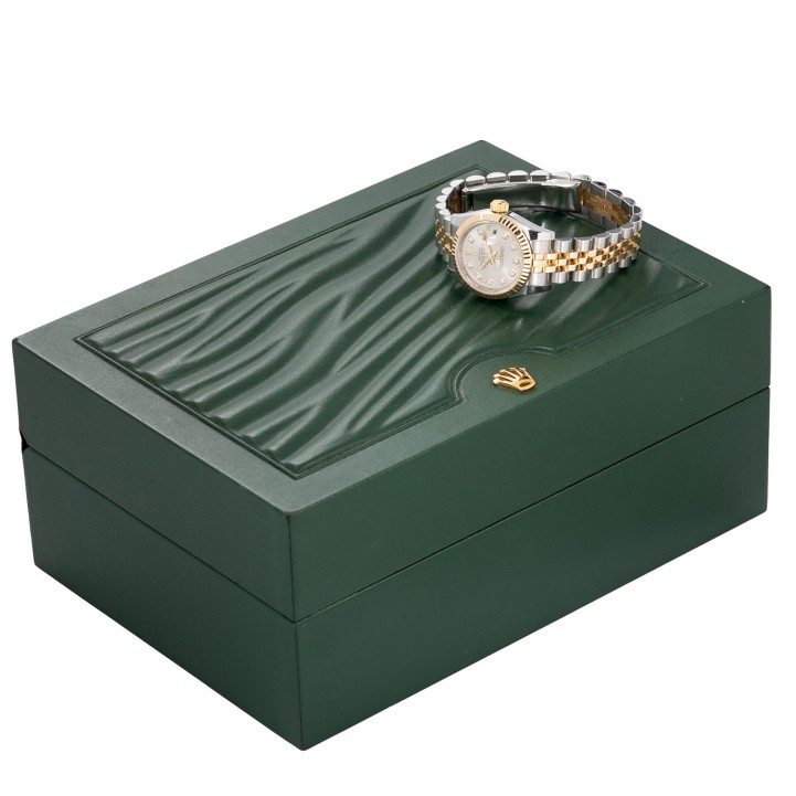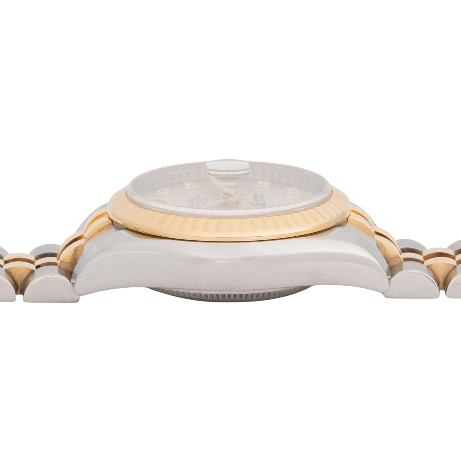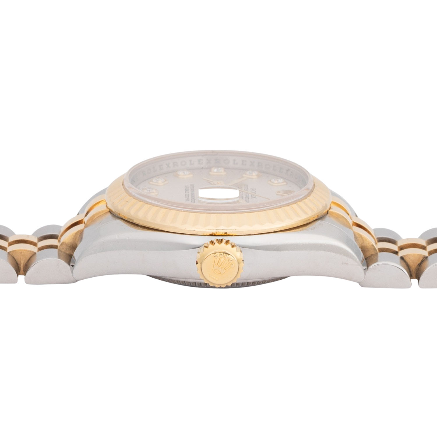 Edelstahl / Gelbgold 18K. Seriennummer Z271328. Automatik-Werk Kal. 2235 mit guten Gangwerten (+7 s/d. 231° Amplitude). Silberfarbenes Zifferblatt mit Diamanten Indizes und Datumsanzeige. Geriffelte Lünette. Rolex Jubilee Armband (leichter Stretch) in Edelstahl / 18K Gelbgold mit Faltschließe. Guter Zustand mit Tragespuren. Original Box anbei. Durchmesser ca. 26 mm (gemessen ohne Krone). Passend bis zu ca. 16,5 cm Handgelenkumfang.