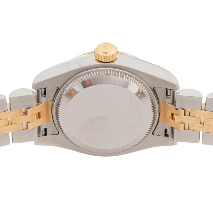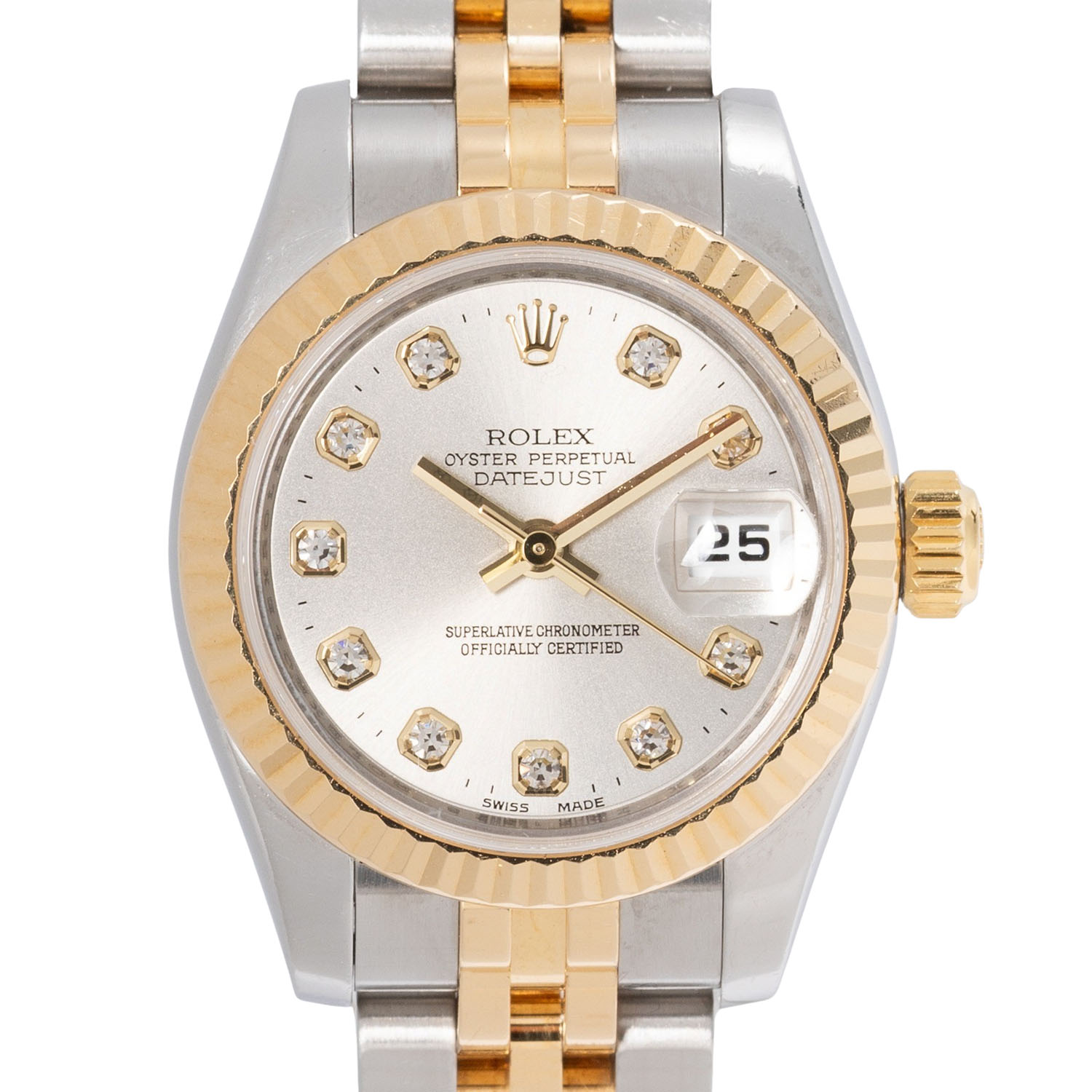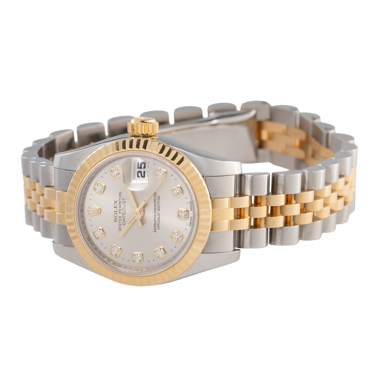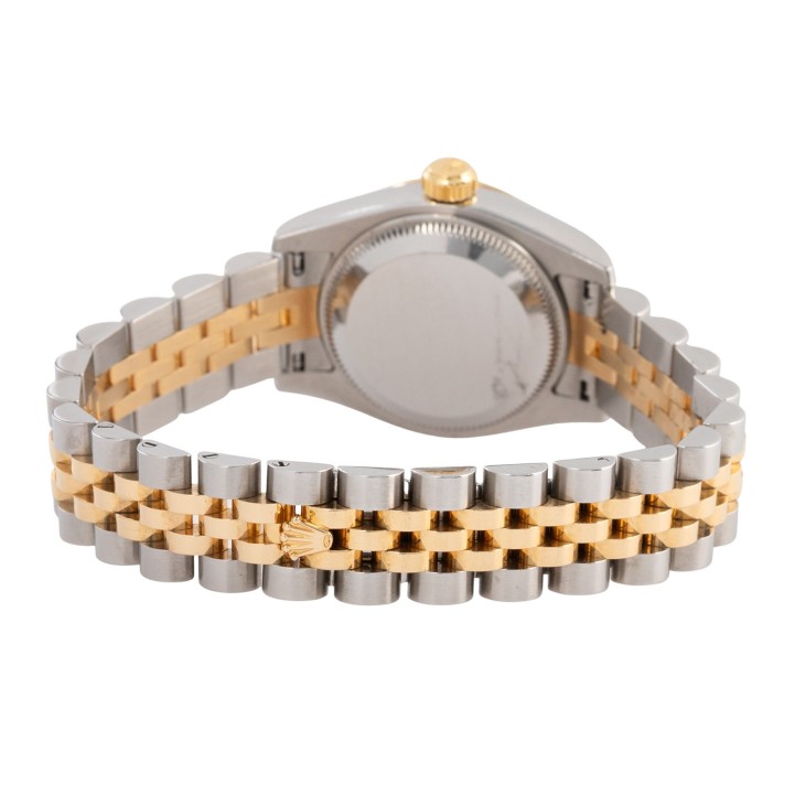Edelstahl / Gelbgold 18K. Seriennummer Z271328. Automatik-Werk Kal. 2235 mit guten Gangwerten (+7 s/d. 231° Amplitude). Silberfarbenes Zifferblatt mit Diamanten Indizes und Datumsanzeige. Geriffelte Lünette. Rolex Jubilee Armband (leichter Stretch) in Edelstahl / 18K Gelbgold mit Faltschließe. Guter Zustand mit Tragespuren. Original Box anbei. Durchmesser ca. 26 mm (gemessen ohne Krone). Passend bis zu ca. 16,5 cm Handgelenkumfang.