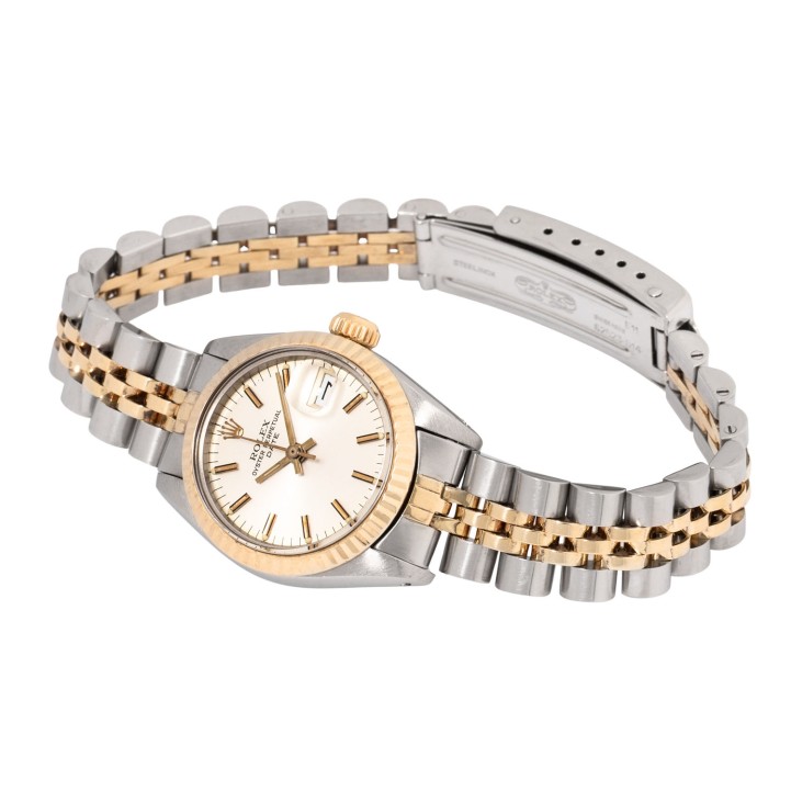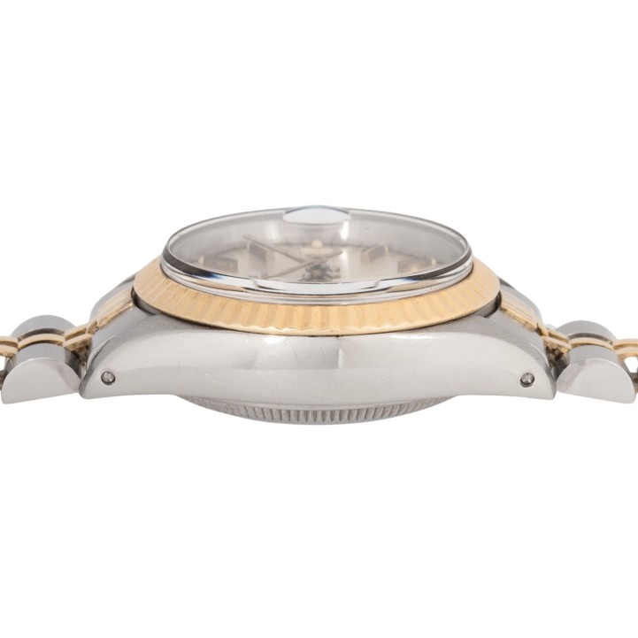 Edelstahl / Gelbgold 18K. Automatik-Werk Kal. 2030 mit sehr guten Gangwerten (+1 s/d. 282° Amplitude). Neue Revision (09/2025). Silberfarbenes Tritium Zifferblatt mit Stabindizes und Datumsanzeige. Geriffelte Lünette. Rolex Jubilee Armband (mit starkem Stretch) mit Faltschließe. Guter Zustand mit Tragespuren. Rolex Box und Revisionsnachweis von anbei. Durchmesser ca. 26 mm (gemessen ohne Krone). Passend bis zu ca. 18 cm Handgelenkumfang.